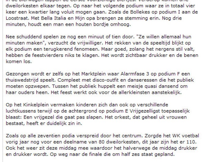 De dag begon wat onzeker na 2 zware nachten op de dweilcamping, maar gelukkig groeide ons niveau in gelijke tred met de hoeveelheid publiek! Na ons 3e optreden op de Markt stond bij ons allemaal het kippenvel op de armen van het enthousiasme dat het massaal toegestroomde publiek liet zien. Wat een vet gevoel was dat!