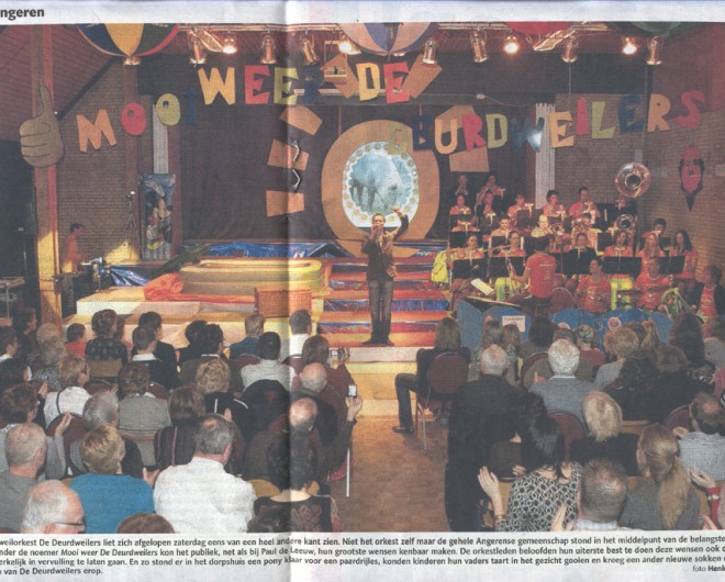 Angeren – In de voorbijgaande maanden maakten de bewoners van Angeren niet alleen hun nominaties kenbaar voor de Gouden Duim, ook vroeg Dweilorkest de Deurdweilers aan alle Angerenaren om hun grootste wensen kenbaar te maken. Het orkest had het plan opgevat om een avond te organiseren zoals die van Paul de Leeuw, onder de noemer “Mooi weer De Deurdweilers
