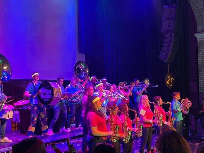 Tussen al dat gezweet door moest er ook nog opgetreden worden. Geholpen door wat Feintsjes werd het een lekker zweterig optreden: