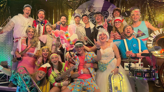Het grote AF3 extravaganza discofeest! Leg je handdoekje en eiwit-shake maar vast klaar, want op zaterdagavond 4 november viert dweilorkest Alarmfase 3 haar 25e verjaardag. De fitte goden en godinnen van deze muzikale formatie kunnen niet wachten om dit glorieuze hoogtepunt met jou te vieren. Je bent uitgenodigd voor een dampend feestje in de Theaterkerk. Denk: zieke dansmoves, lekkere trainingspakken en verrassende shows (met een gastoptreden van de Sweaty Discoboys). Nog geen energie? Even een schepje eiwitpoeder erbij dan!