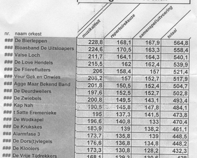 Dan tromgeroffel voor de wedstrijdklasse, vanaf tien wordt er afgeteld naar nummer één. Wij worden nummer acht en daar zijn we hartstikke trots op, we hadden namelijk niet verwacht in de top-10 te komen in dit veld. De Bierleppen worden voor de vijfde keer tot winnaar uitgeroepen. Ze spelen nog wat en wij gaan op naar ons laatste biertje. Binnen spelen we nog een klein kwartier tot onze lippen echt helemaal kapot zijn. De piep is leug!