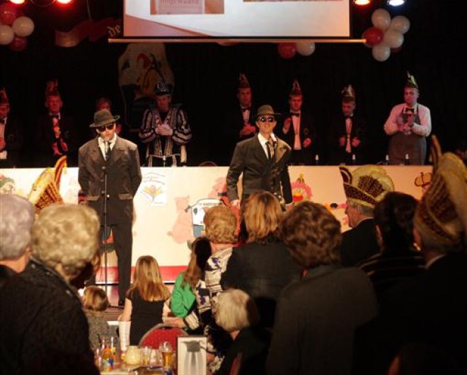 Silvi had voor ons heerlijke frietjes besteld want veel tijd tussen het brandweeroptreden en de pronkzitting was er niet. Zo zaten we een klein uurtje later alweer klaar op het podium in het Dorpshuis. We zagen hier weer schitterende dansen, een leuke buut van Hendrikus de Zandhoas en Frater Wilhelmus. En de Tunnel Brothers moeten we natuurlijk ook noemen. Wat een flitsende pasjes! De Old Stars waren trouwens ook weer aan het swingen.