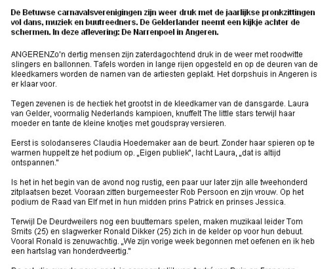 Ook Gerrit en Greet (Tom en Anne-marie) waren weer van de partij met ‘het leste nijs uut de kampsestroat’. Ze vertelden over het uitje van de gemeente naar de Efteling waar de raadsleden inspiratie op deden en in droomvlucht de Angerse plannen voorbij zagen komen. Toen de raadsleden wakker schrokken kwamen ze 9 miljoen tekort… Van Onna en Piet Boeijen gooiden de plannen in Holle Bolle Gijs.
