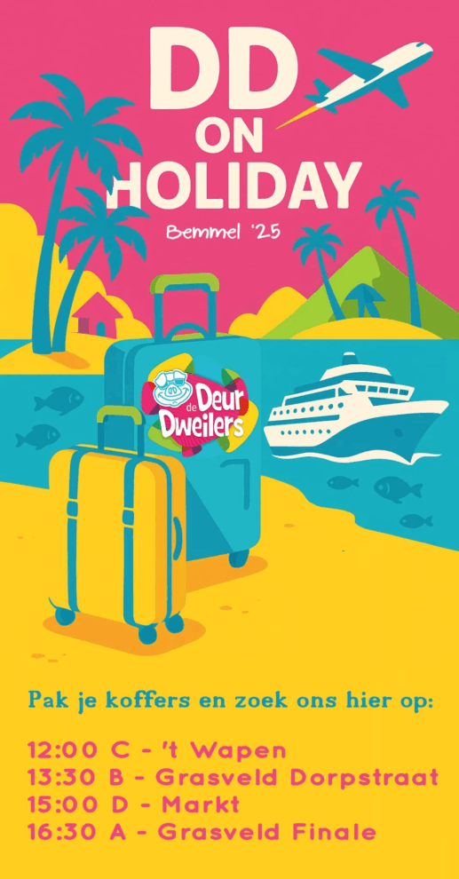 Gelukkig hebben De Deurdweilers uit Angeren daar een originele oplossing voor gevonden! Deze vrolijke dweilorkest-vakantiegangers zijn al helemaal in vakantiestemming en nemen je graag mee op een muzikale vakantietrip, en dat gewoon in eigen land! Op zaterdag 8 juni pakken ze hun koffers en vertrekken naar de Bemmelse Dweildag.