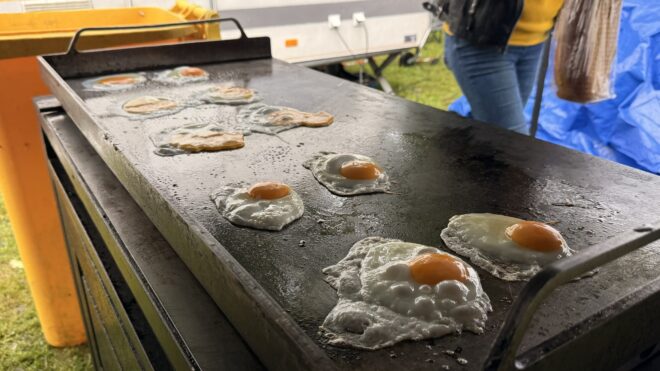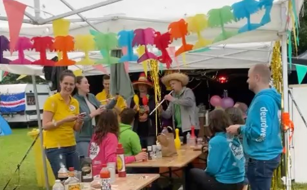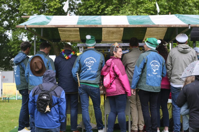 Omdat ook glaswerk niet meer mocht volgens de vergunning hadden we samen met Alarmfase3 en De Feintsjes een tapinstallatie gehuurd en alle partytenten bij elkaar gezet om zo droog buiten te kunnen zitten. Er was immers wel wat regen voorspeld. En zo werd het een gezellige vrijdagavond waar ook nog ruimte was voor Karaoke en een heuse ‘voorwerpen bingo’.
