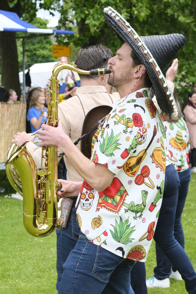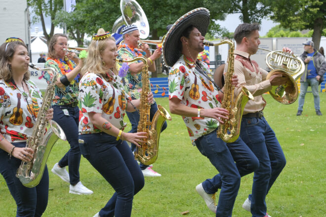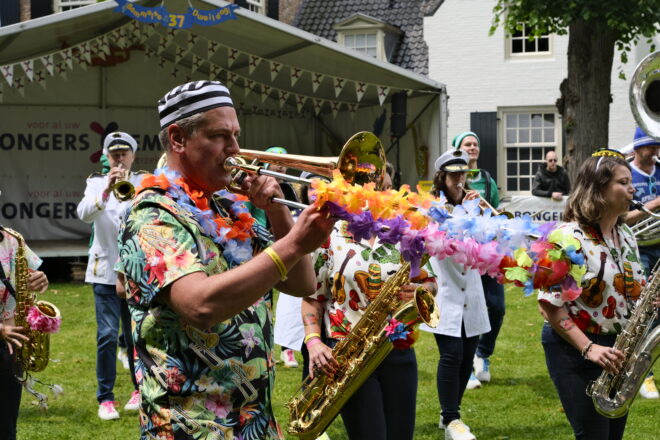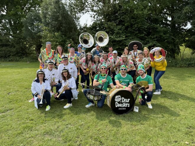 Het leek wel of de organisatie met dit “tropische dweilfiesta” thema de weergoden gejinxt had, want het hele weekend viel er aardig wat regen. Wat hadden wij geluk dat we 4x droog konden spelen. Dan zag je dat de Bemmelse straten direct weer vol liepen en we toch weer voor veel publiek konden spelen. Heerlijk!