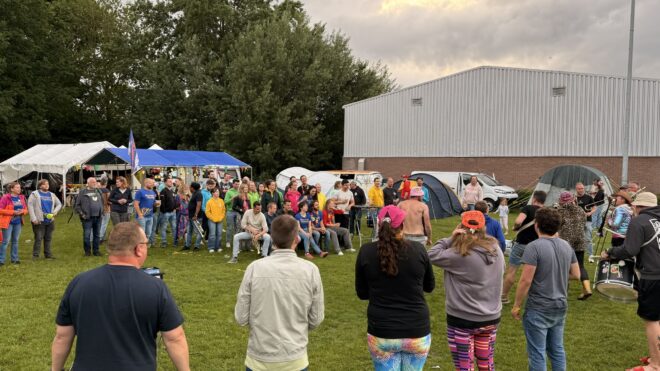 The day after. De zaterdag werd iedereen langzaam wakker onder het genot van een heerlijk gebakken eitje van onze eigen chef-kok Andre. Terwijl Alarmfase3 in het centrum ging opbouwen en de Feintsjes gingen bowlen, stond er bij ons een repetitie op de planning om nog wat puntjes op de i te zetten. Het was nog steeds droog, dus de hele show kon buiten op de camping gerepeteerd worden. Lenny moest nog snel naar Brugman Muziek in Gaanderen om de sax te repareren. Gelukkig kon dit direct verholpen worden en ze kwam zowaar terug zonder nieuw instrument. Goed dat Youri niet mee was.