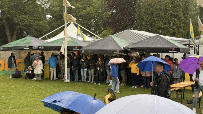 Nadat we even de Feintsjes gingen kijken ging het regenen bij het hoofdpodium net toen Ut Word Wa uit Cuijk ging spelen. Dit was een orkest uit de leutklasse dus mochten we het jurypodium gebruiken om te schuilen en toch mee te kunnen zingen. Hopelijk de laatste bui van de dag!