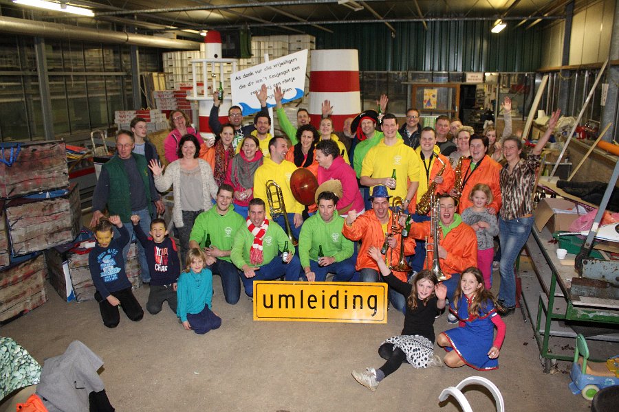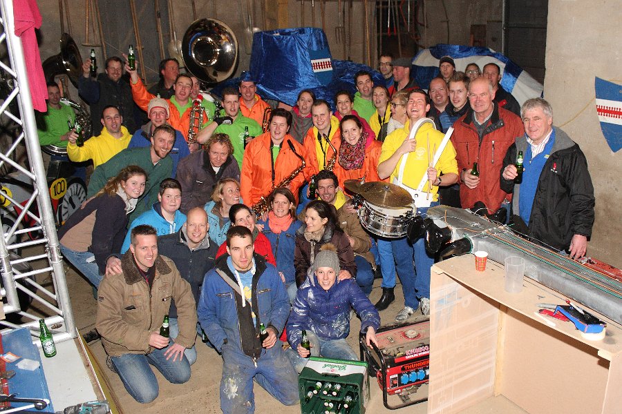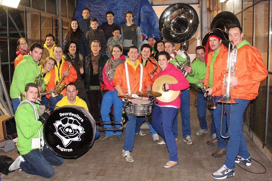 We begonnen de vrijdagavond met het door onszelf bedachte “Gesjouw langs de bouw”. Een groot aantal bouwploegen van de Angerse optocht werden aangedaan om ze nog even een extra (muzikale) aanmoediging te geven voor de optocht. Op de meeste plaatsen werd nog volop geklust, maar werd er toch even lekker op onze muziek gefeest!