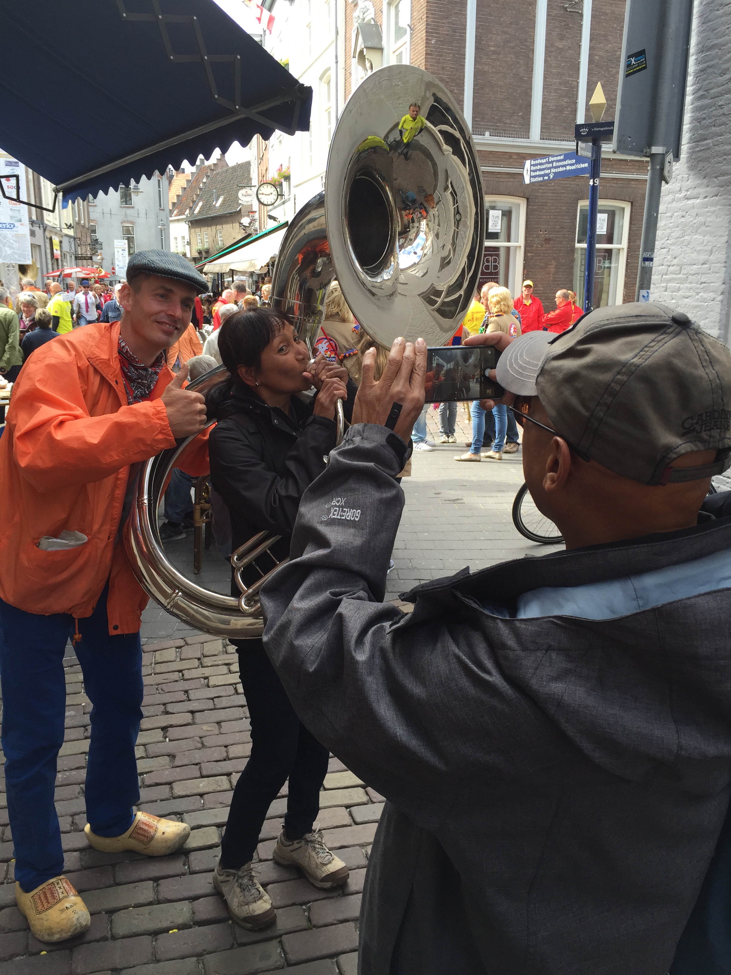 Het eerste setje was voor de muzikanten van “Nog eentje dan”, want publiek was er nog niet. (Iets te maken met dat de winkels pas om 12 uur opengingen?) Maar voor onszelf een lekker begin van de dag. Ging best goed! Het tweede optreden was ook gezellig op de hoek van een straatje. Okee, af en toe een auto die door ons podium heenreed, maar wel meer publiek en in het zonnetje!