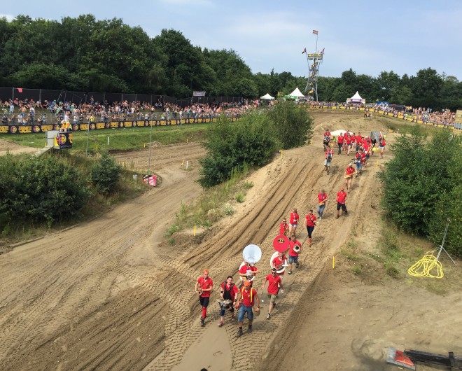Dus de nodige biertjes gingen er wel in. De organisatie was op vrijdag nog even ver te zoeken, maar uiteindelijk mochten we de baan op. We werden direct de ‘arc de triomph’ op geroepen om vanaf dat hoge uitkijkpunt een nummer te spelen. Wat een uitzicht! Echter, de cross moest verder dus ons optreden zat er snel op.