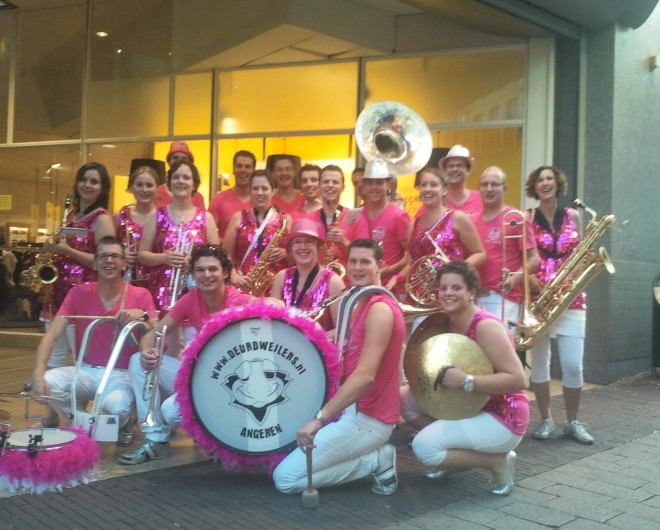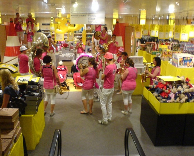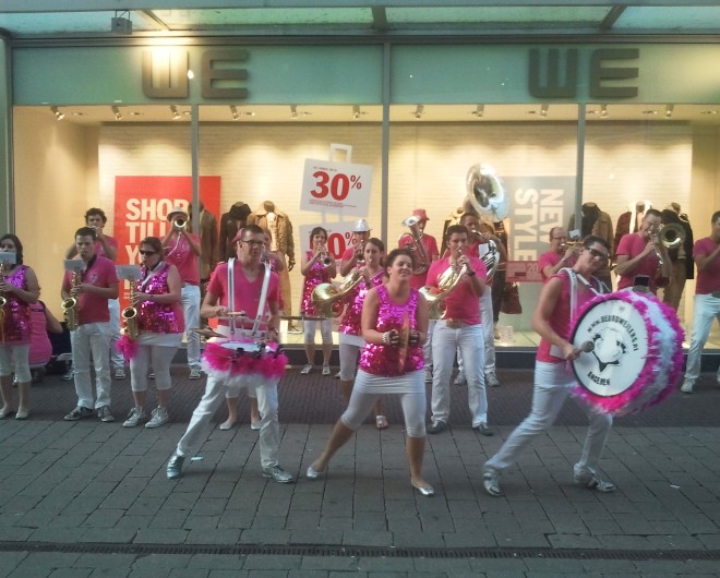 In polonaise ging het door de Bijenkorf heen om uiteindelijk in het restaurant terecht te komen. Na een lekkere maaltijd en nog wat nummers hebben we het personeel gedag gezegd. Buiten aangekomen liepen we tegen een enthousiast terrasje aan dus ook daar werd nog wat gespeeld en ook op de weg naar de parkeerplaats hebben we nog een serenade aan een schitterende Sanseveria gebracht. Tijdens het inpakken van de instrumenten werden we overgehaald om ook nog even in De Waag te komen spelen want daar was Merlijn haar 16e verjaardag aan het vieren. OK. Ook nog even gespeeld.