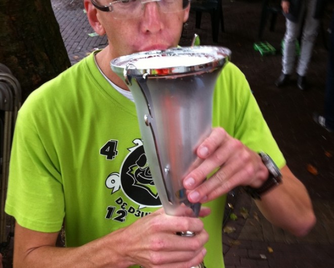Lizan betrad het podium om de beker in ontvangst te nemen. We kwamen een half puntje tekort om de Gouden Dweil te winnen, maar daar hadden we er toch al drie van. En het mooie van deze originaliteitsprijs is dat het een beker is en dus mooi gevuld kon worden met bier. De Troaters hebben nu een mooie gouden dweil voor op de schoorsteenmantel! Proficiat mensen!