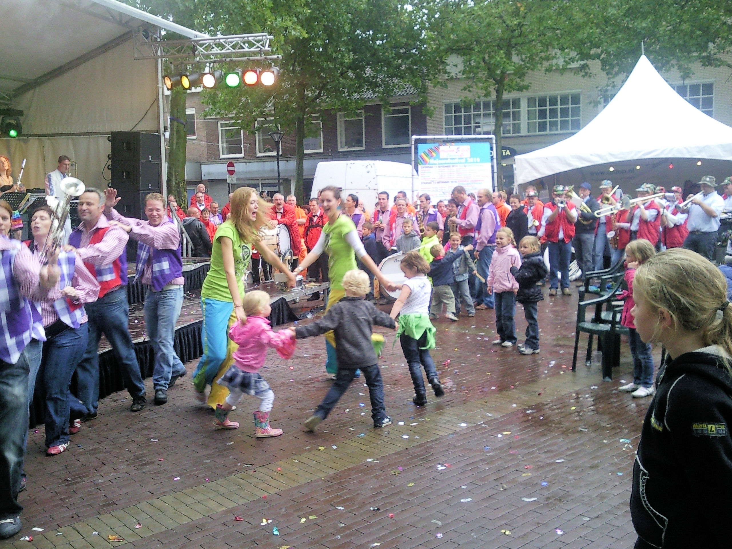 Ondanks de regen was het nog best een leuk dagje. En zoals we al eerder vermelden was het erg plezierig dat de dag droog eindigde. Na ons laatste optreden speelden we nog Nee Nee Geen Arreslee samen met de Retteketet Showband wat ook erg leuk was. Noortje was vandaag jarig en dat heeft ze geweten. Ze werd hoofdgast en mocht in een stoel op het podium zitten. Nog bedankt voor de lekkere cake met slagroom Noortje!