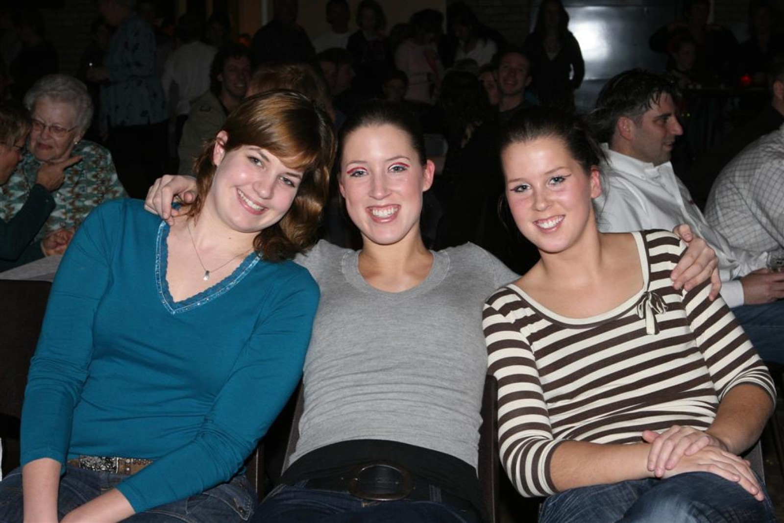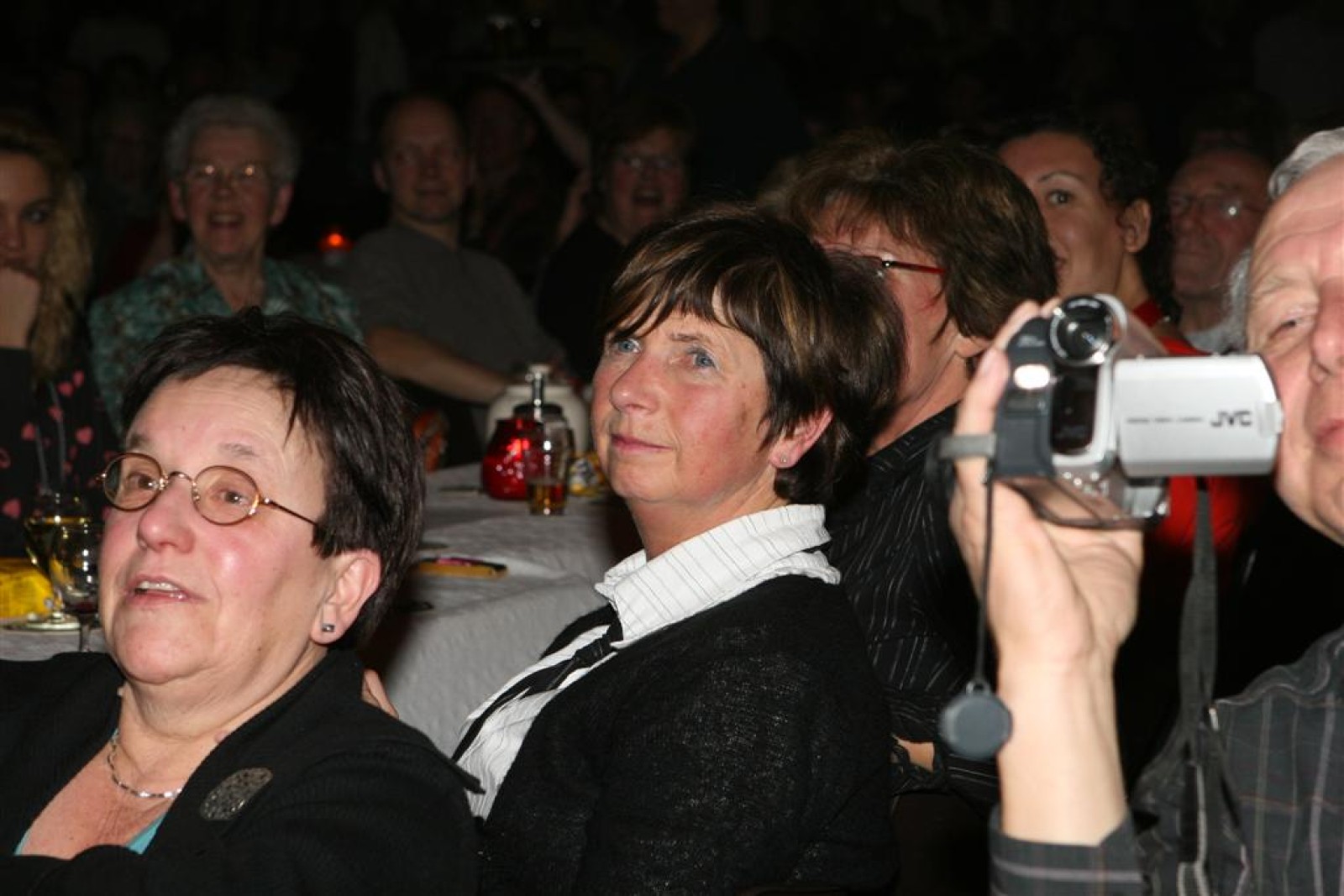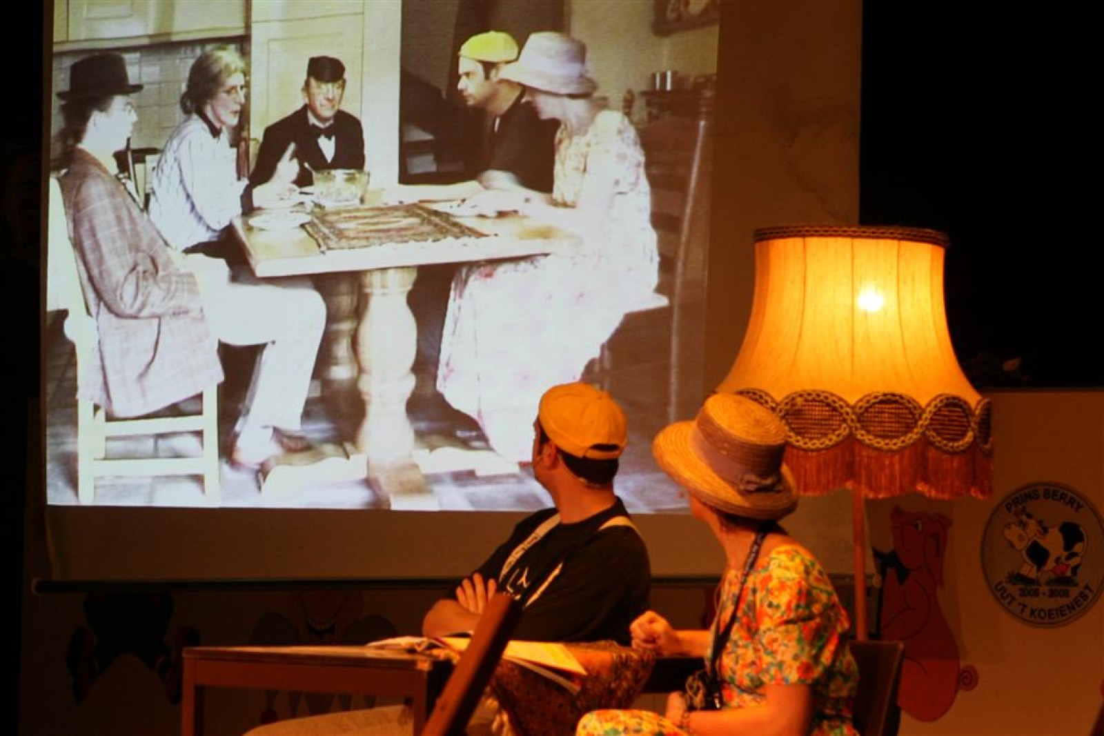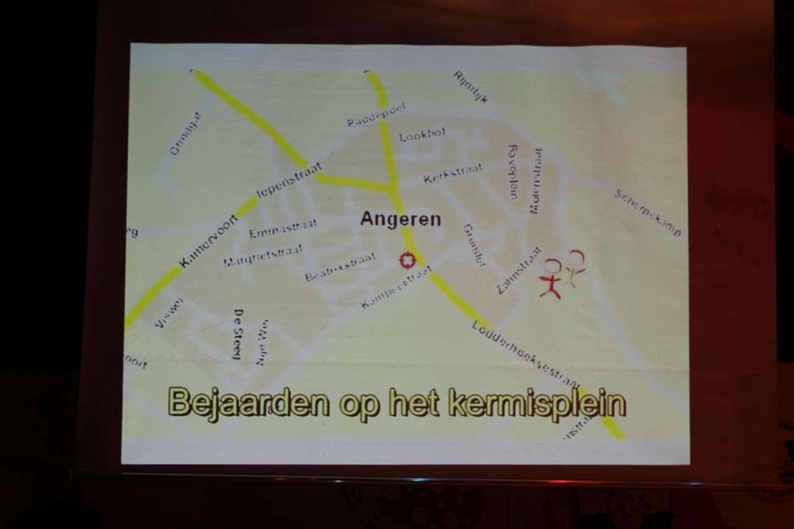 Naast een ‘normaal’ optreden, hadden we ook een act ingestudeerd. Geinspireerd door de Microsoft reclame keken we op een beamer naar de toekomst van Angeren op muziek van Het Dorp. Martijn zong erbij en het duurde niet lang voordat ook de zaal meezong. En wat volgens ons nog nooit gebeurd is: de act is 2x opgevoerd!! In de pauze waren verschillende mensen gaan vragen of het misschien nog een keer gedaan mocht worden. Gelukkig was hier ruimte voor, dus was het ook de slot-act.