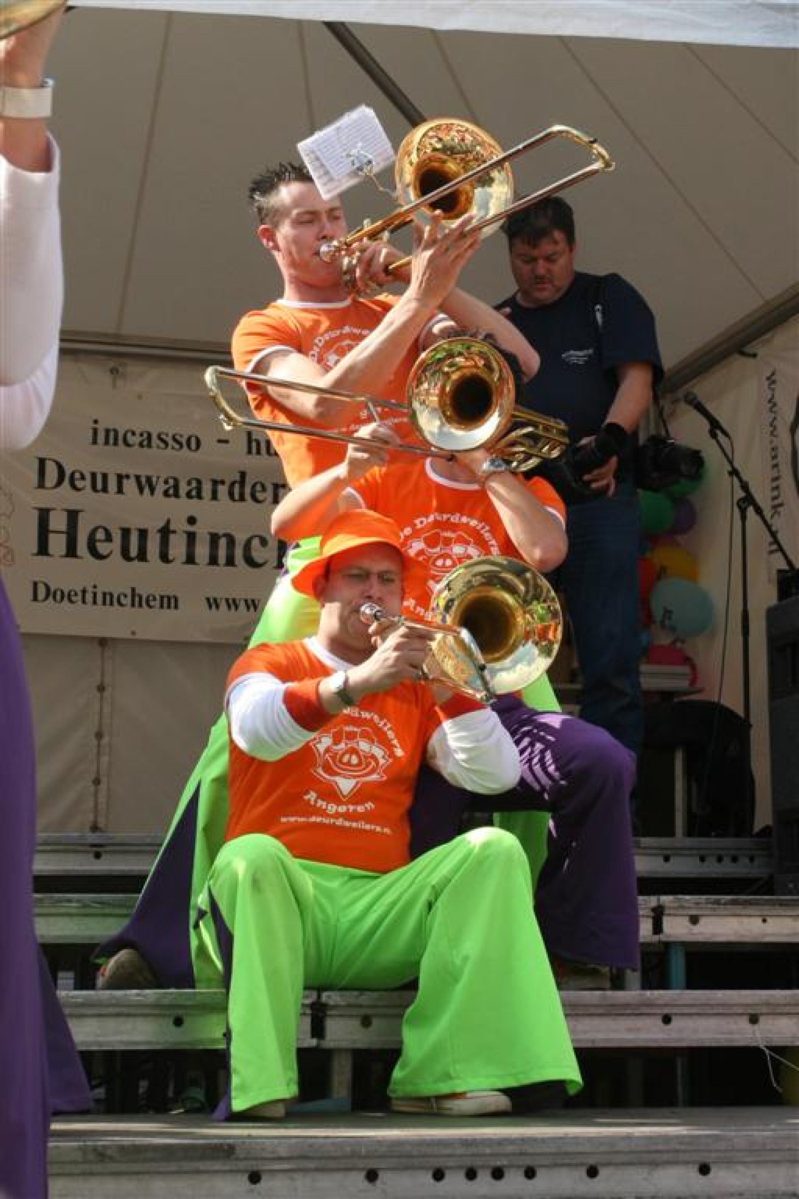 De eerste fans worden gespot en we stemmen 2x. Waarom twee keer? Een keer om straks niet vals van start te gaan en nog één keer om te bepalen welke liedjes we gaan spelen. We dansen nog even met onze voorgangers mee voor de gezelligheid en om 13.30 gaan we van start. Gelukkig gooien onze trouwe meegereisde fans af en toe de handen in de lucht. Al met al ging het best goed, maar er zijn nog wel wat verbeterpuntjes.