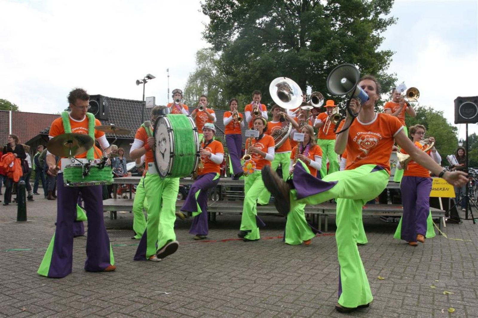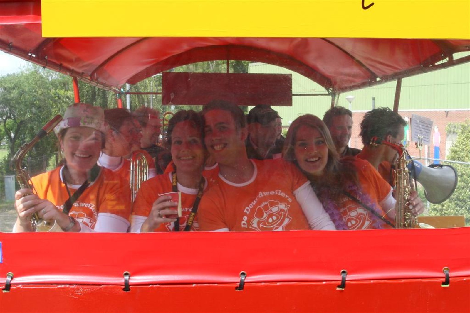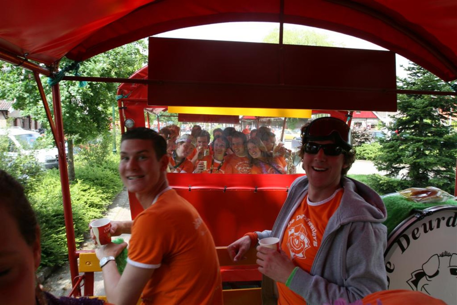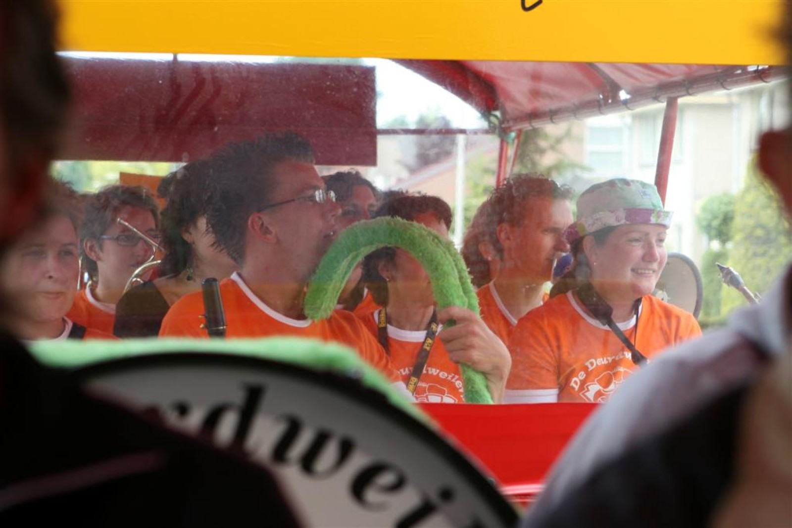 De eerste fans worden gespot en we stemmen 2x. Waarom twee keer? Een keer om straks niet vals van start te gaan en nog één keer om te bepalen welke liedjes we gaan spelen. We dansen nog even met onze voorgangers mee voor de gezelligheid en om 13.30 gaan we van start. Gelukkig gooien onze trouwe meegereisde fans af en toe de handen in de lucht. Al met al ging het best goed, maar er zijn nog wel wat verbeterpuntjes.