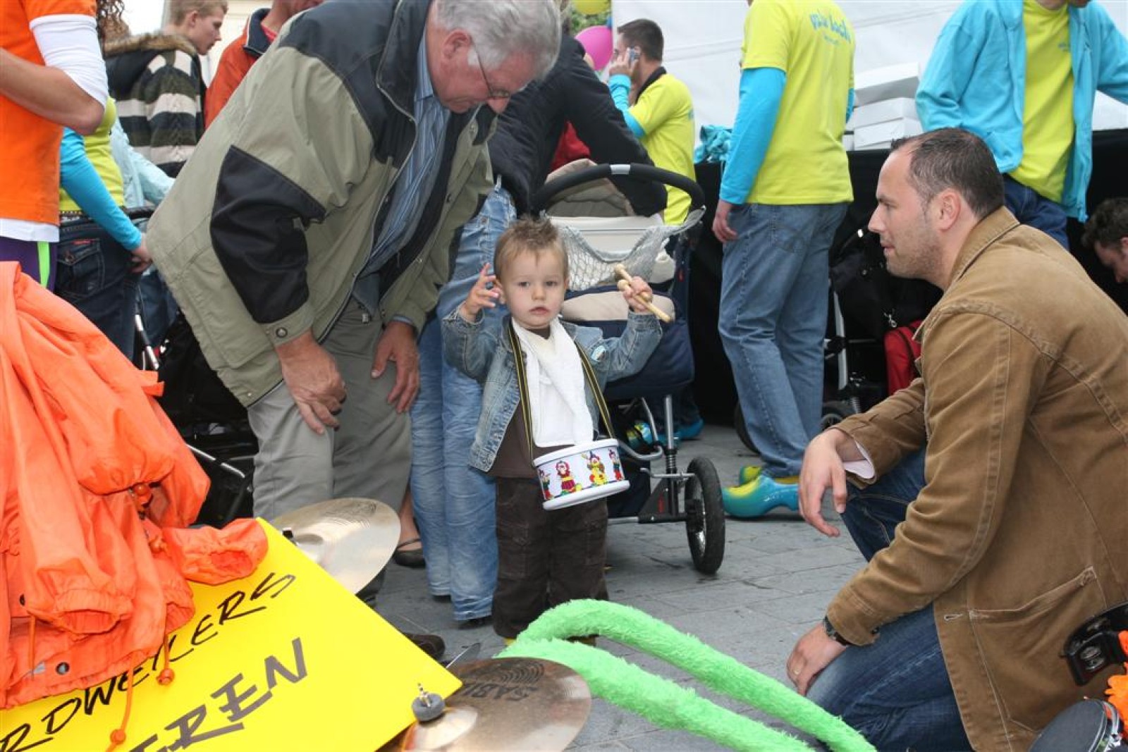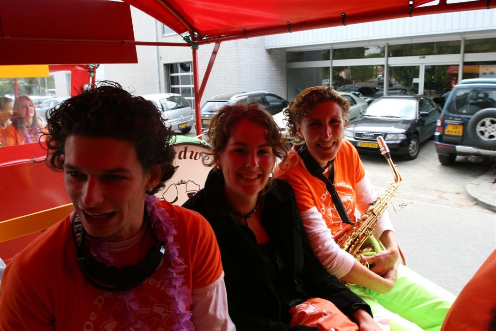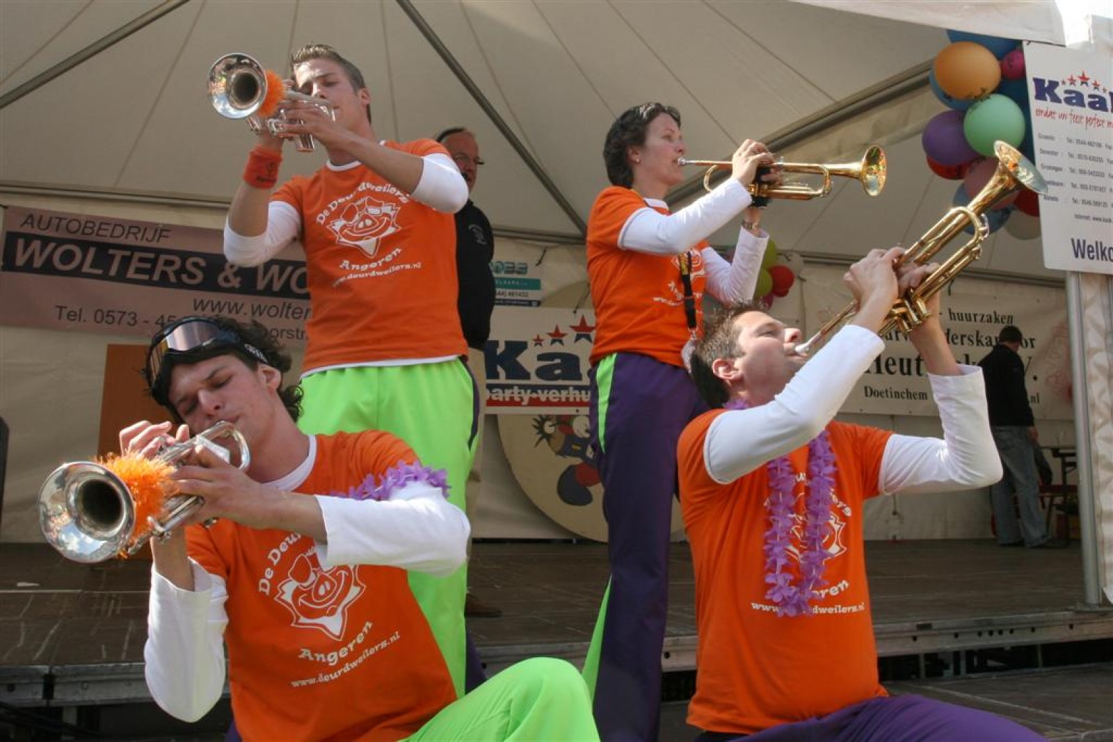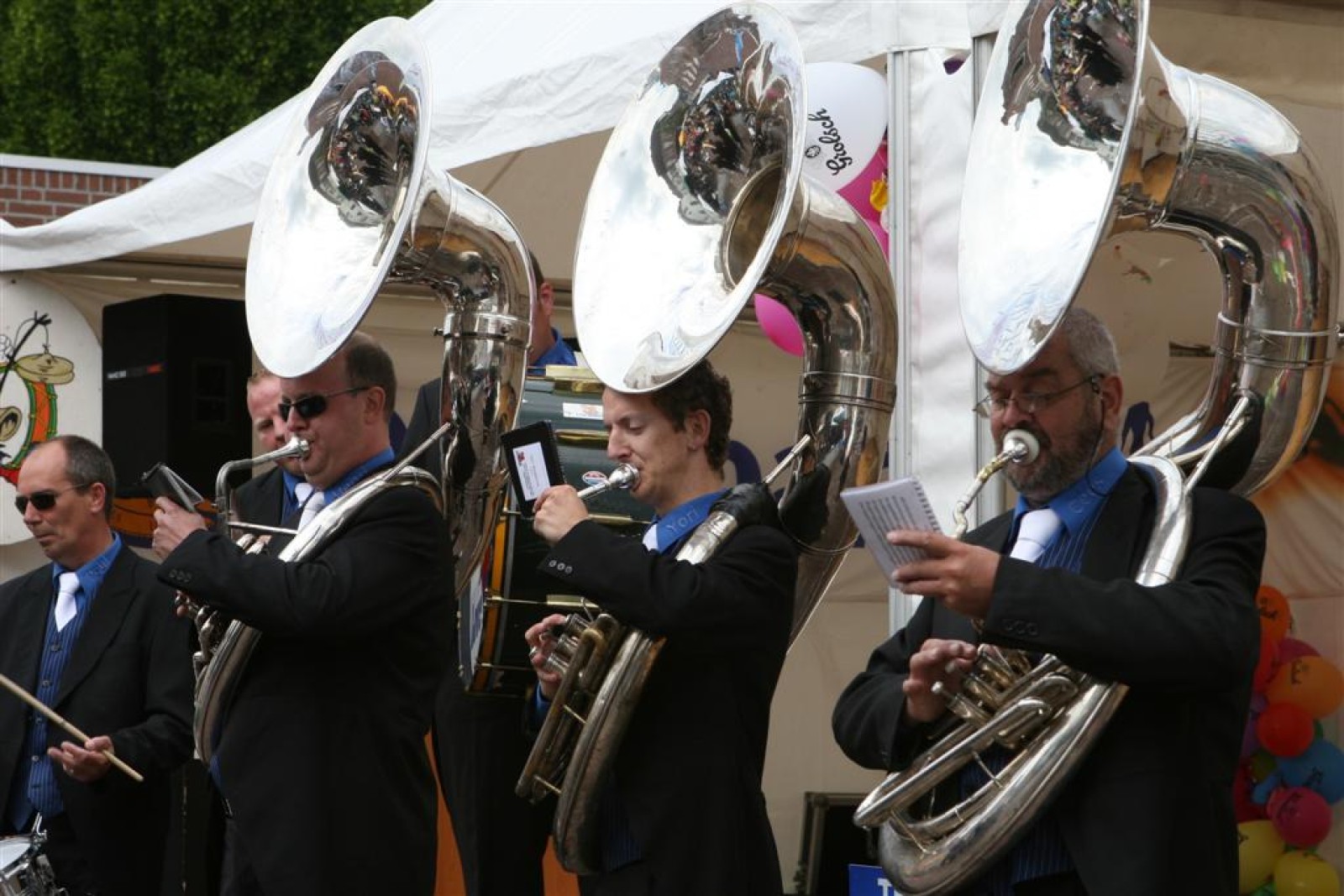 De eerste fans worden gespot en we stemmen 2x. Waarom twee keer? Een keer om straks niet vals van start te gaan en nog één keer om te bepalen welke liedjes we gaan spelen. We dansen nog even met onze voorgangers mee voor de gezelligheid en om 13.30 gaan we van start. Gelukkig gooien onze trouwe meegereisde fans af en toe de handen in de lucht. Al met al ging het best goed, maar er zijn nog wel wat verbeterpuntjes.