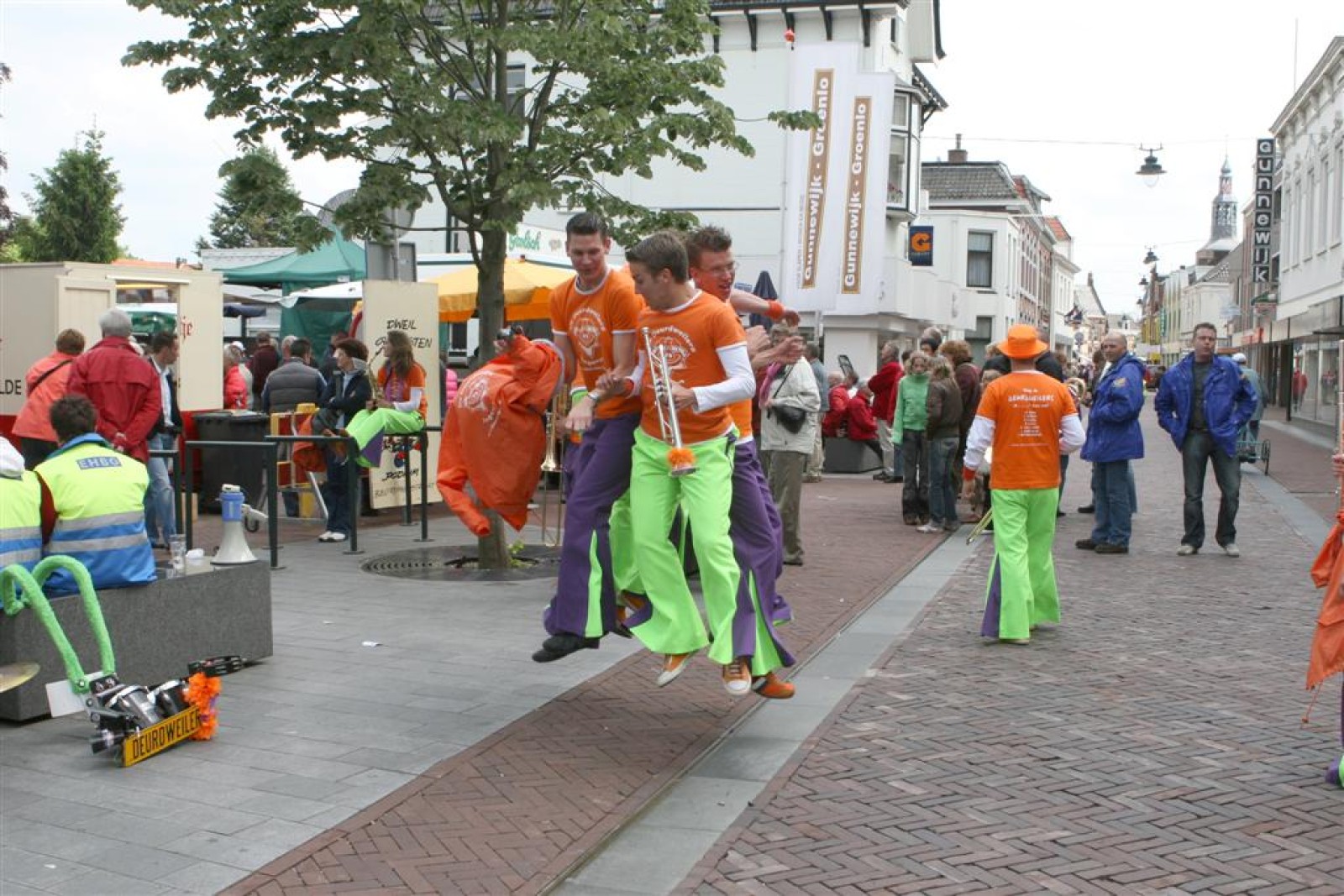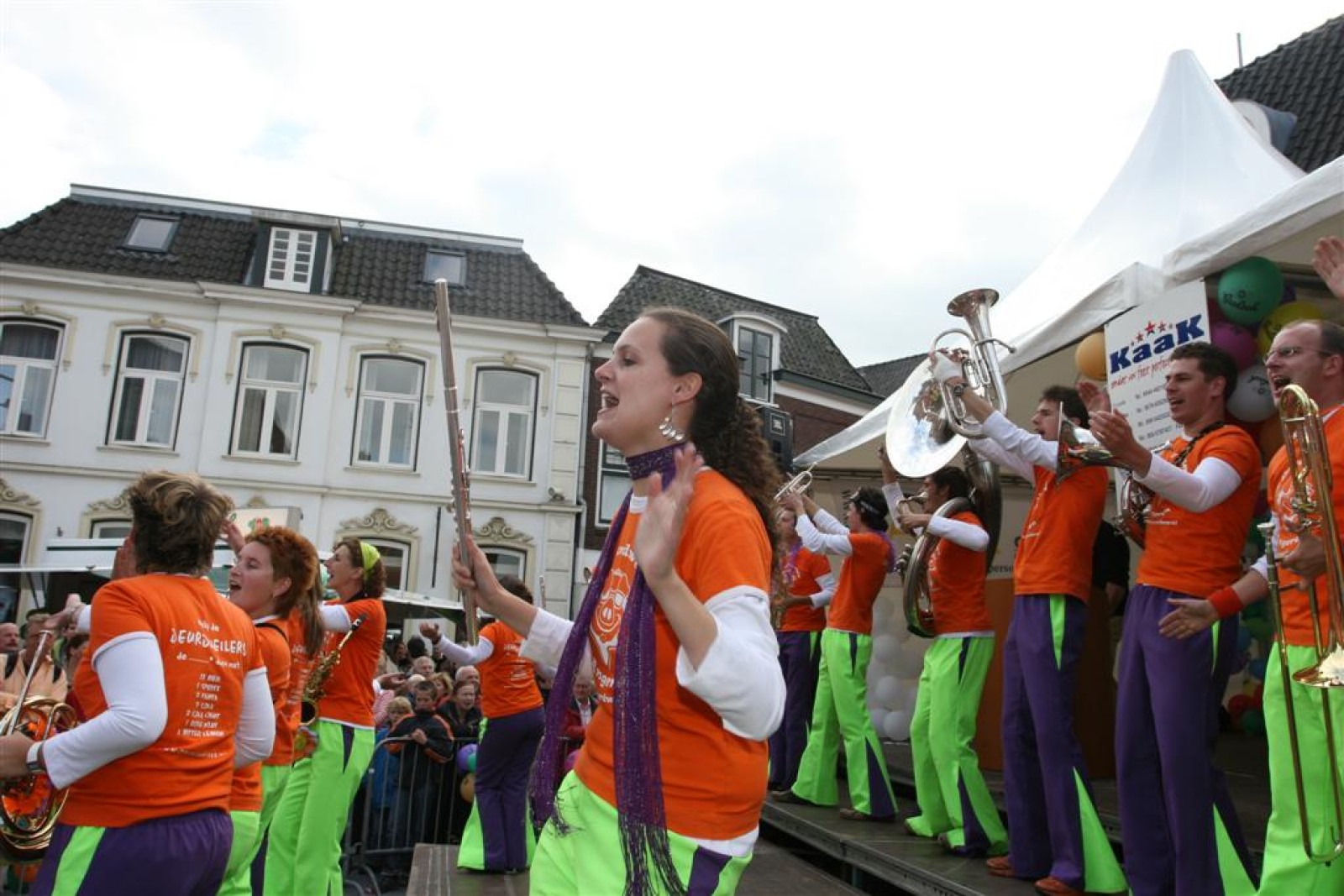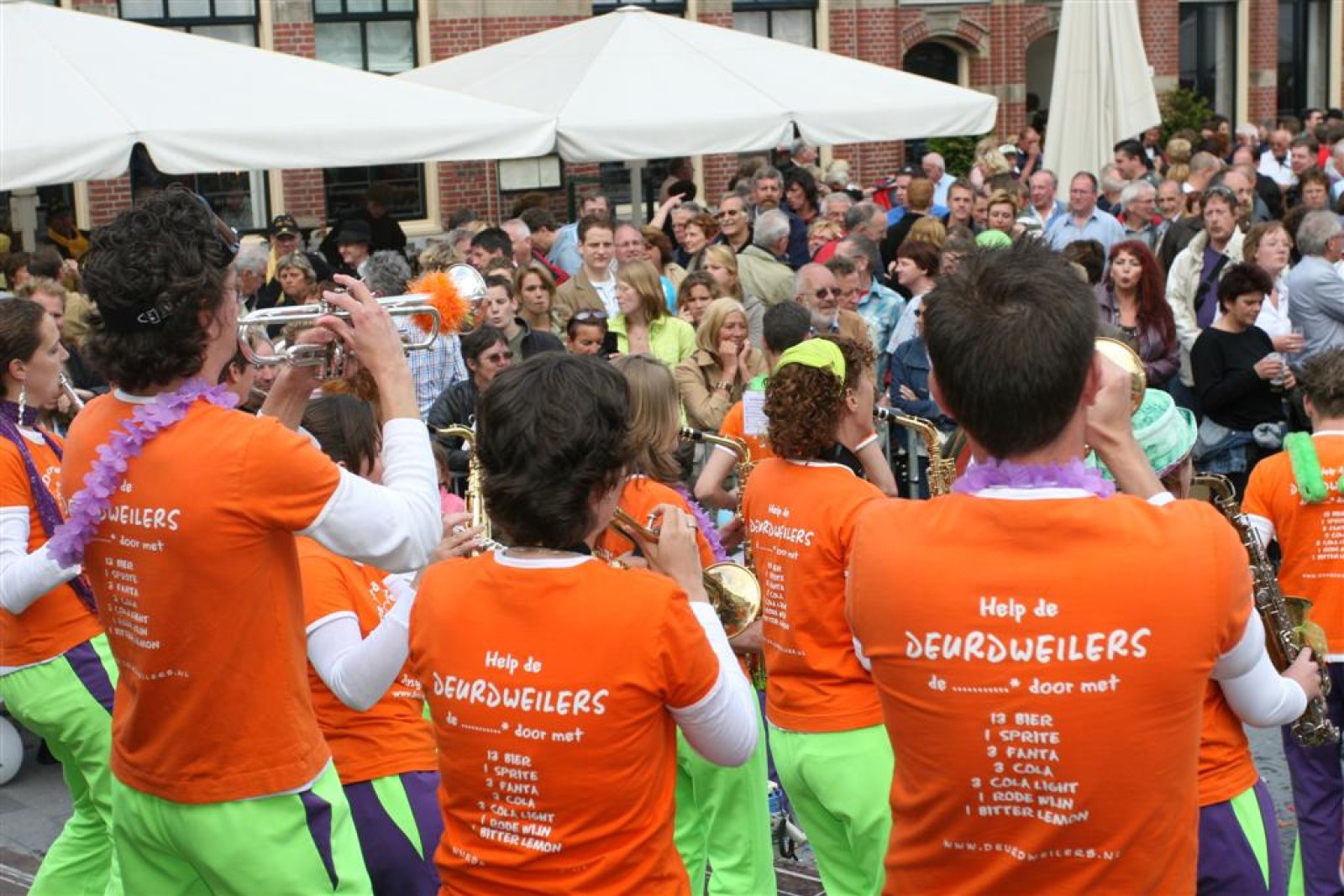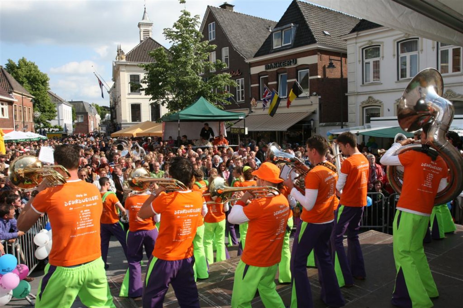 Na dit optreden lopen we gauw richting de Markt. Met moeite komen we de menigte door. Tijdens het optreden staan we een stuk compacter en hierdoor komen we veel beter uit volgens een paar trouwe fans. Het publiek is hier enthousiast en dat merk je ook gelijk aan ons. We gaan er weer flink tegenaan en springen en dansen tot we er bijna bij neervallen.