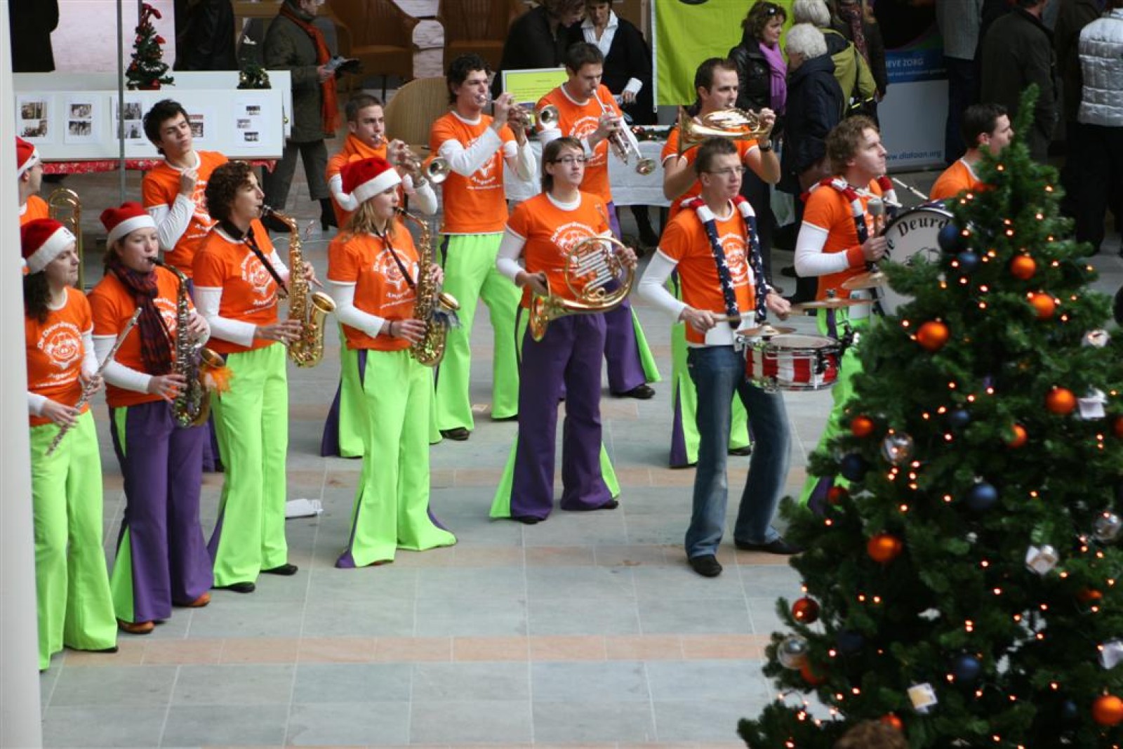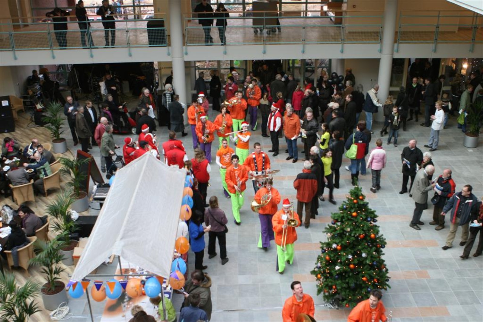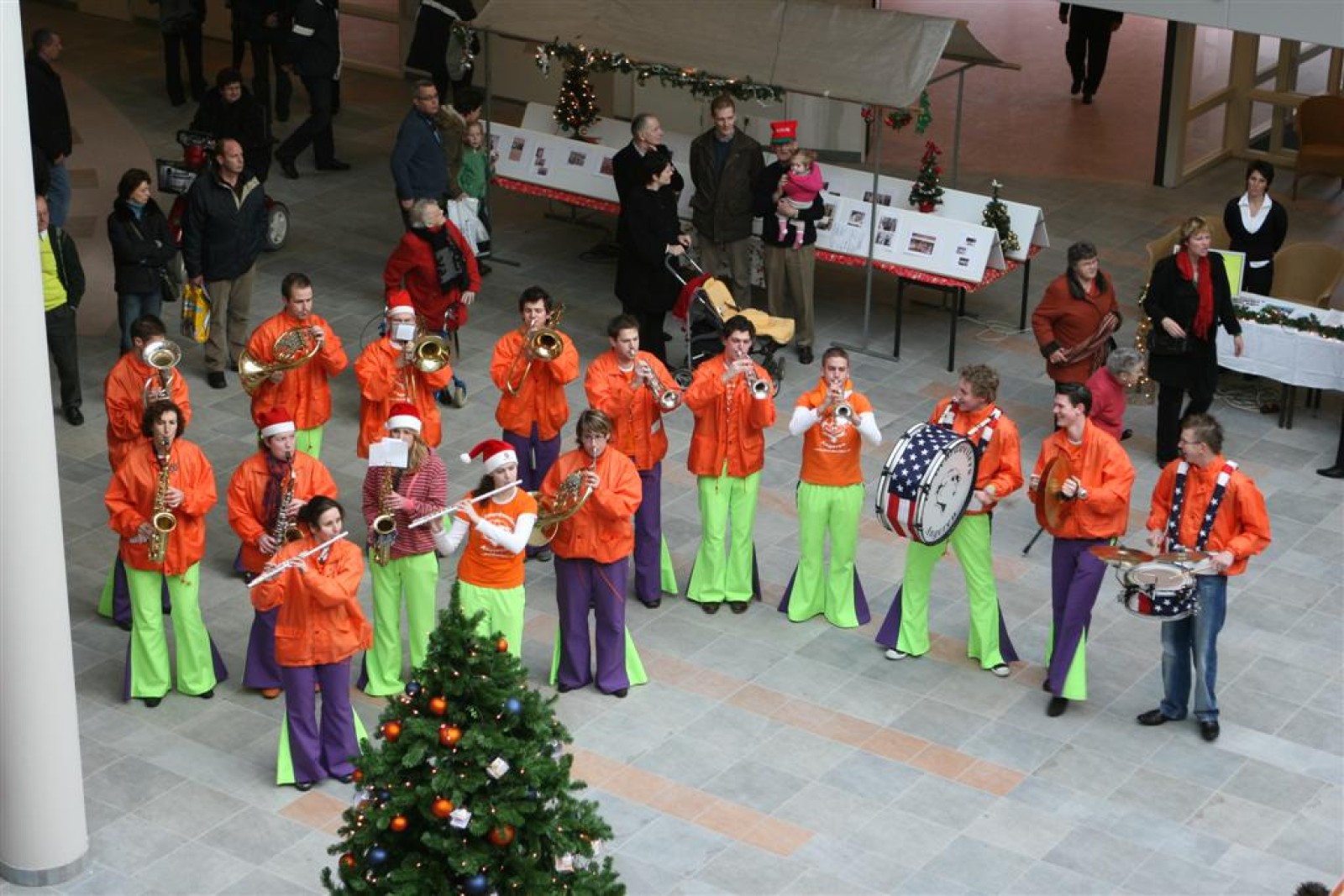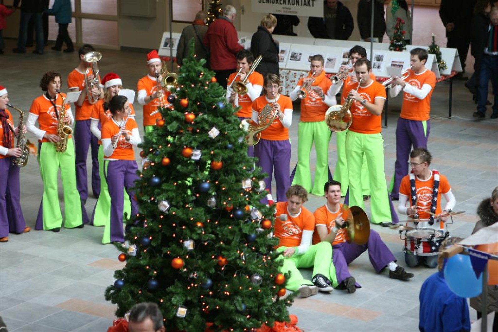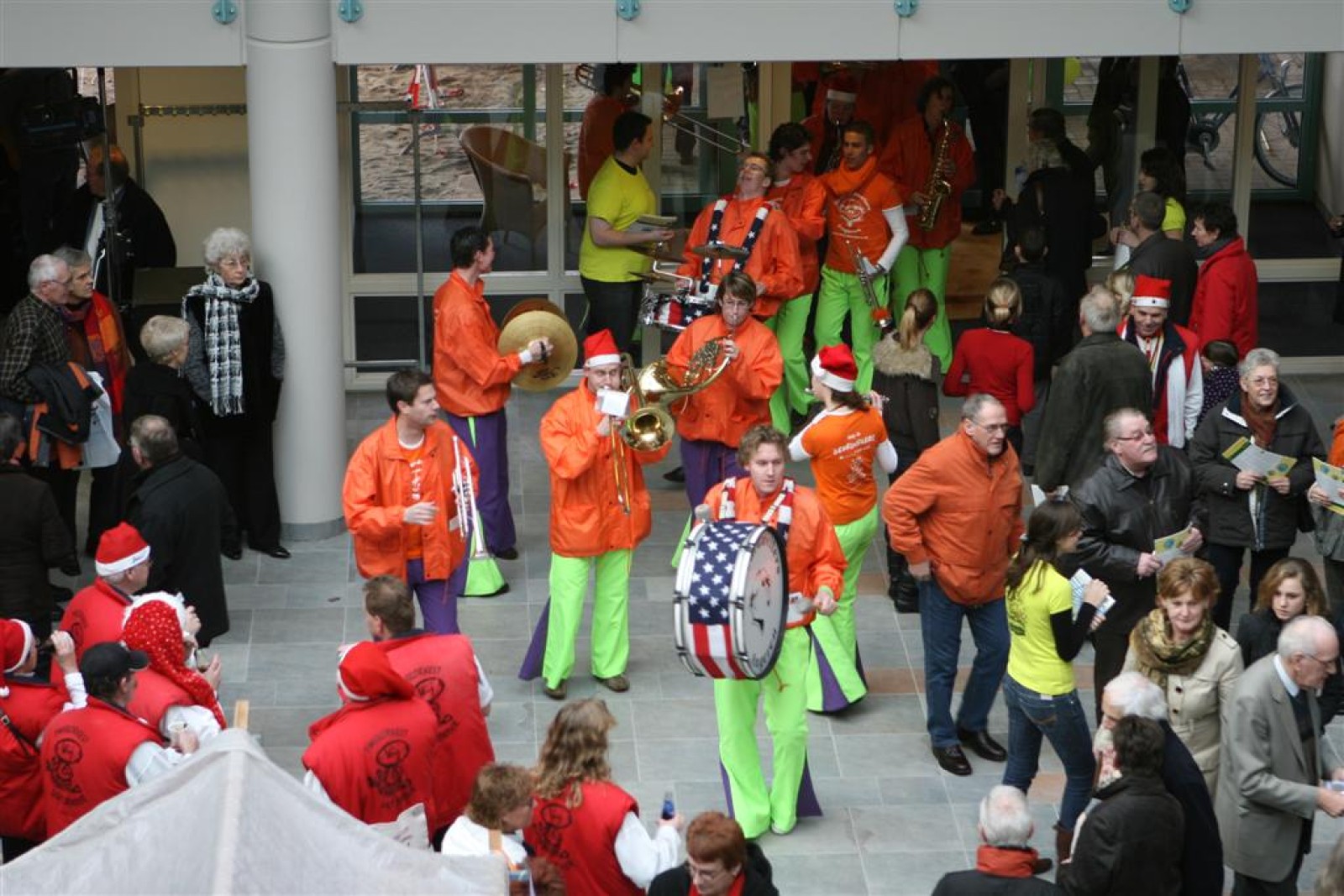 Het was mooi weer, dus zo marcheerden we fier richting de markthal en het nieuwe hypermoderne bejaardentehuis. Voor de deur speelden we even in en daarna marcheerden we al voeten vegend naar binnen. Wat een lekkere accoustiek zeg! En de nieuwe nummers gingen ook goed! Ik krijg er al een goed gevoel bij en ze kunnen alleen nog maar beter gaan! Nog ff K3 voor het jonge publiek en daarna ff een rustmomentje. De één keek wat rond en de ander ging nog ff op de sfeerfoto bij Henk. En in het café dronken we wat en aten we alle kerstkransjes op. En daarna gauw naar de markthal, waar we voor ons volgend optreden verwacht werden.