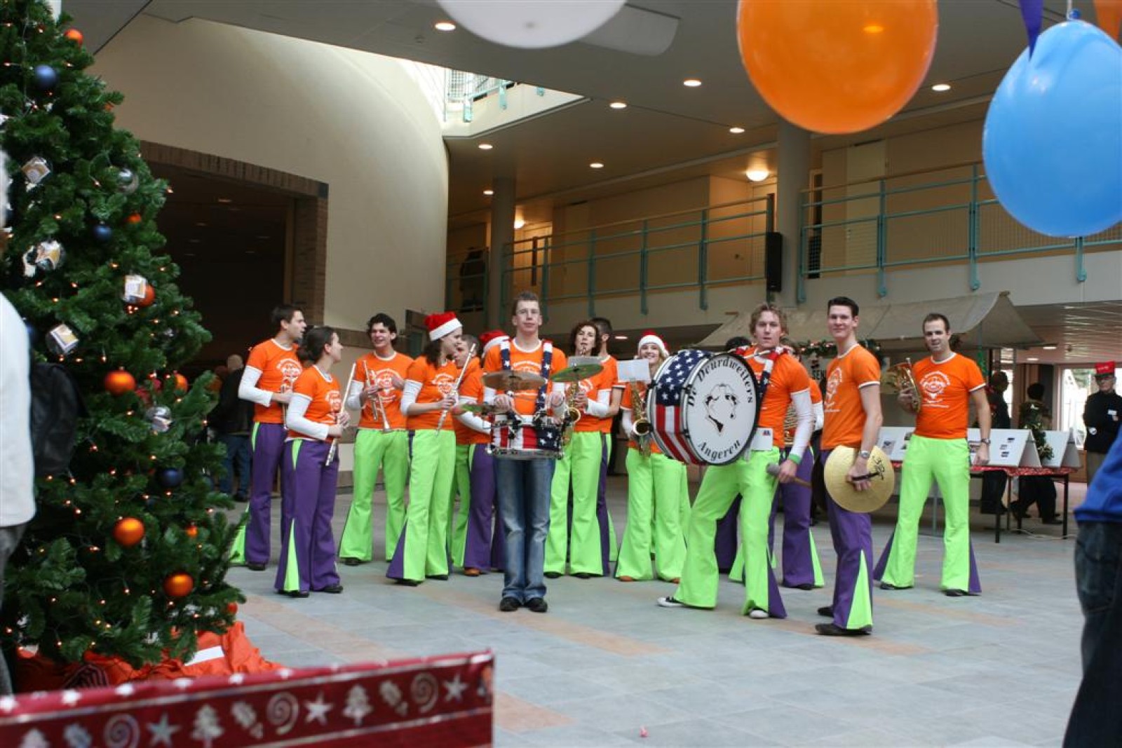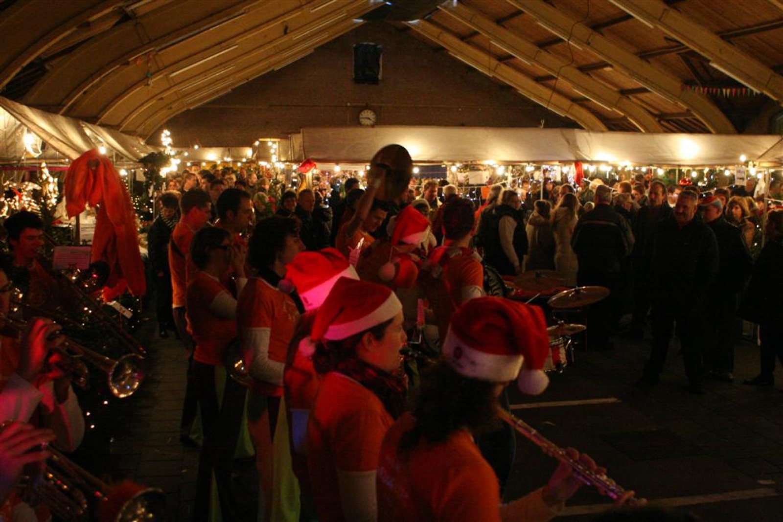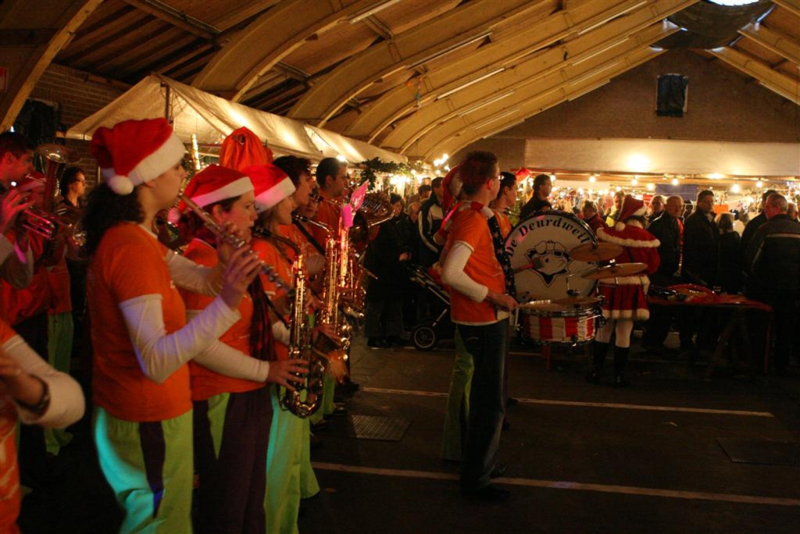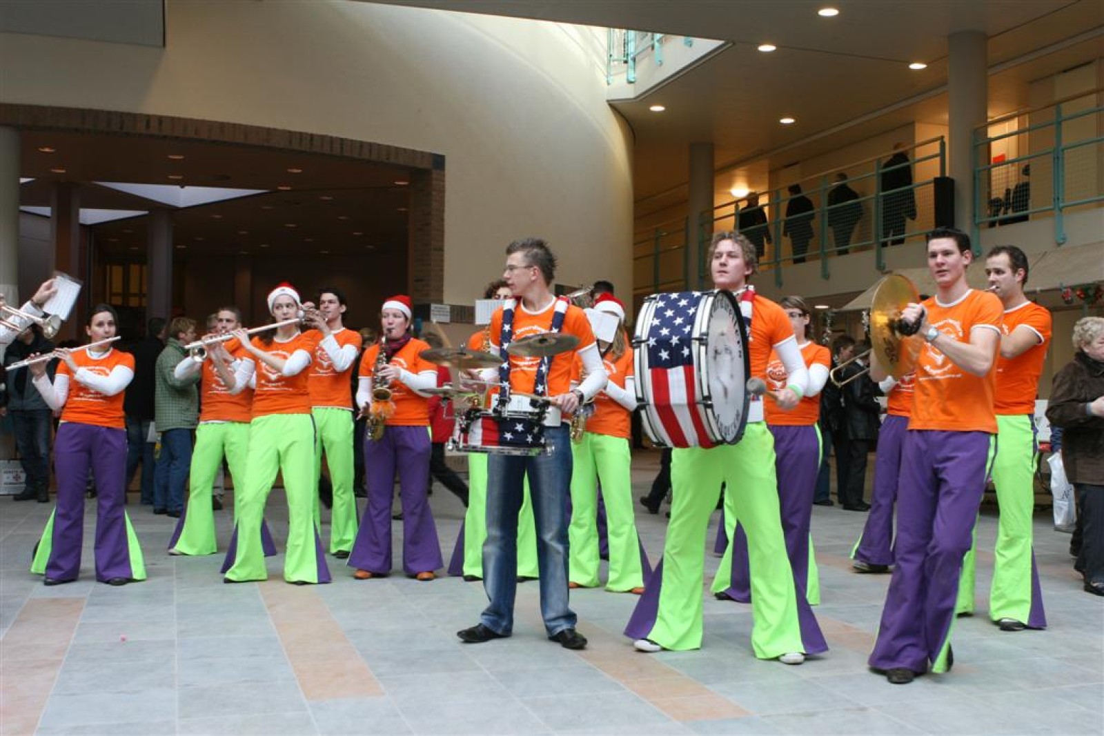 Het was mooi weer, dus zo marcheerden we fier richting de markthal en het nieuwe hypermoderne bejaardentehuis. Voor de deur speelden we even in en daarna marcheerden we al voeten vegend naar binnen. Wat een lekkere accoustiek zeg! En de nieuwe nummers gingen ook goed! Ik krijg er al een goed gevoel bij en ze kunnen alleen nog maar beter gaan! Nog ff K3 voor het jonge publiek en daarna ff een rustmomentje. De één keek wat rond en de ander ging nog ff op de sfeerfoto bij Henk. En in het café dronken we wat en aten we alle kerstkransjes op. En daarna gauw naar de markthal, waar we voor ons volgend optreden verwacht werden.