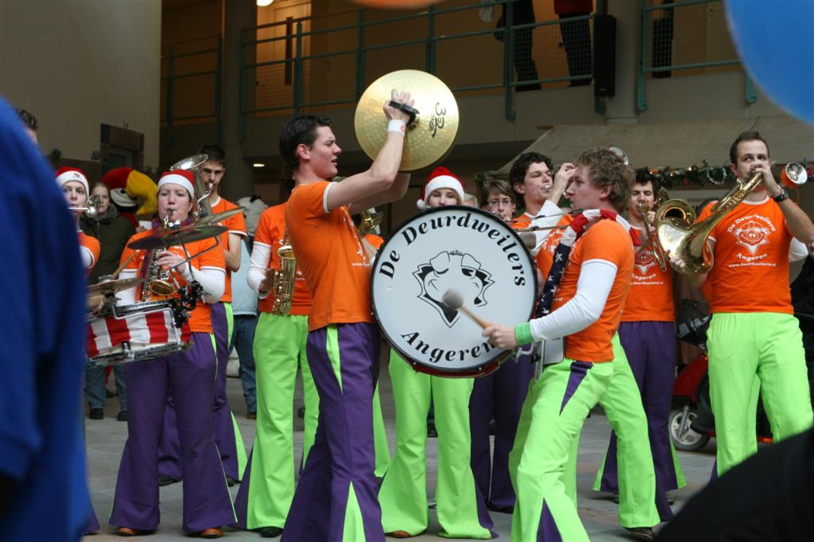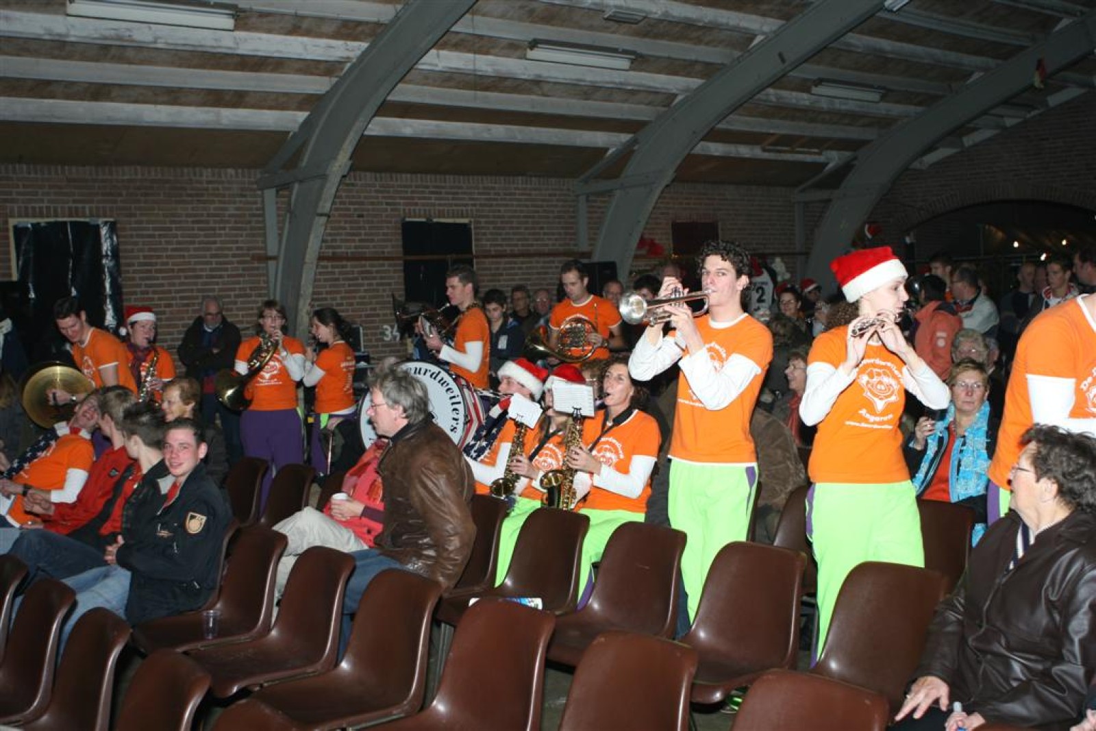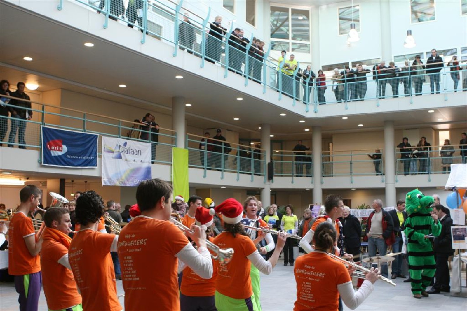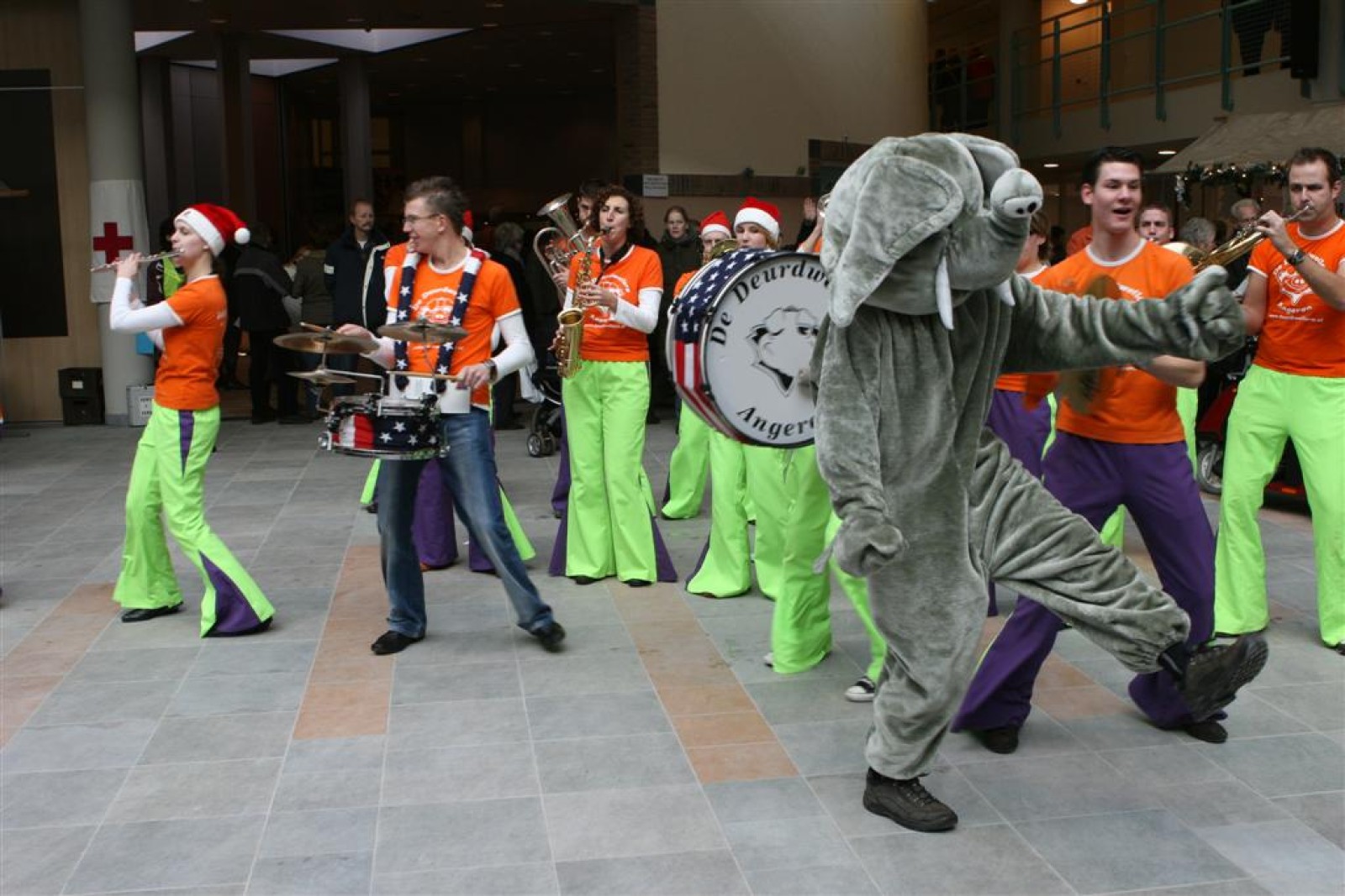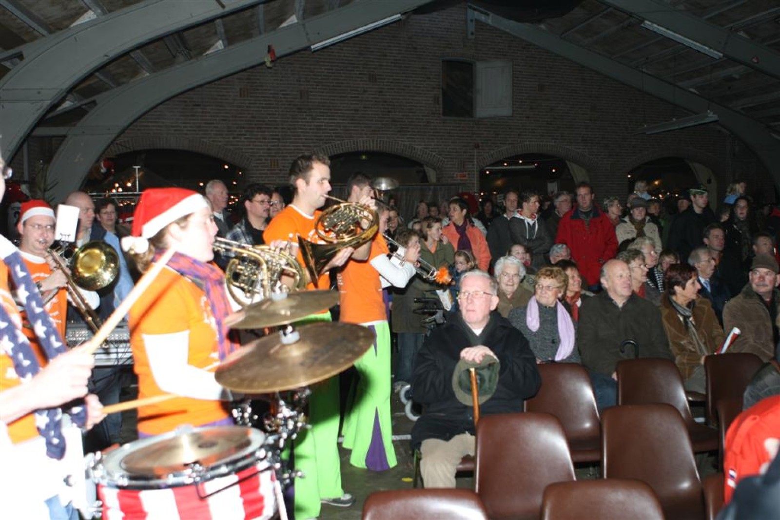 Het was mooi weer, dus zo marcheerden we fier richting de markthal en het nieuwe hypermoderne bejaardentehuis. Voor de deur speelden we even in en daarna marcheerden we al voeten vegend naar binnen. Wat een lekkere accoustiek zeg! En de nieuwe nummers gingen ook goed! Ik krijg er al een goed gevoel bij en ze kunnen alleen nog maar beter gaan! Nog ff K3 voor het jonge publiek en daarna ff een rustmomentje. De één keek wat rond en de ander ging nog ff op de sfeerfoto bij Henk. En in het café dronken we wat en aten we alle kerstkransjes op. En daarna gauw naar de markthal, waar we voor ons volgend optreden verwacht werden.