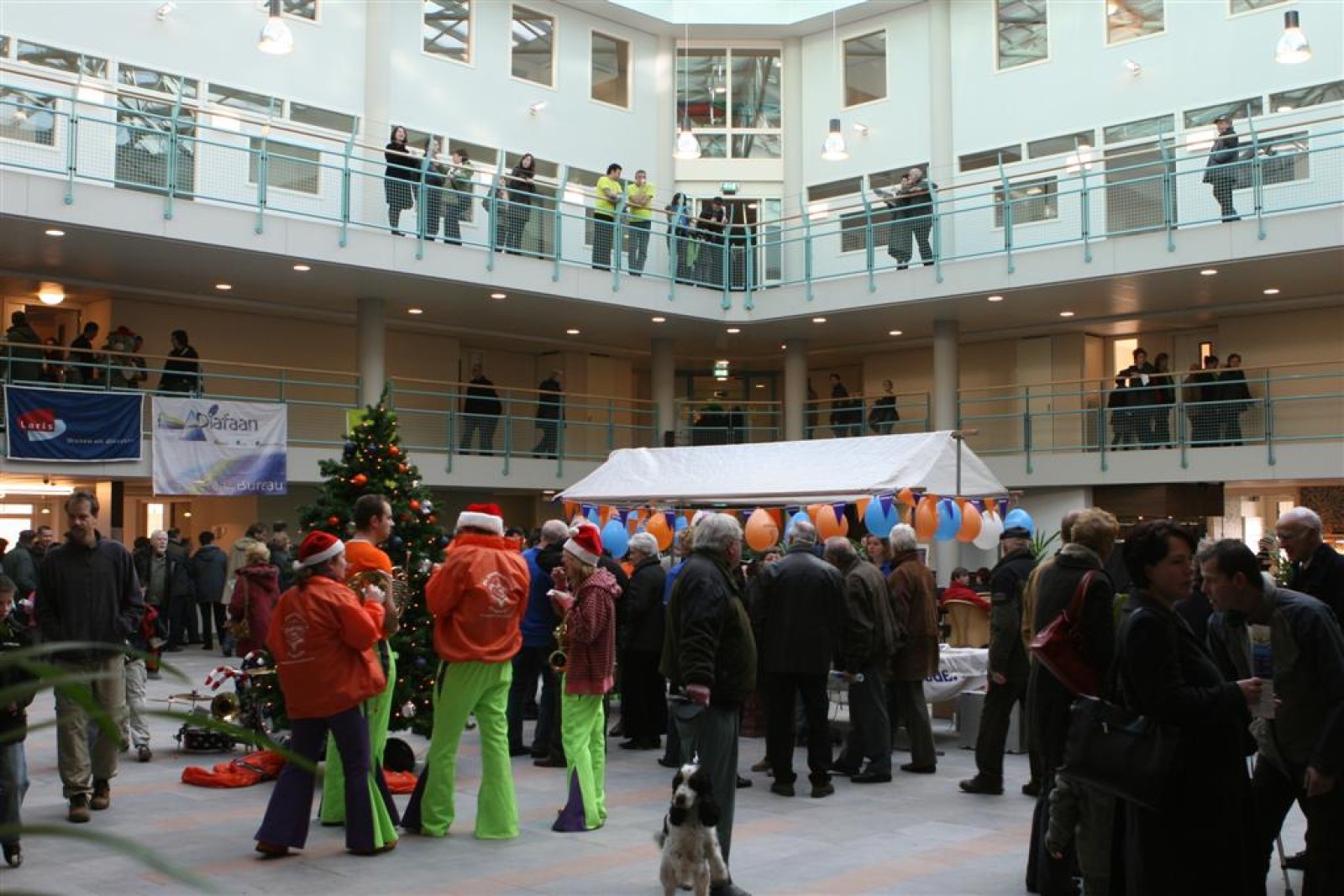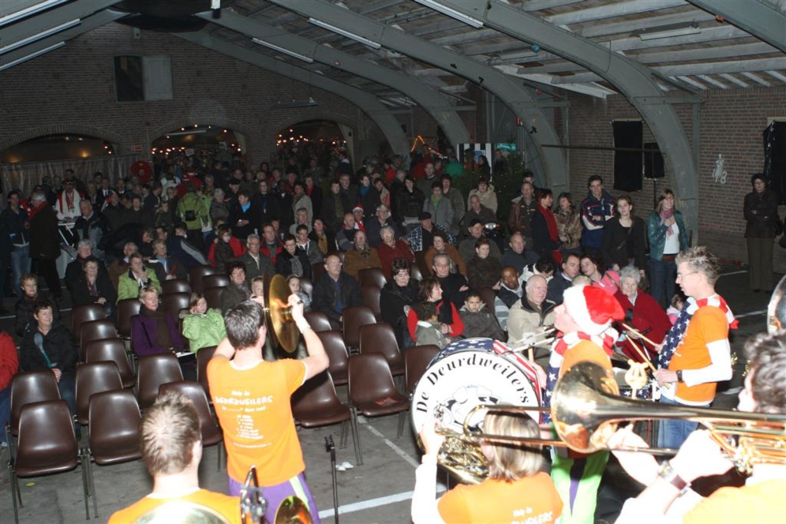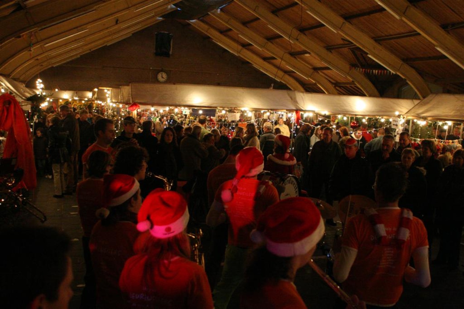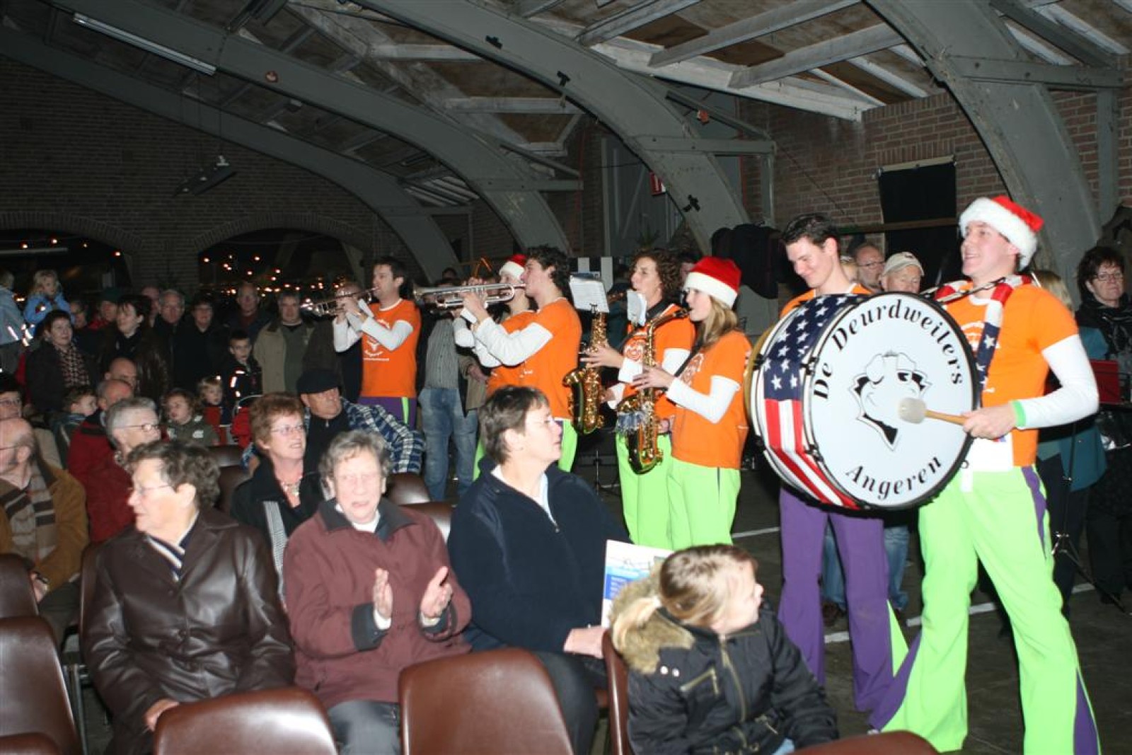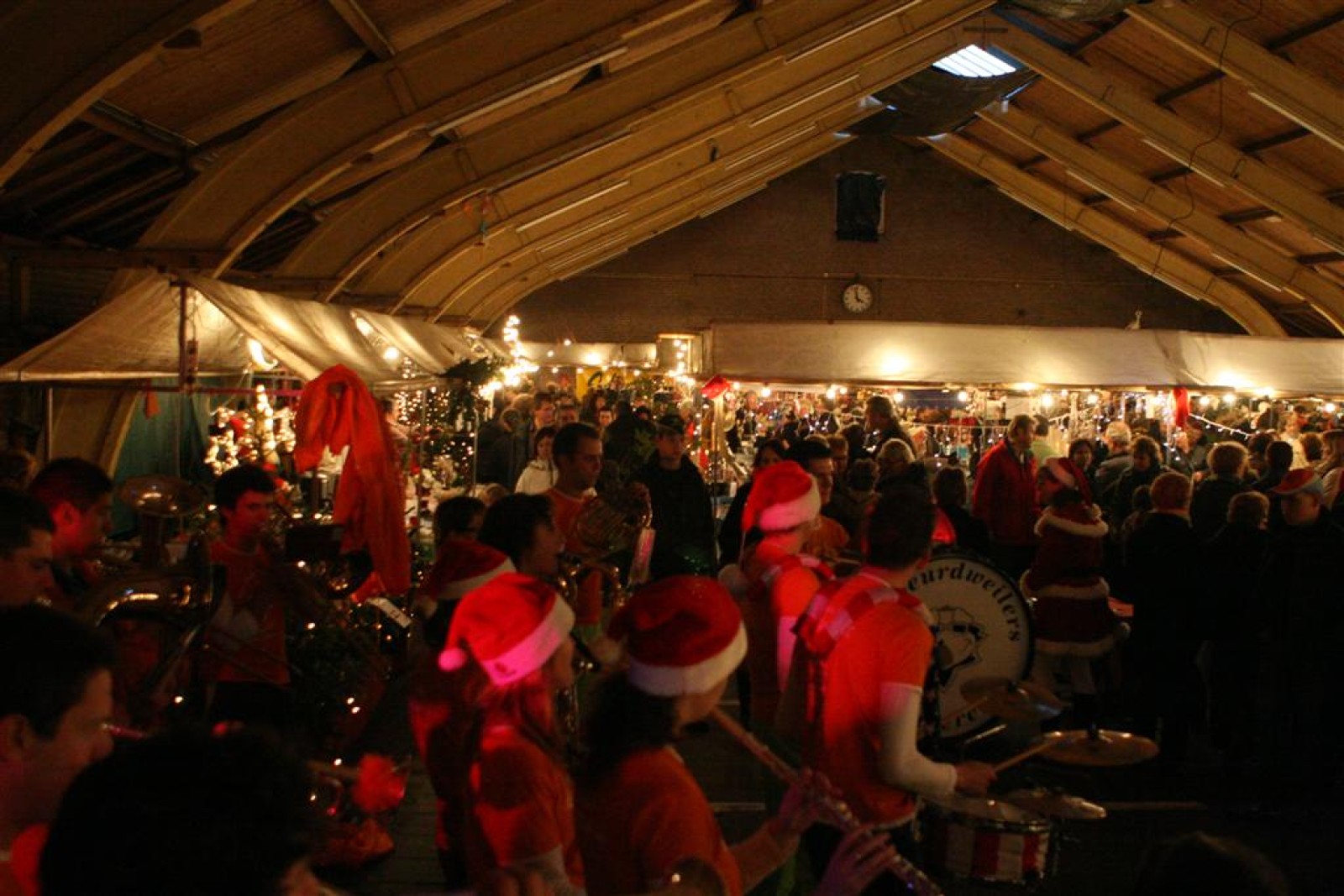 Het was mooi weer, dus zo marcheerden we fier richting de markthal en het nieuwe hypermoderne bejaardentehuis. Voor de deur speelden we even in en daarna marcheerden we al voeten vegend naar binnen. Wat een lekkere accoustiek zeg! En de nieuwe nummers gingen ook goed! Ik krijg er al een goed gevoel bij en ze kunnen alleen nog maar beter gaan! Nog ff K3 voor het jonge publiek en daarna ff een rustmomentje. De één keek wat rond en de ander ging nog ff op de sfeerfoto bij Henk. En in het café dronken we wat en aten we alle kerstkransjes op. En daarna gauw naar de markthal, waar we voor ons volgend optreden verwacht werden.