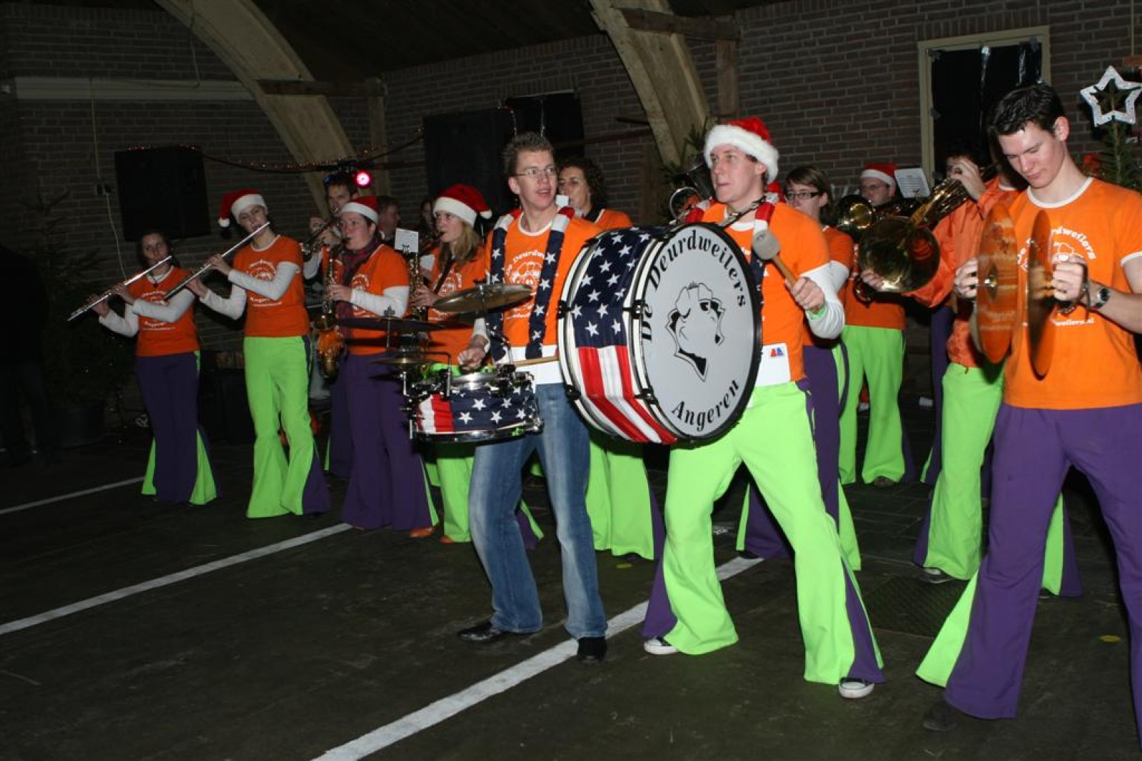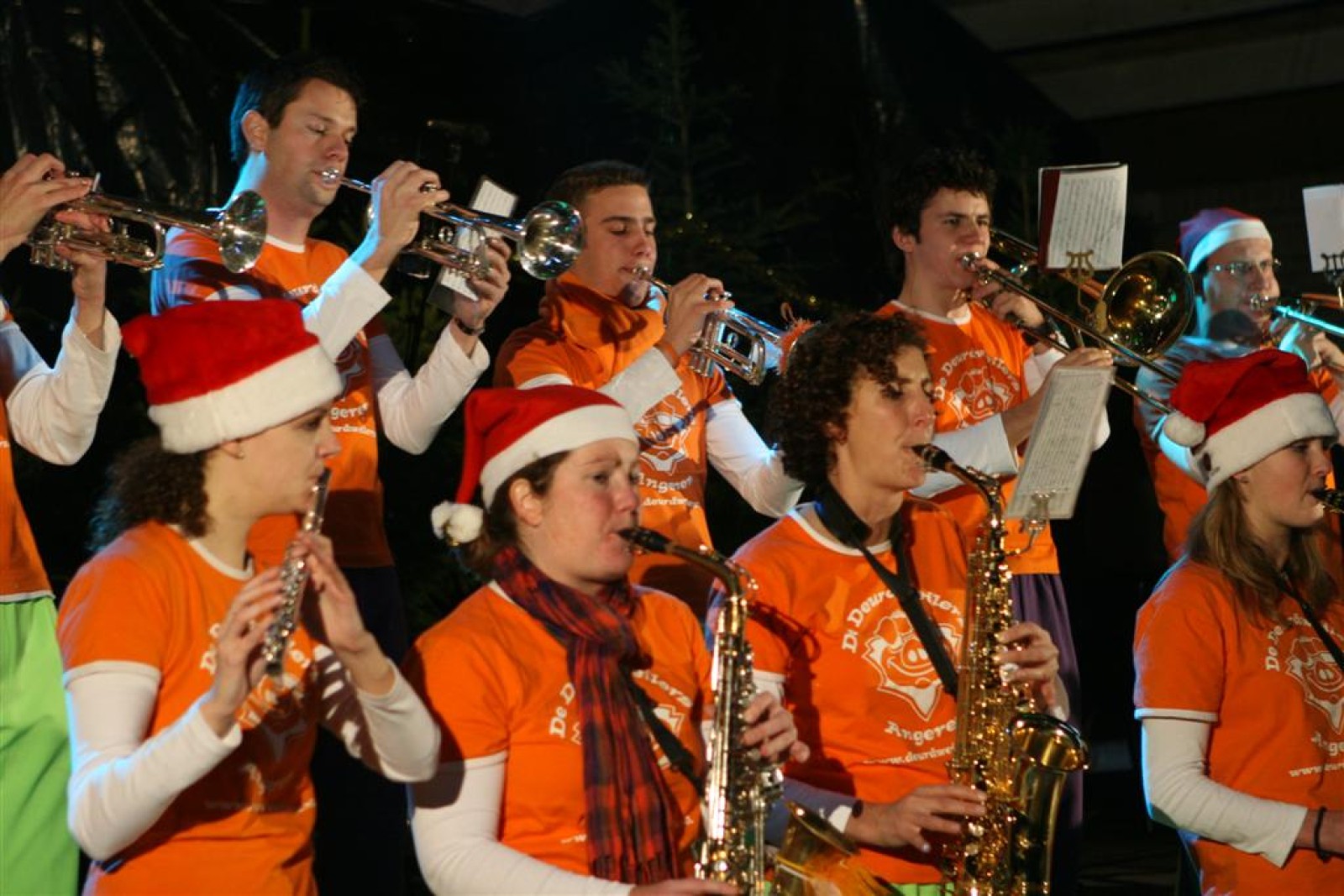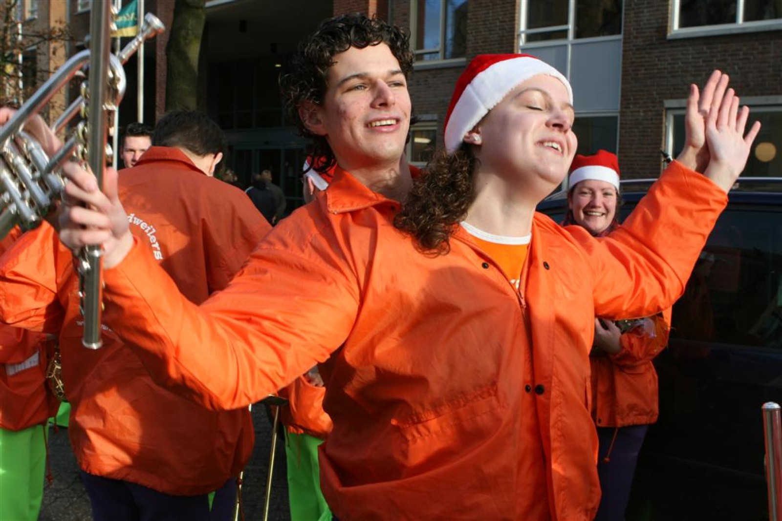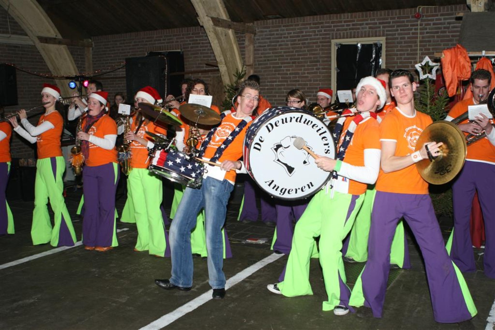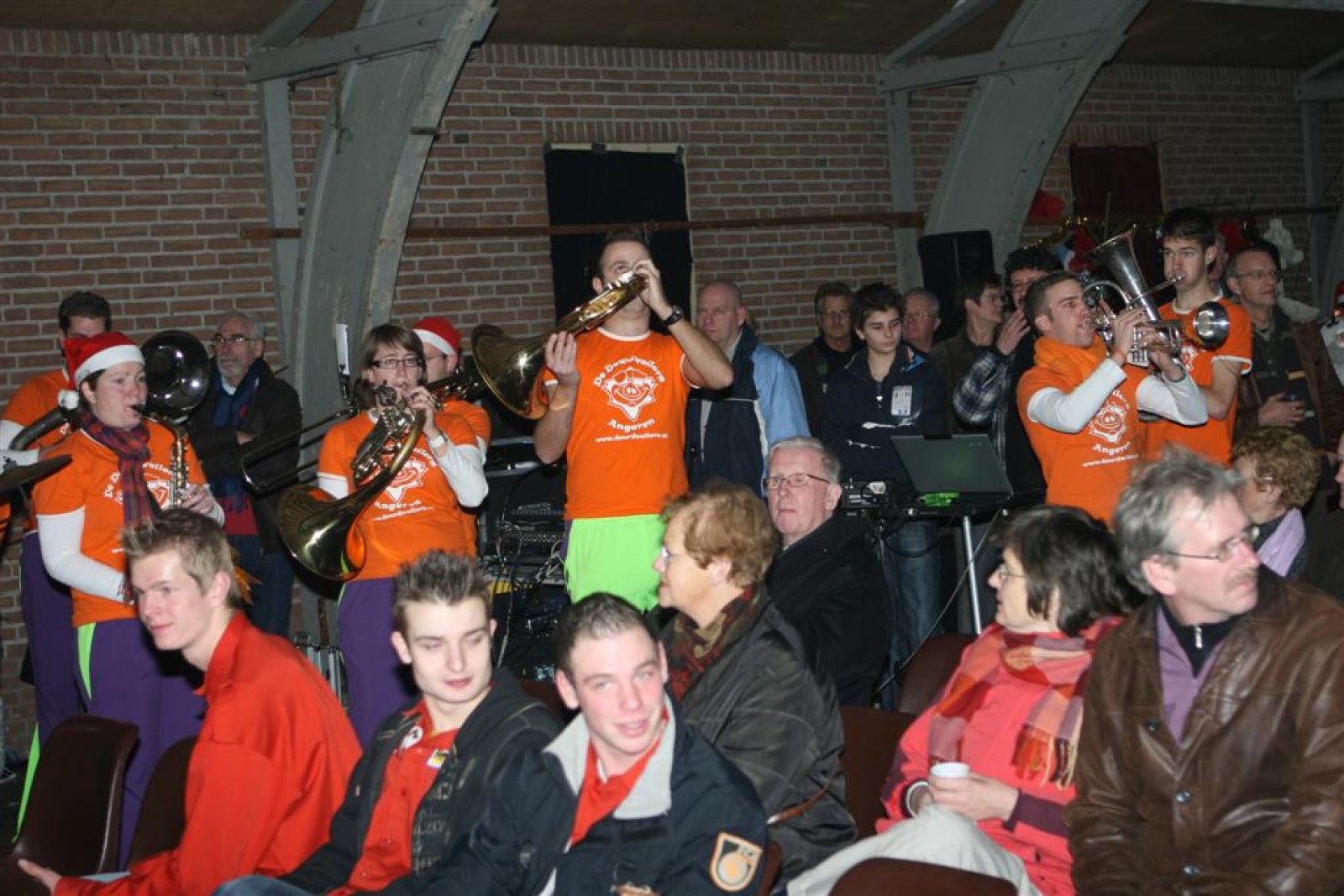 Het was mooi weer, dus zo marcheerden we fier richting de markthal en het nieuwe hypermoderne bejaardentehuis. Voor de deur speelden we even in en daarna marcheerden we al voeten vegend naar binnen. Wat een lekkere accoustiek zeg! En de nieuwe nummers gingen ook goed! Ik krijg er al een goed gevoel bij en ze kunnen alleen nog maar beter gaan! Nog ff K3 voor het jonge publiek en daarna ff een rustmomentje. De één keek wat rond en de ander ging nog ff op de sfeerfoto bij Henk. En in het café dronken we wat en aten we alle kerstkransjes op. En daarna gauw naar de markthal, waar we voor ons volgend optreden verwacht werden.