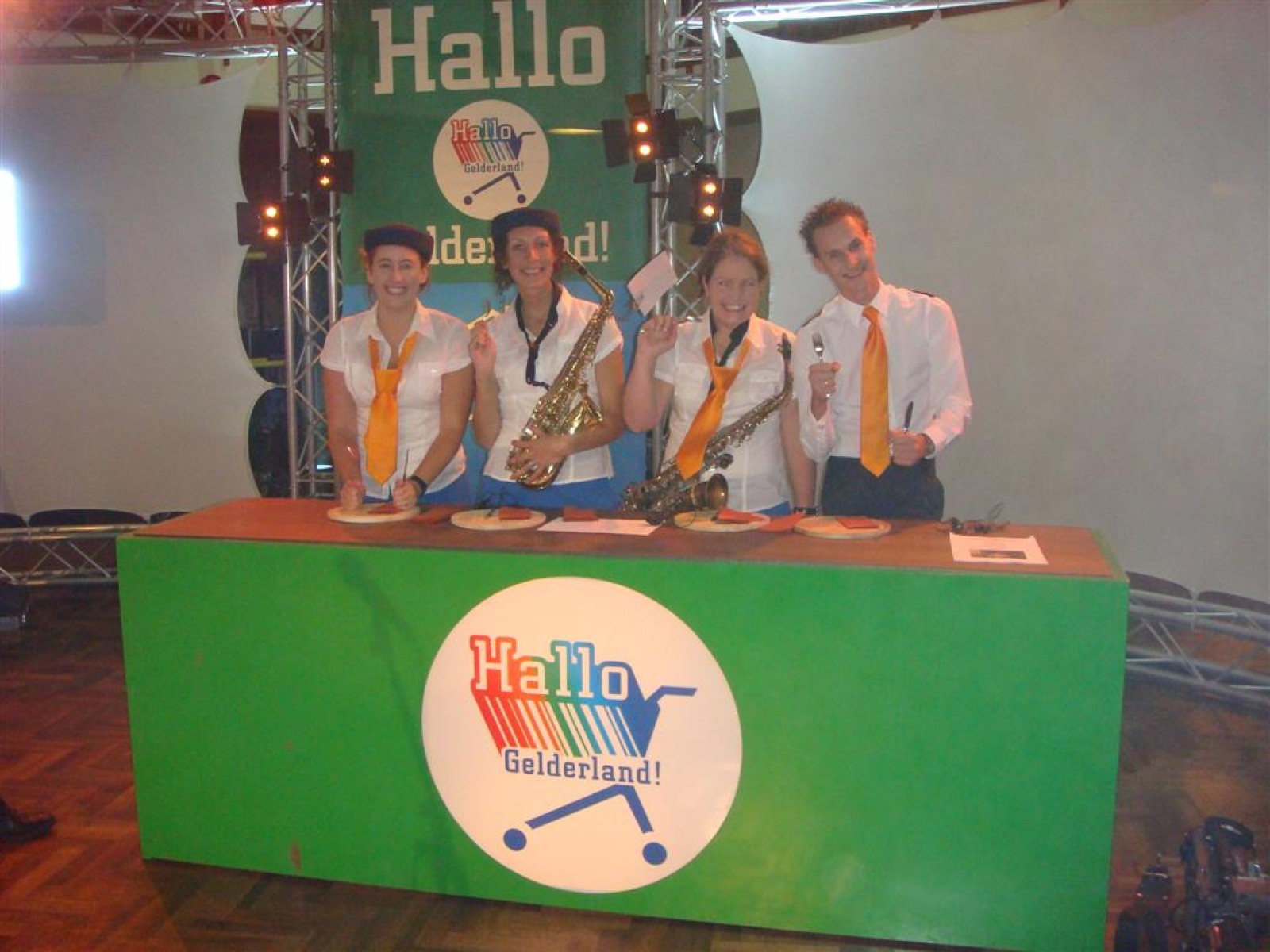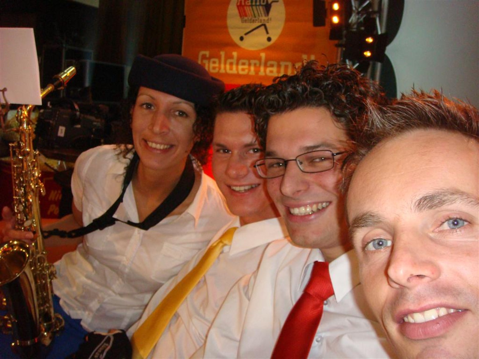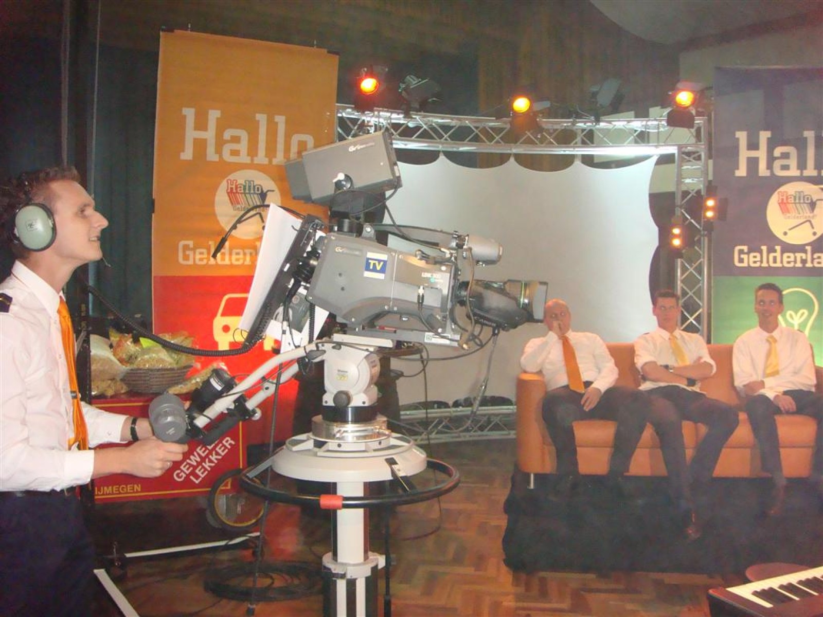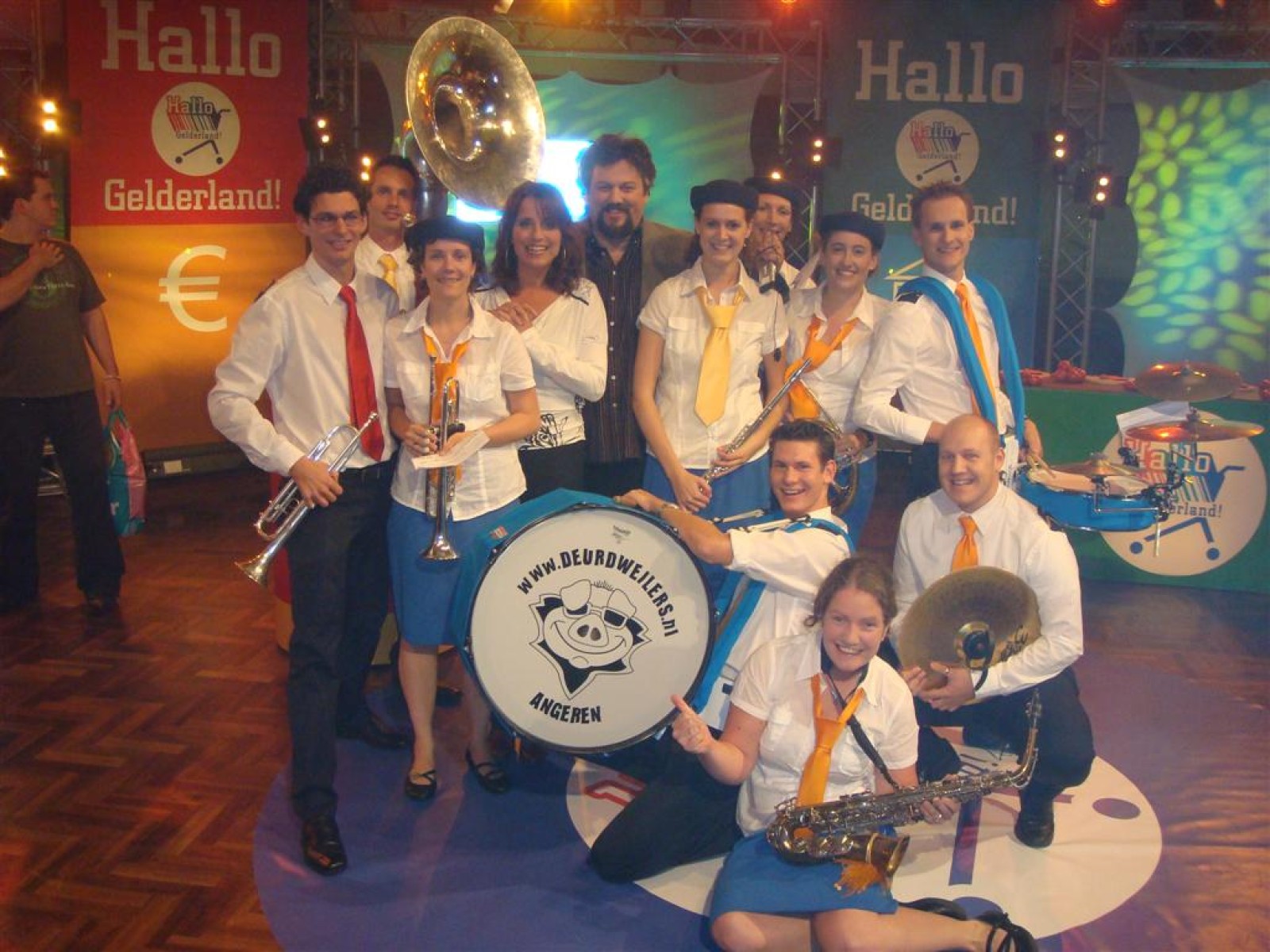 Hallo Gelderland is dit seizoen ‘on tour’, wat betekent dat ze naar de mensen toe gaan. Dit resulteerde vanavond in een gezellige opname op lokatie in het Wapen van Bemmel. En wij vond het natuurlijk superleuk toen ze ons vroegen om de tune te spelen. Dus zo stonden we om vijf uur al klaar voor de soundcheck, welke na de broodjes, grime en repetitie plaats vond. En de Deurdweilers zouden de Deurdweilers niet zijn, als ze niet even met de presentatoren Irene en Rob op de foto gingen. Ook werden nog even alle posities voorgetest, achter de testtafel, op de bank, achter de camera. Check, de opnames kunnen beginnen!