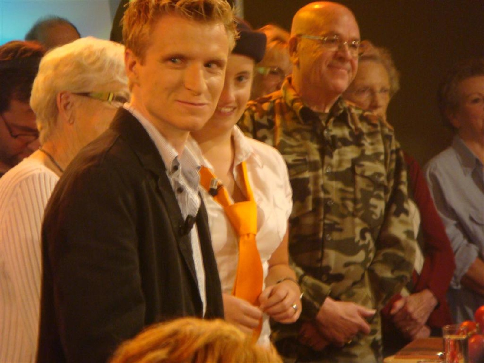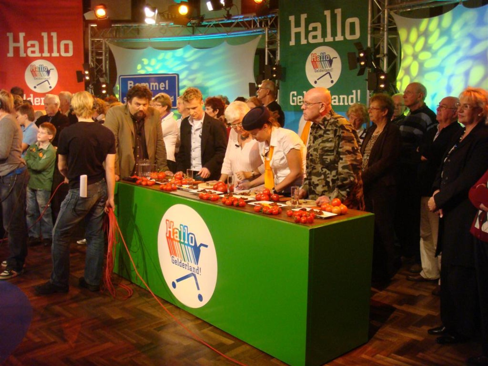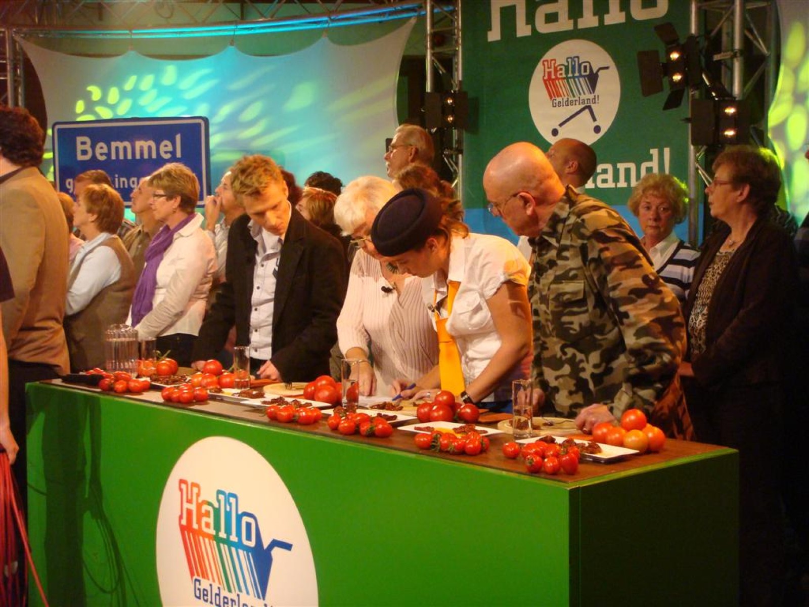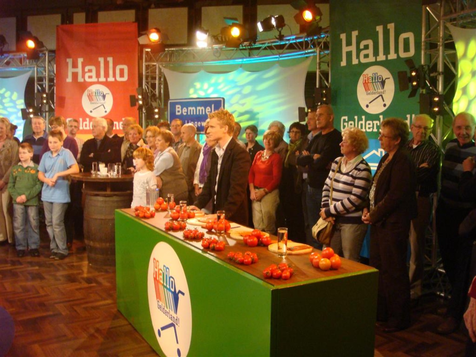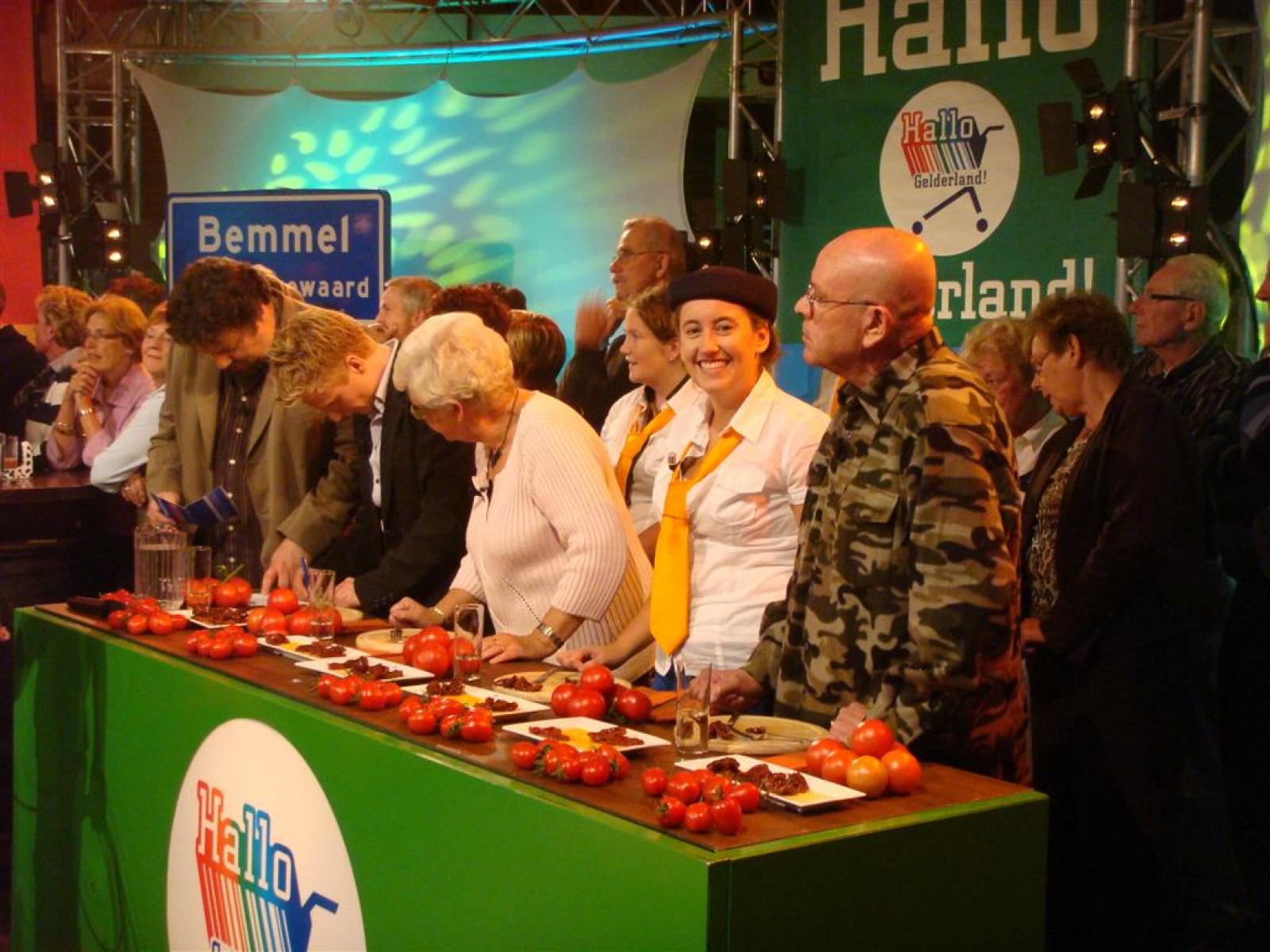 Even na zeven uur was het publiek ook binnen en ging de opname van start: 5, 4, 3, 2, 1 en Tijn tikte af. De 17 seconden (we hebben het getimed) van fame begonnen. Na het spelen kwamen Irene en Rob tussen ons doorgelopen en kregen wij nog een warm applaus. Na de opening hadden we 3 minuten de tijd om onze instrumenten weg te leggen en ons bij het publiek te voegen. Inge, Maaike en Mark hadden een plekje achter de testtafel, dus zo konden we mooi zien wat er getest werd. Er werden drie vrijwilligers gezocht, misschien een dame van de Deurdweilers? En Rob wees Inge aan, en alhoewel ze zongedroogde tomaten eigenlijk niet zo lekker vindt, deed ze toch mee aan de test! Verderop in het publiek zagen we ook nog een paar Angerse fans van Hallo Gelderland én van de Deurdweilers. Mama Bertha, Ans en Els zie je misschien ook nog wel terug op de opname!