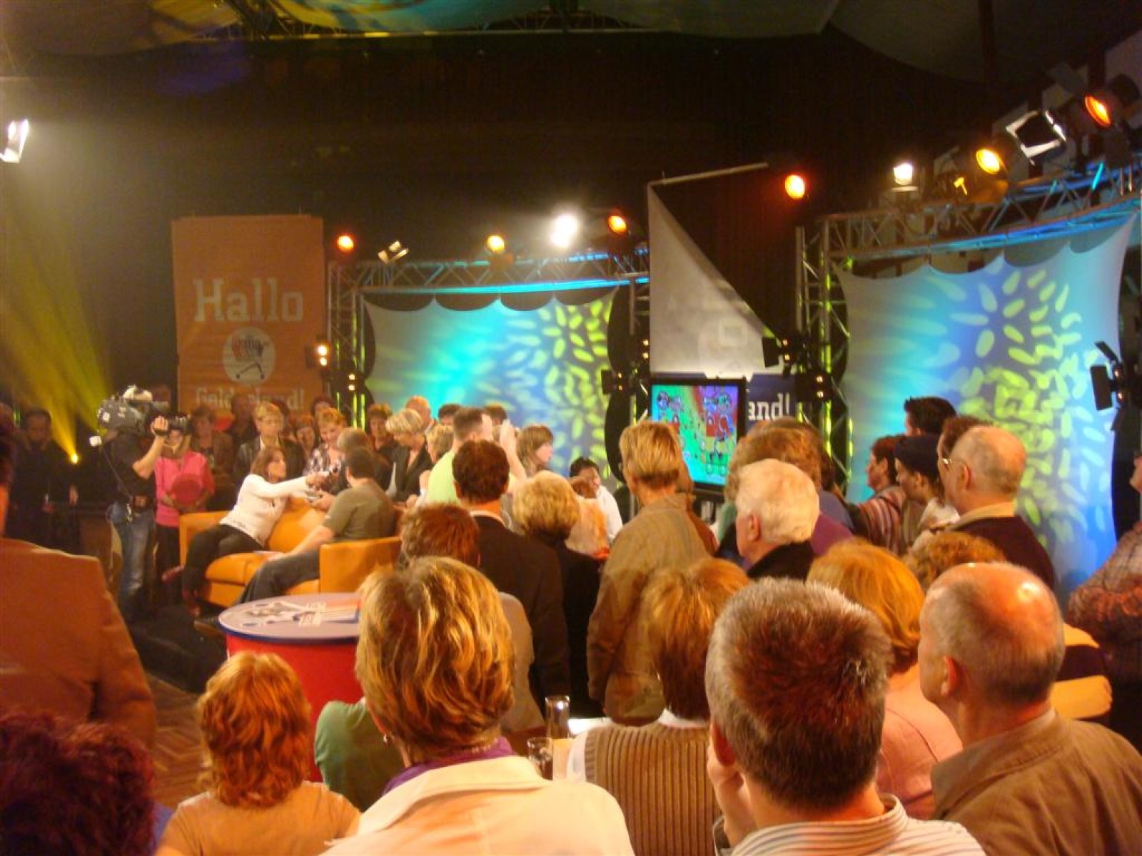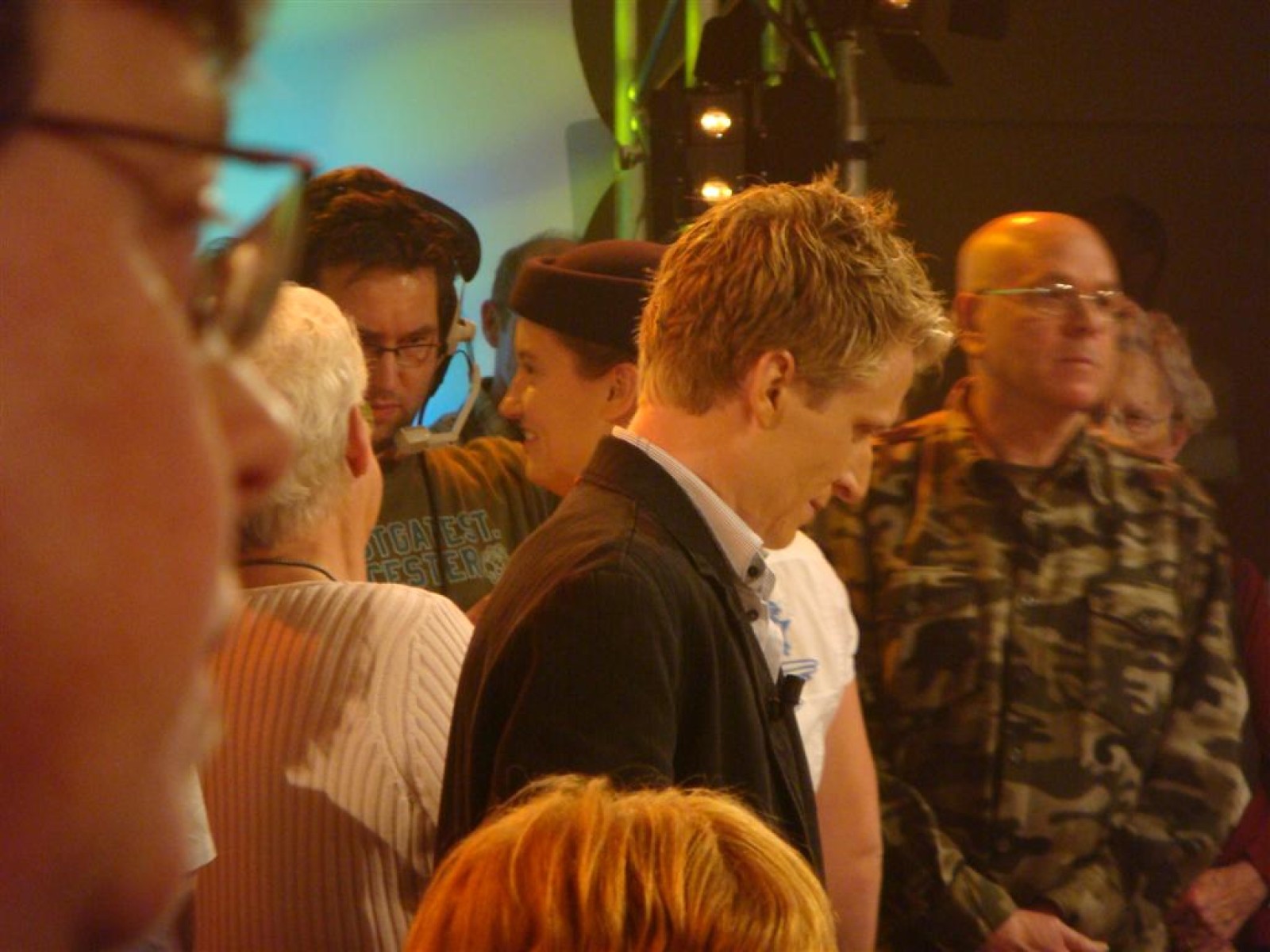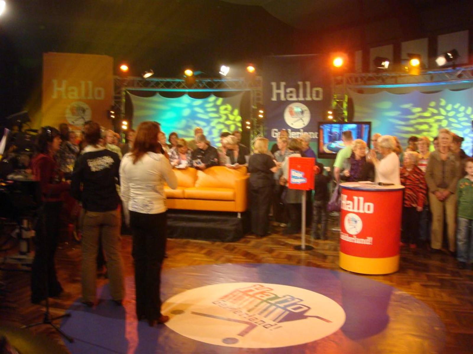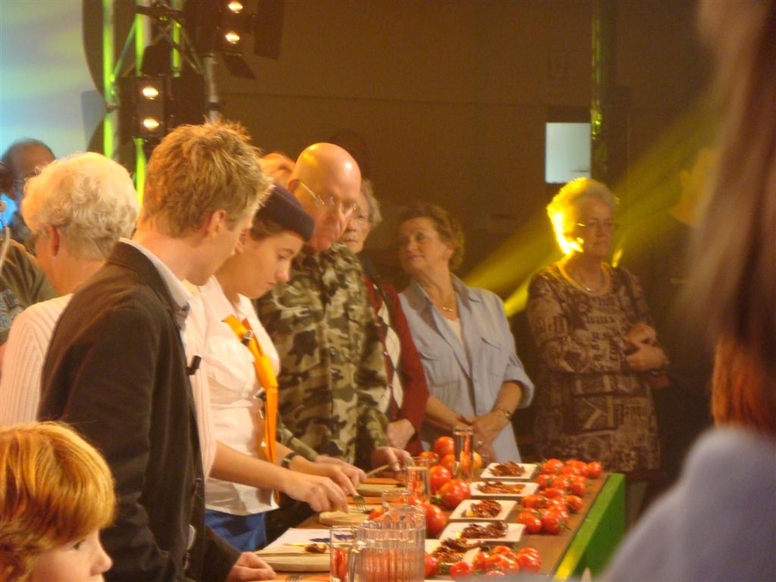 Even na zeven uur was het publiek ook binnen en ging de opname van start: 5, 4, 3, 2, 1 en Tijn tikte af. De 17 seconden (we hebben het getimed) van fame begonnen. Na het spelen kwamen Irene en Rob tussen ons doorgelopen en kregen wij nog een warm applaus. Na de opening hadden we 3 minuten de tijd om onze instrumenten weg te leggen en ons bij het publiek te voegen. Inge, Maaike en Mark hadden een plekje achter de testtafel, dus zo konden we mooi zien wat er getest werd. Er werden drie vrijwilligers gezocht, misschien een dame van de Deurdweilers? En Rob wees Inge aan, en alhoewel ze zongedroogde tomaten eigenlijk niet zo lekker vindt, deed ze toch mee aan de test! Verderop in het publiek zagen we ook nog een paar Angerse fans van Hallo Gelderland én van de Deurdweilers. Mama Bertha, Ans en Els zie je misschien ook nog wel terug op de opname!
