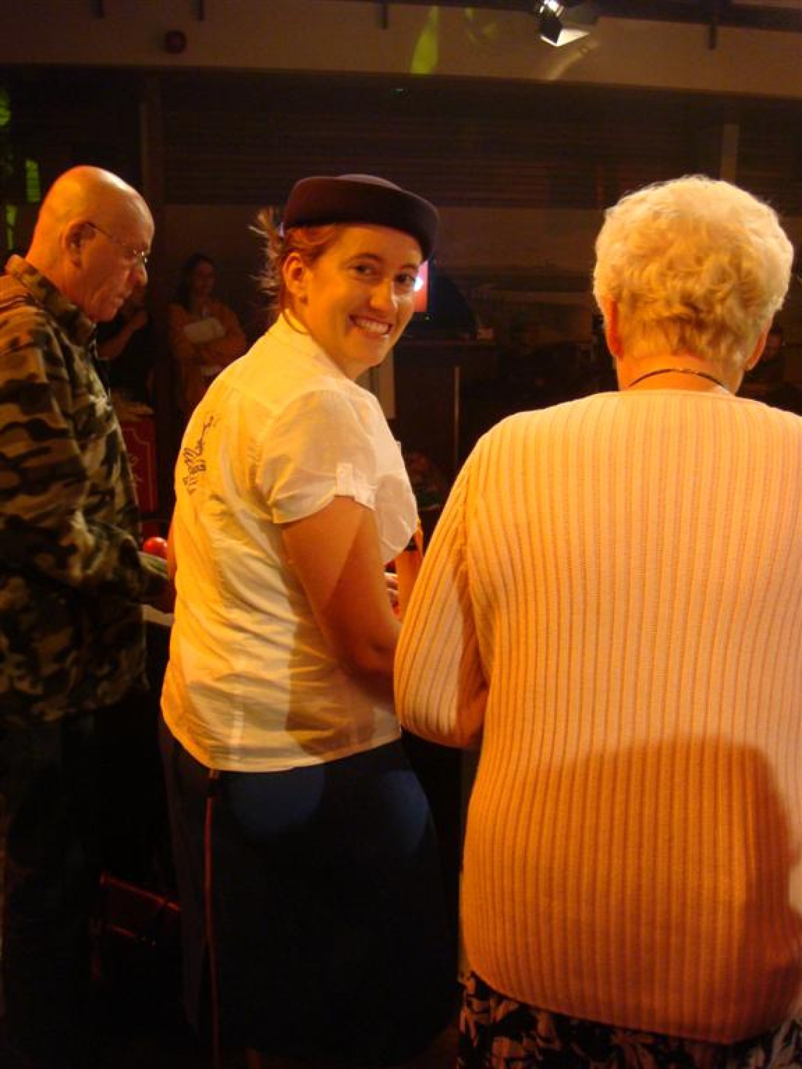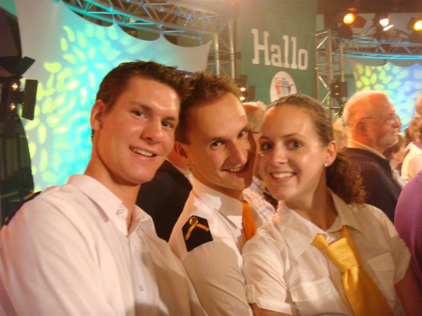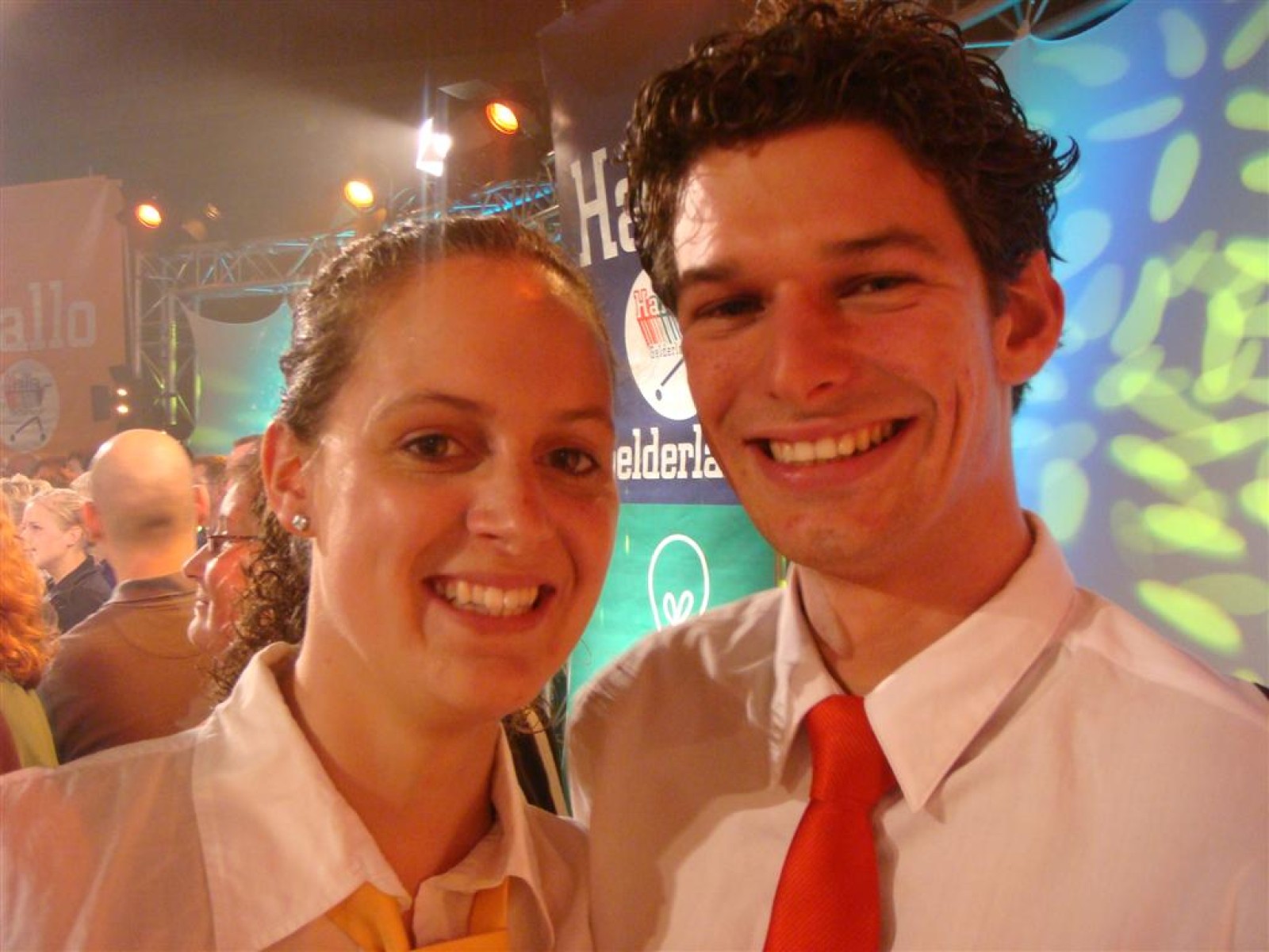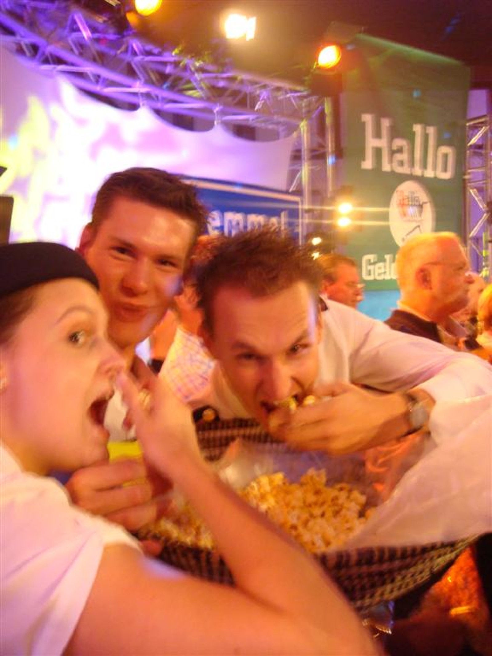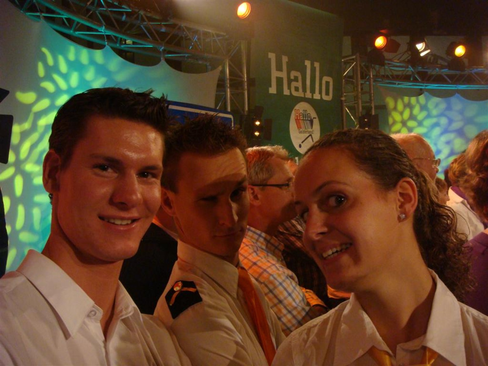 Even na zeven uur was het publiek ook binnen en ging de opname van start: 5, 4, 3, 2, 1 en Tijn tikte af. De 17 seconden (we hebben het getimed) van fame begonnen. Na het spelen kwamen Irene en Rob tussen ons doorgelopen en kregen wij nog een warm applaus. Na de opening hadden we 3 minuten de tijd om onze instrumenten weg te leggen en ons bij het publiek te voegen. Inge, Maaike en Mark hadden een plekje achter de testtafel, dus zo konden we mooi zien wat er getest werd. Er werden drie vrijwilligers gezocht, misschien een dame van de Deurdweilers? En Rob wees Inge aan, en alhoewel ze zongedroogde tomaten eigenlijk niet zo lekker vindt, deed ze toch mee aan de test! Verderop in het publiek zagen we ook nog een paar Angerse fans van Hallo Gelderland én van de Deurdweilers. Mama Bertha, Ans en Els zie je misschien ook nog wel terug op de opname!
