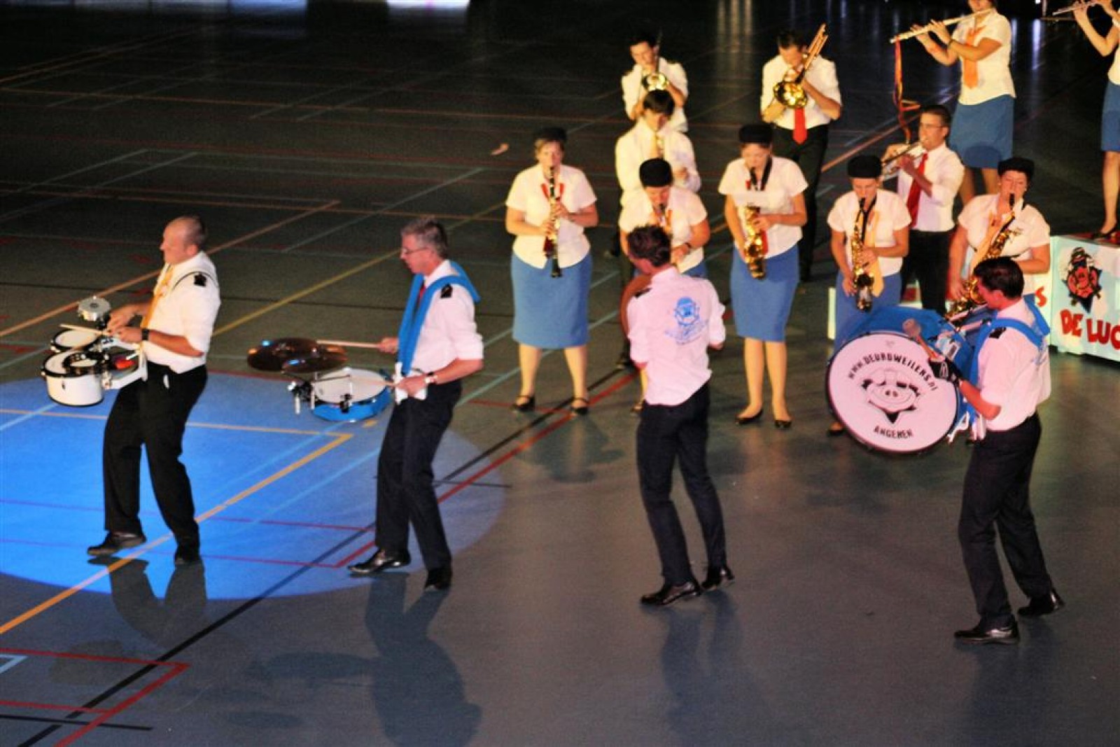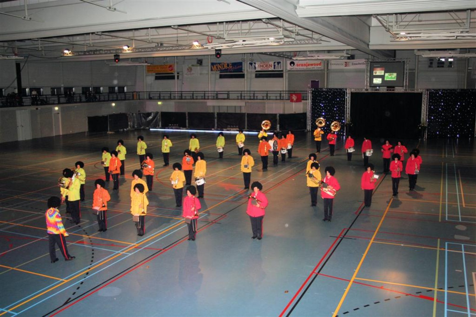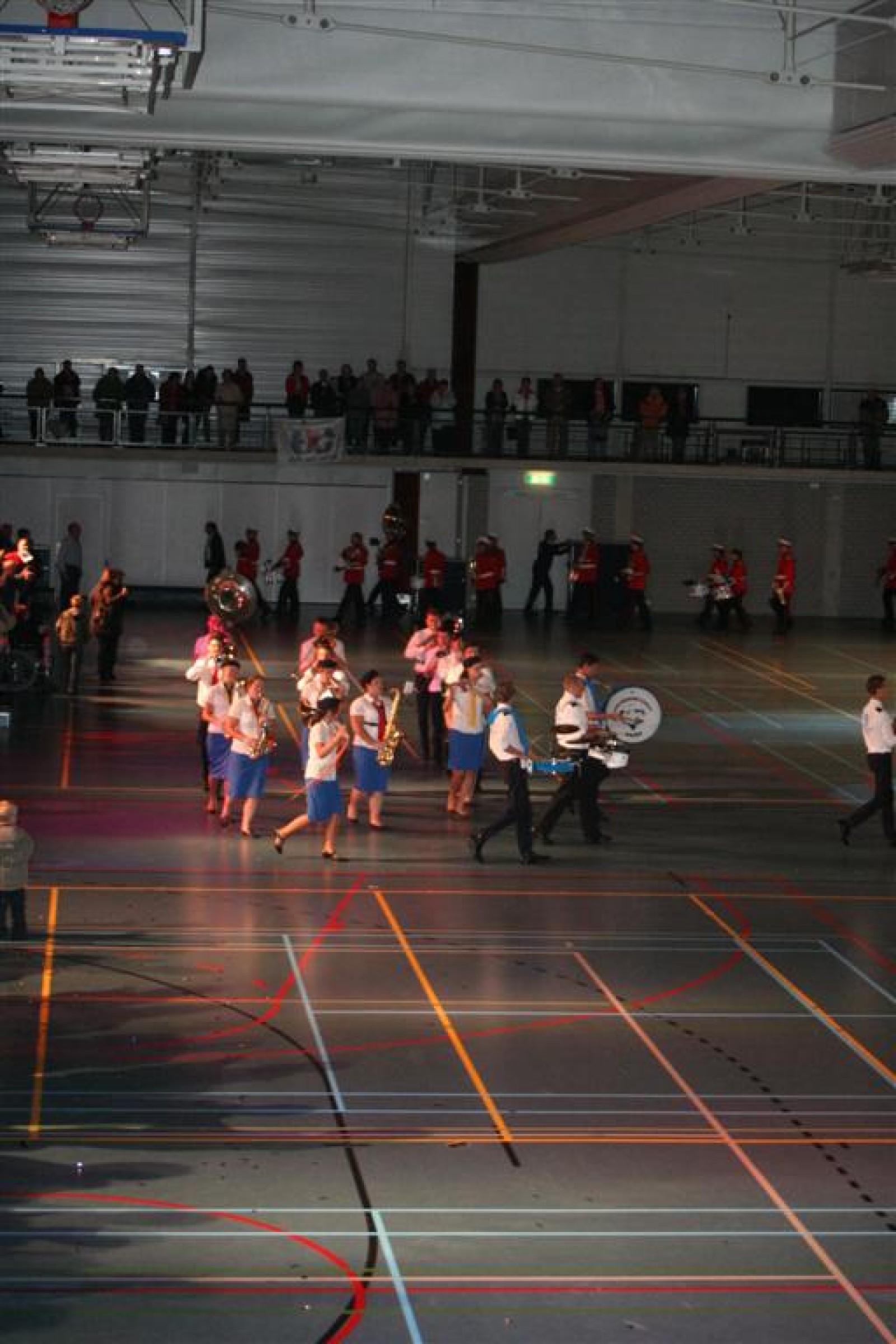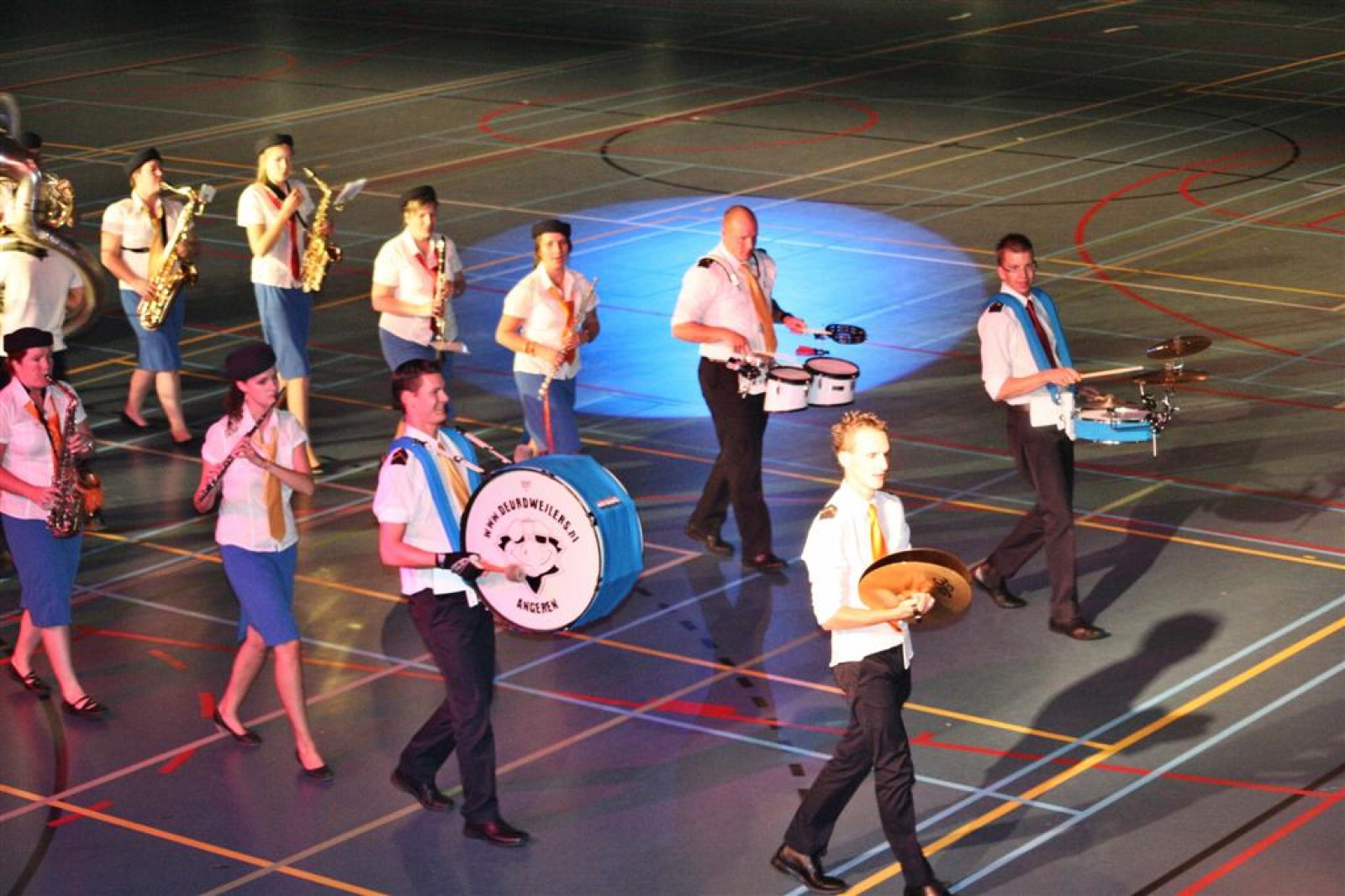 In Angeren kennen de Deurdweilers maar een paar kleedkamers en zo waren we dus ook verrast dat we in kleedkamer 14 konden omkleden. Omdat we pas halverwege het programma aan de beurt waren, gingen we eerst op verkenning. Andere gingen alvast het publiek op de tribune opwarmen en voorbereiden op onze komst. Even na negenen begaven we ons helemaal naar de andere kant van de sporthal om op te stellen. Nog even de laatste instructies en daar gingen we dan. We marcheerden op met Iedereen is van de wereld en maakten een paar mooie figuren. En toen gauw opstellen. Gelukkig hadden Willy en Richard de blokken al klaargezet en was Theo Video vanavond undercover als fotograaf.