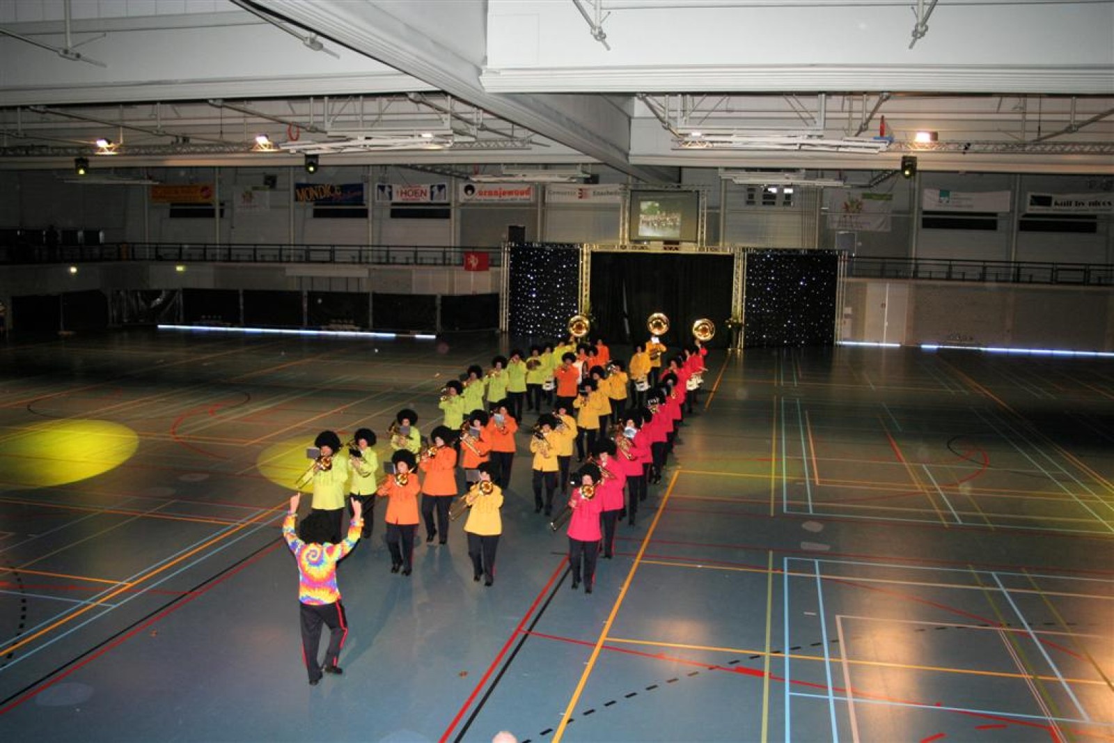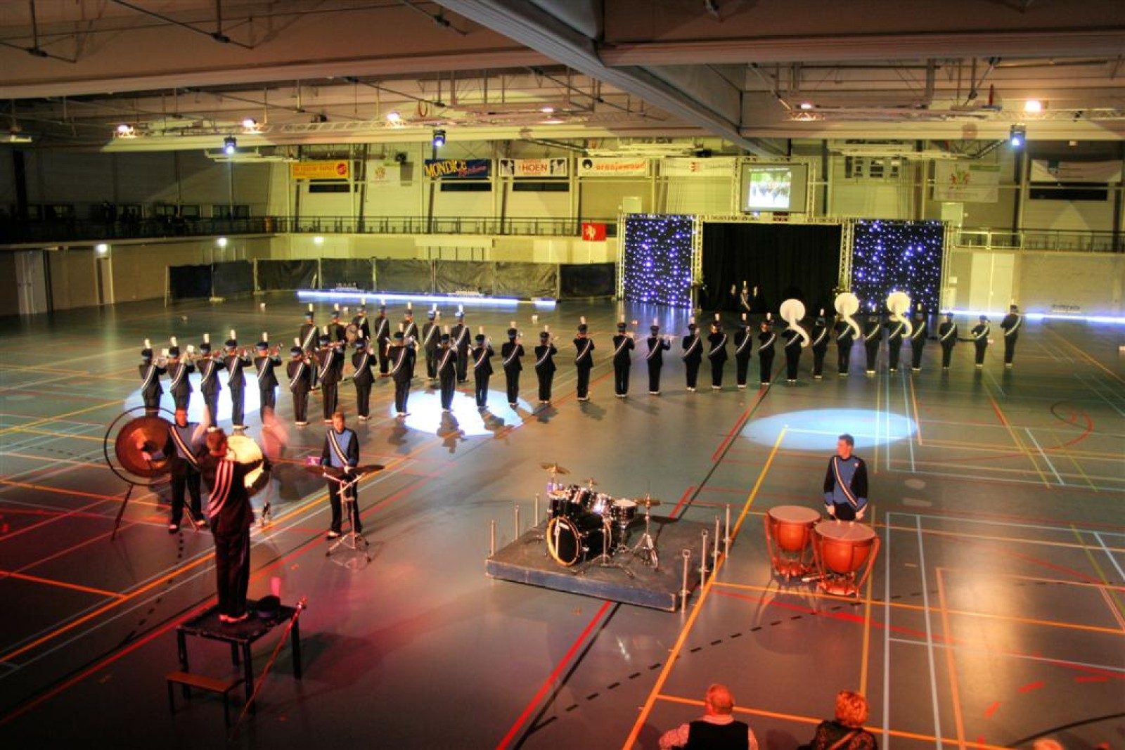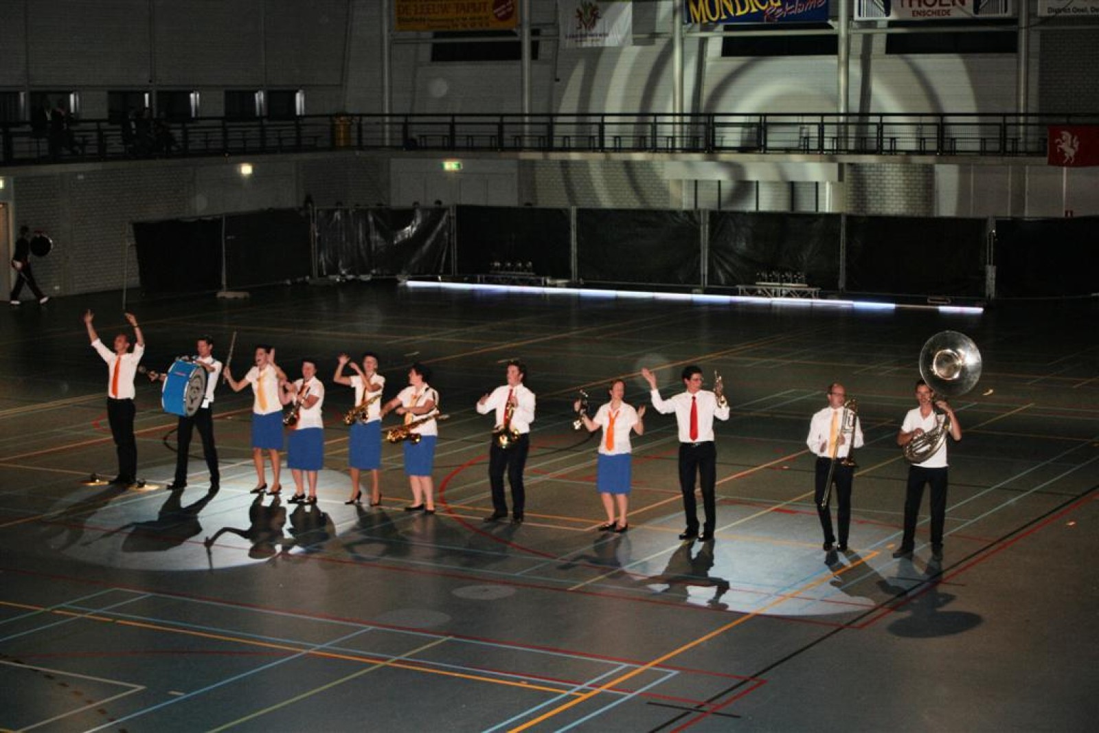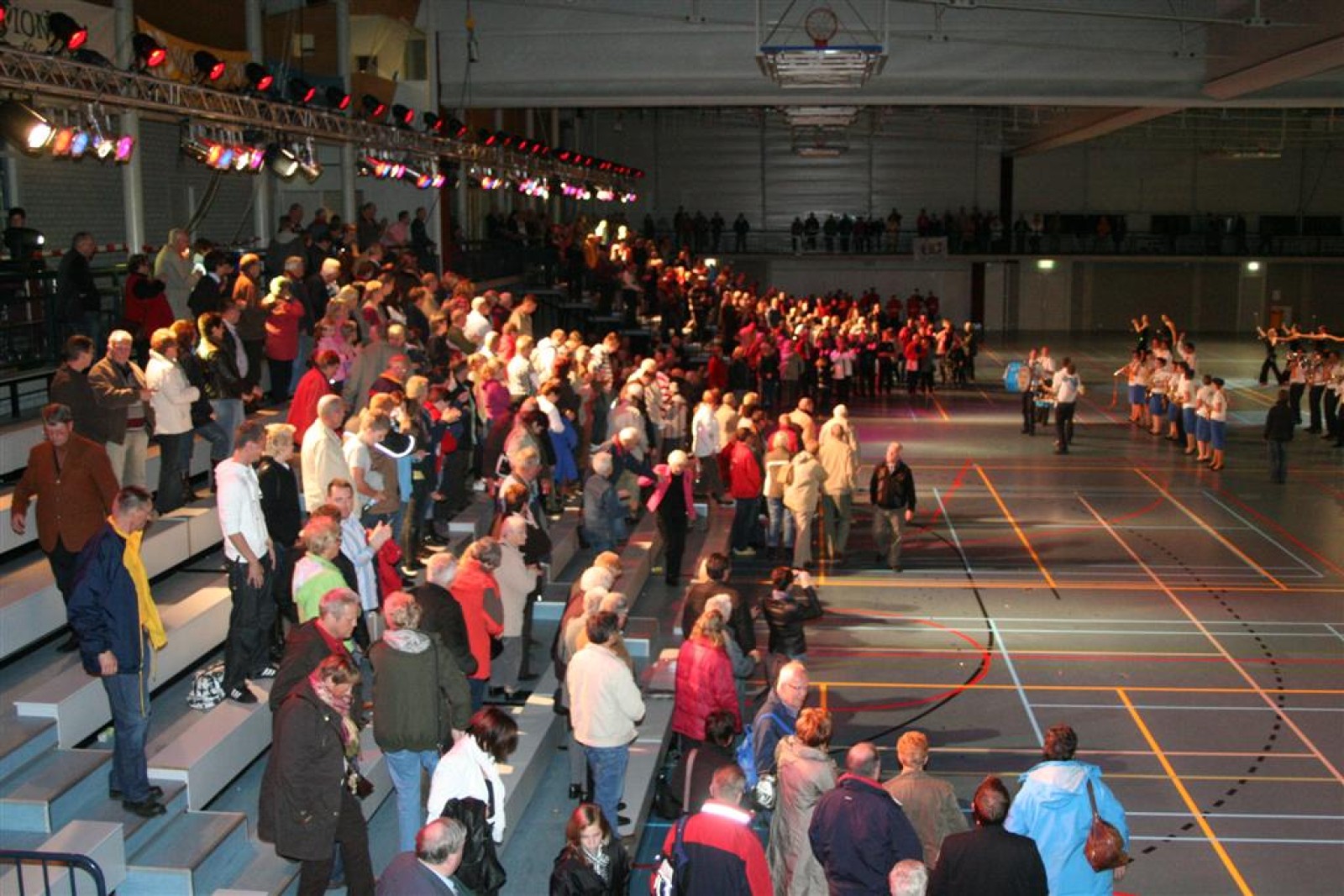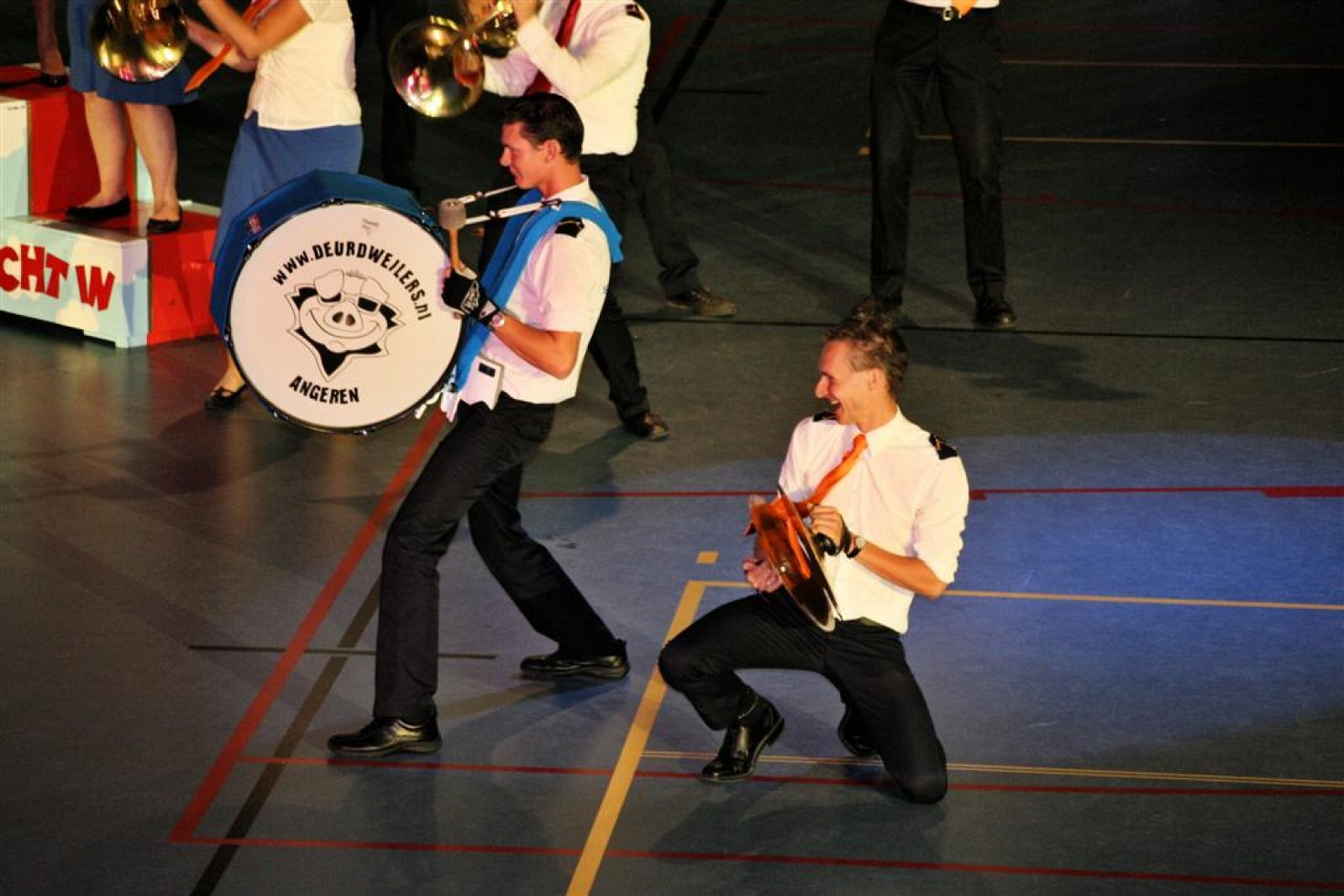 In Angeren kennen de Deurdweilers maar een paar kleedkamers en zo waren we dus ook verrast dat we in kleedkamer 14 konden omkleden. Omdat we pas halverwege het programma aan de beurt waren, gingen we eerst op verkenning. Andere gingen alvast het publiek op de tribune opwarmen en voorbereiden op onze komst. Even na negenen begaven we ons helemaal naar de andere kant van de sporthal om op te stellen. Nog even de laatste instructies en daar gingen we dan. We marcheerden op met Iedereen is van de wereld en maakten een paar mooie figuren. En toen gauw opstellen. Gelukkig hadden Willy en Richard de blokken al klaargezet en was Theo Video vanavond undercover als fotograaf.