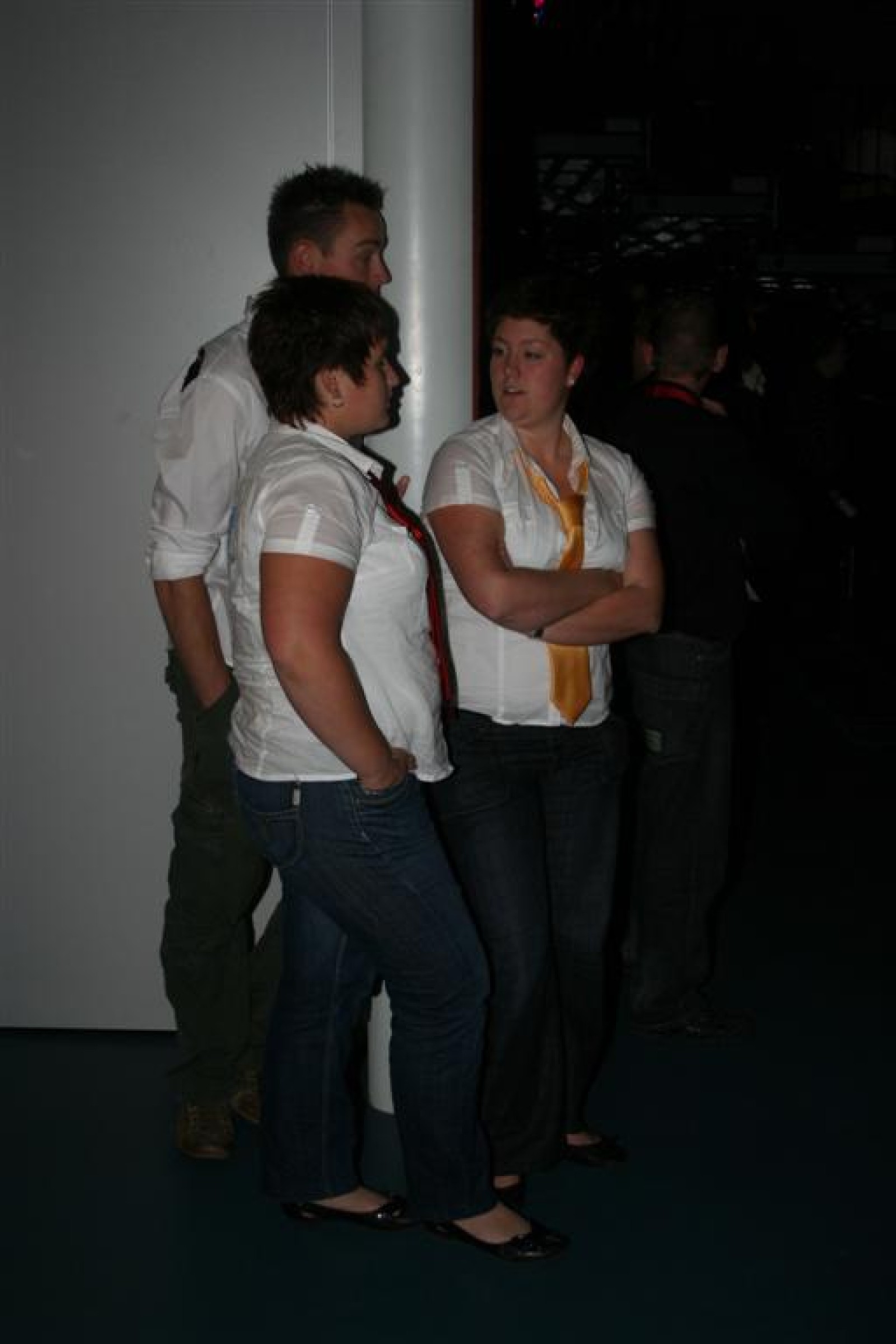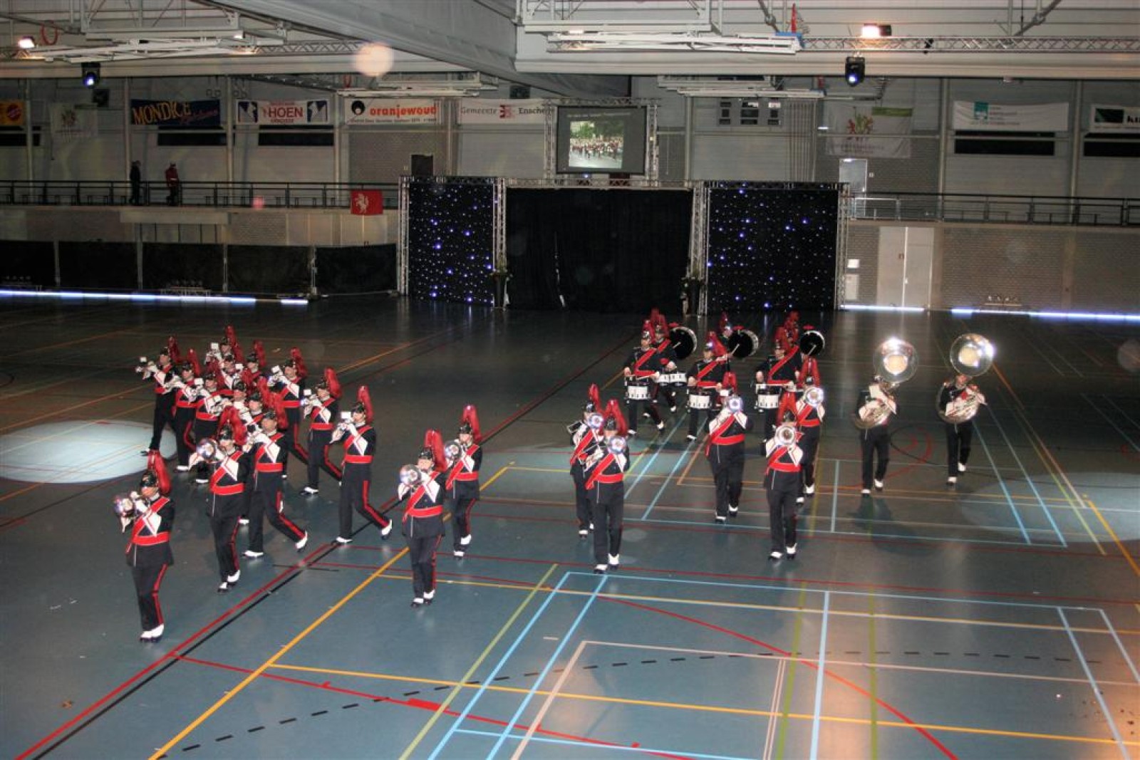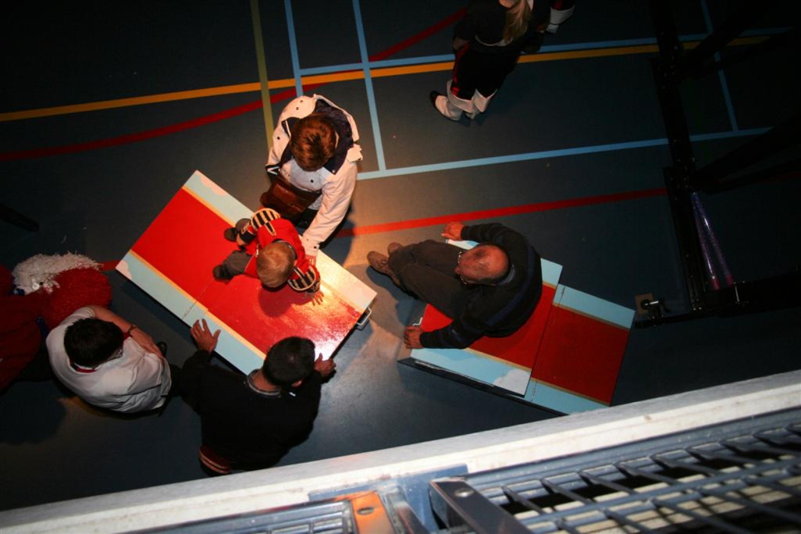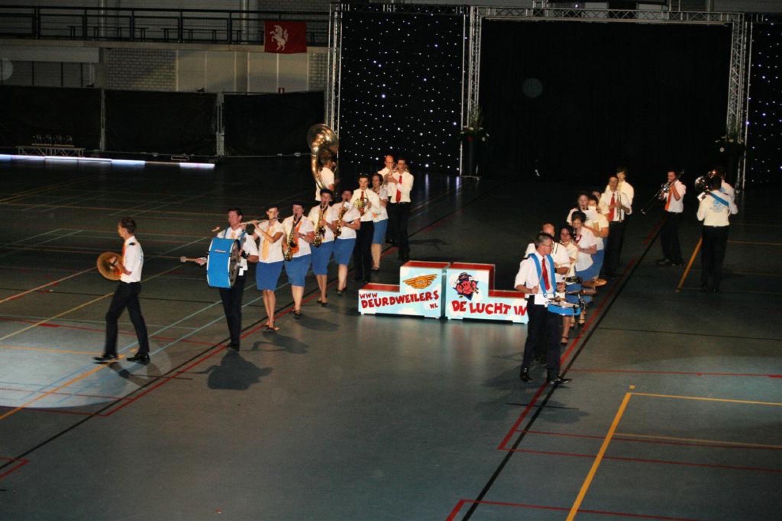 In Angeren kennen de Deurdweilers maar een paar kleedkamers en zo waren we dus ook verrast dat we in kleedkamer 14 konden omkleden. Omdat we pas halverwege het programma aan de beurt waren, gingen we eerst op verkenning. Andere gingen alvast het publiek op de tribune opwarmen en voorbereiden op onze komst. Even na negenen begaven we ons helemaal naar de andere kant van de sporthal om op te stellen. Nog even de laatste instructies en daar gingen we dan. We marcheerden op met Iedereen is van de wereld en maakten een paar mooie figuren. En toen gauw opstellen. Gelukkig hadden Willy en Richard de blokken al klaargezet en was Theo Video vanavond undercover als fotograaf.