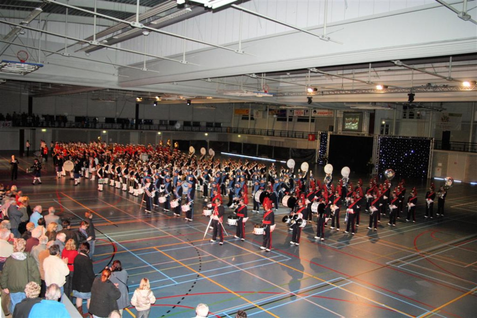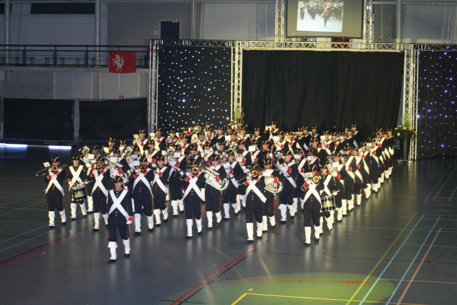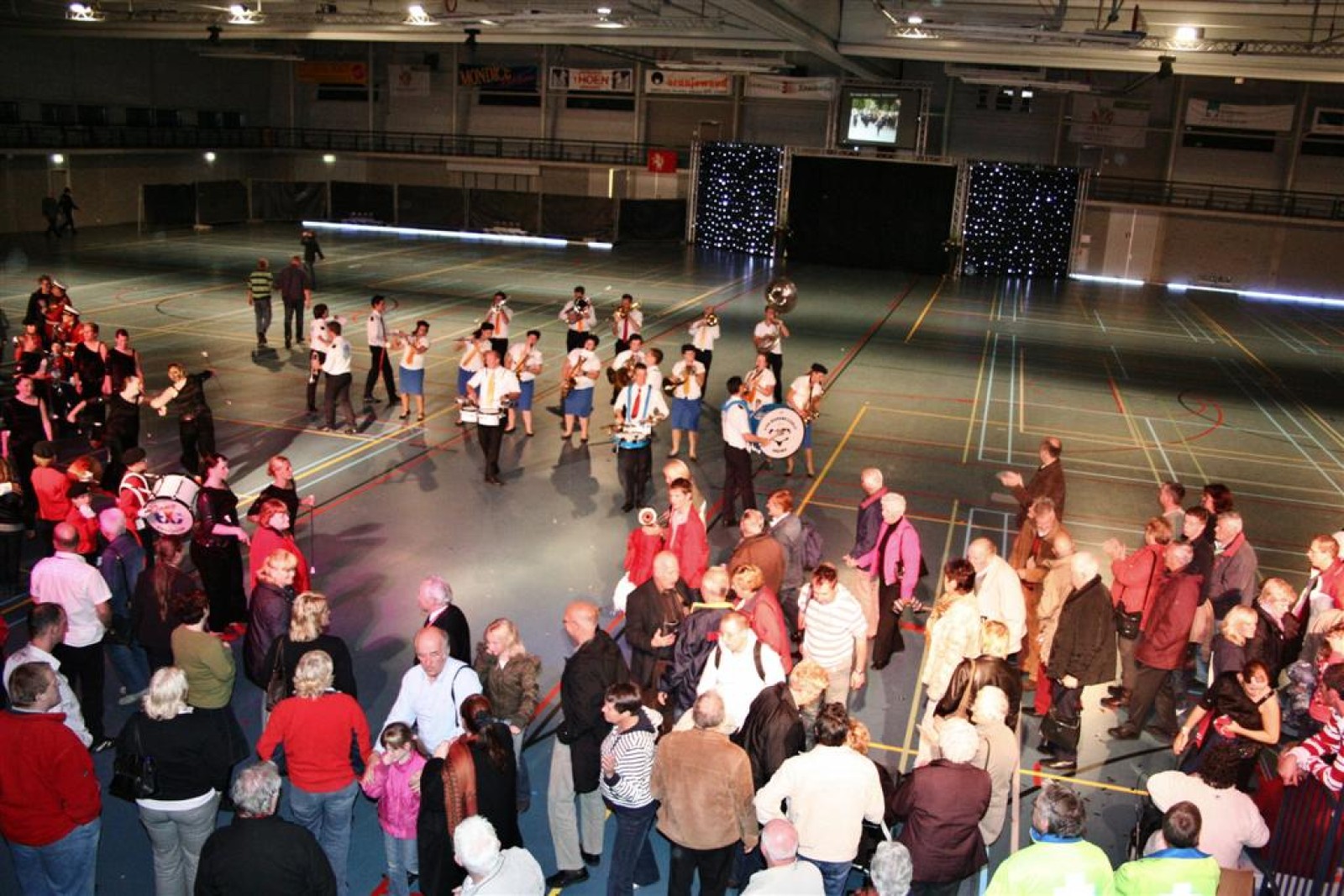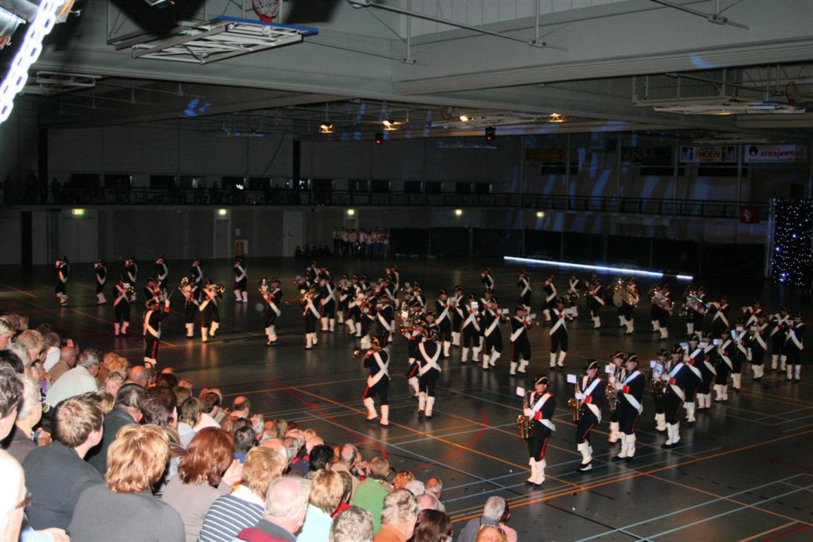 Na een korte break gingen we weer opstellen achter alle andere korpsen. Opmarcheren was onder begeleiding van muziek van een ander korps, dus in drie rijen achter onze tambourmaitre (met bekkens?) Tijn aan. Na een kort praatje werd één van de korpsen in de houding gezet en Tijn doet hem na alsof hij precies weet wat hij doet, en wij volgen hem dan ook gelijk. Het was zo komisch dat het publiek in een deuk ligt van het lachen.