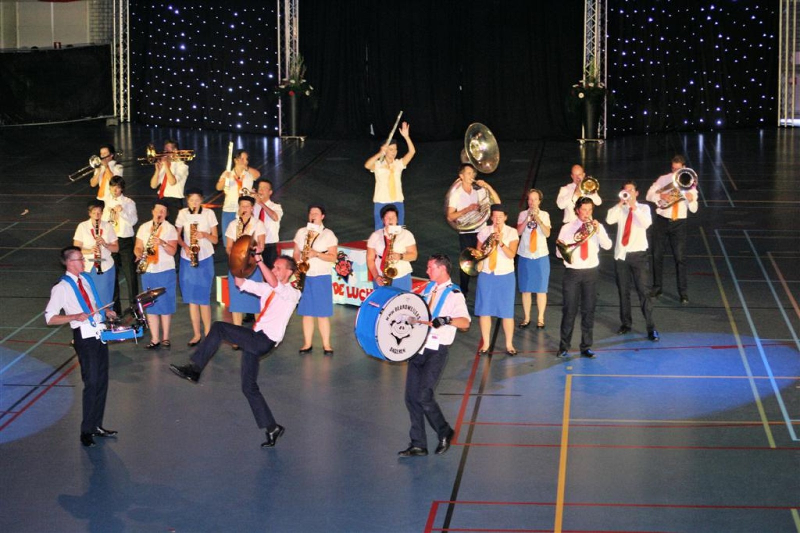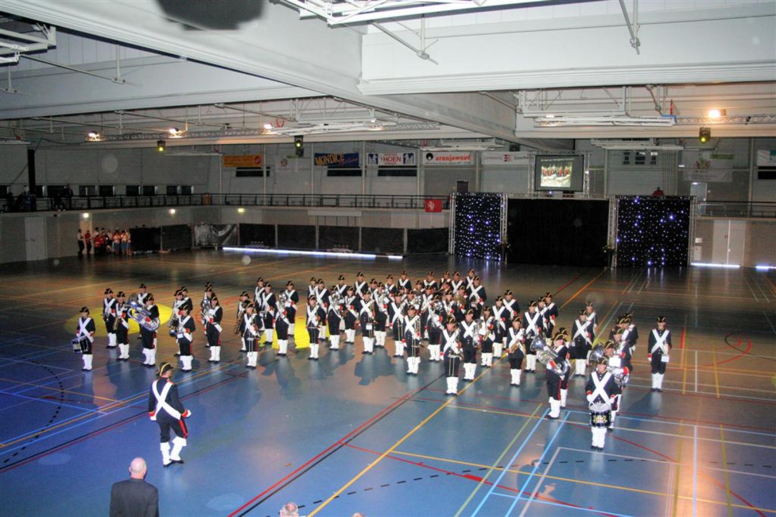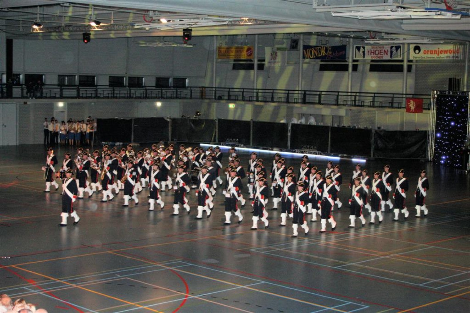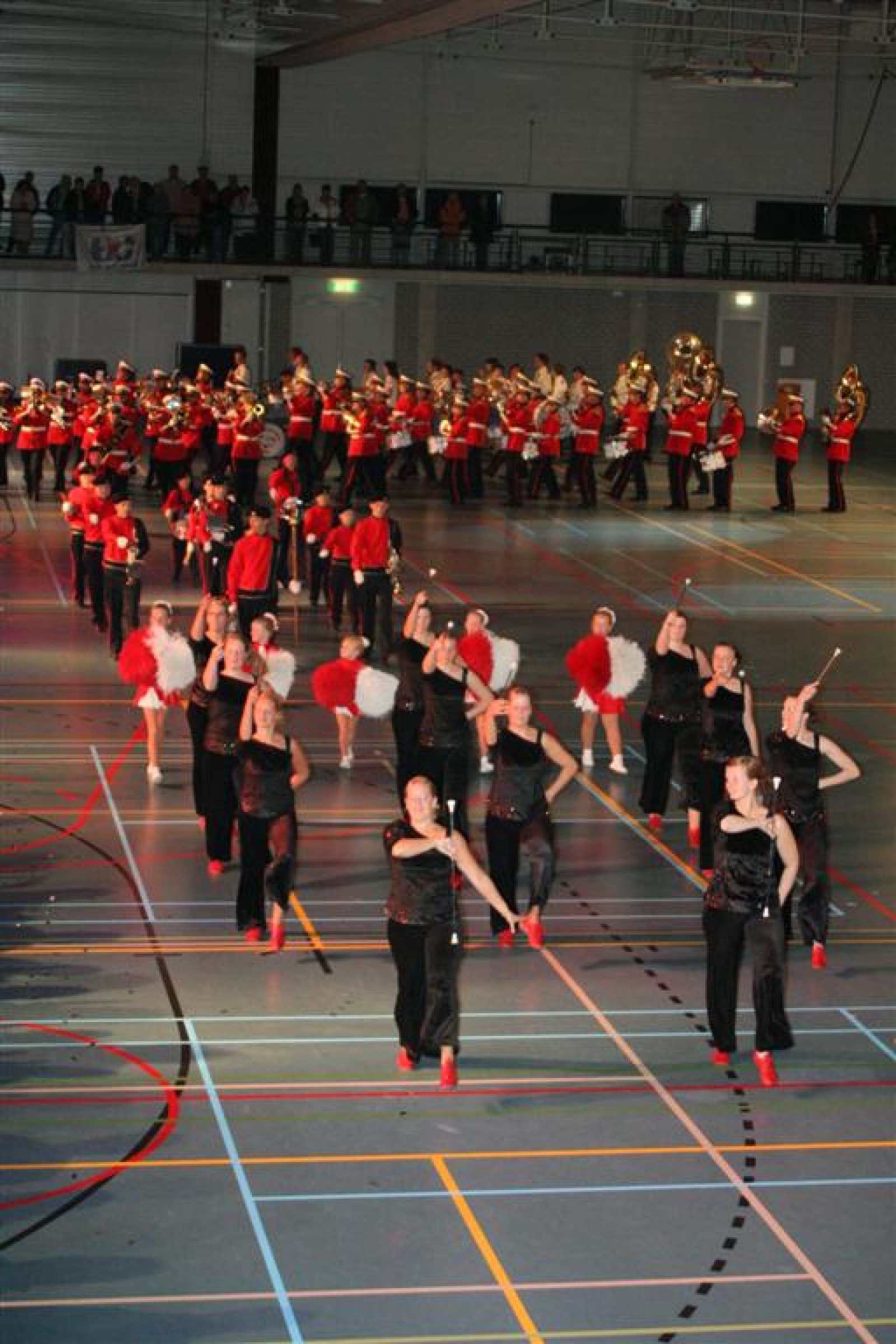 Na een korte break gingen we weer opstellen achter alle andere korpsen. Opmarcheren was onder begeleiding van muziek van een ander korps, dus in drie rijen achter onze tambourmaitre (met bekkens?) Tijn aan. Na een kort praatje werd één van de korpsen in de houding gezet en Tijn doet hem na alsof hij precies weet wat hij doet, en wij volgen hem dan ook gelijk. Het was zo komisch dat het publiek in een deuk ligt van het lachen.
