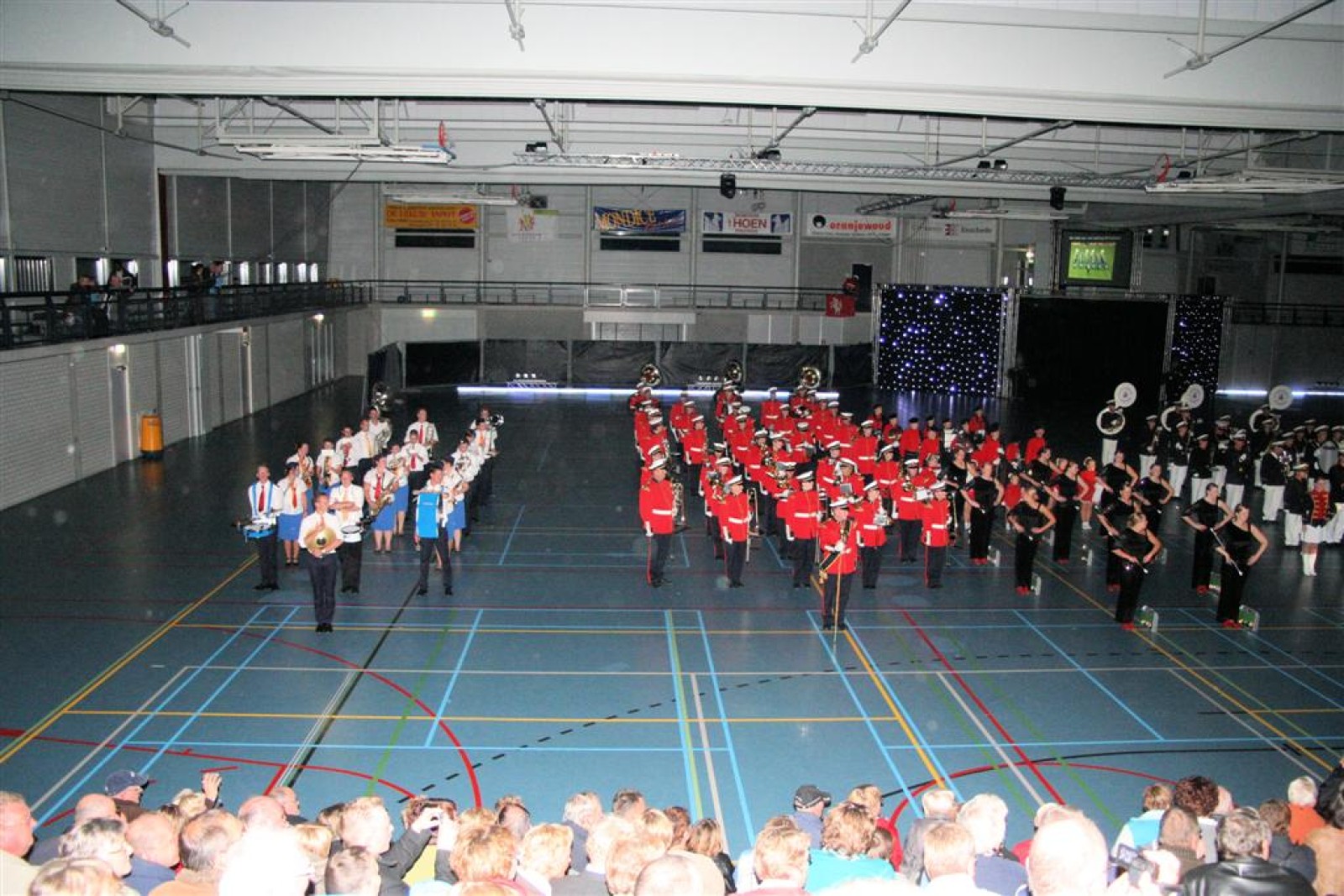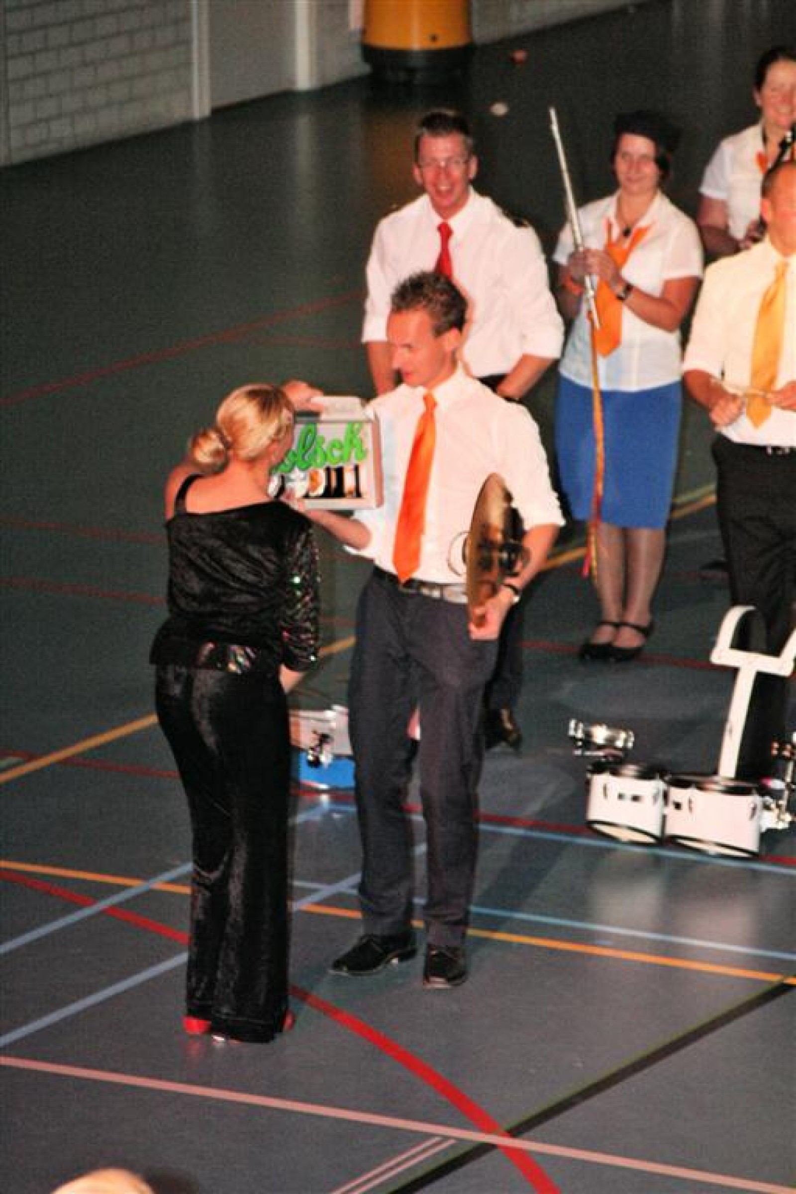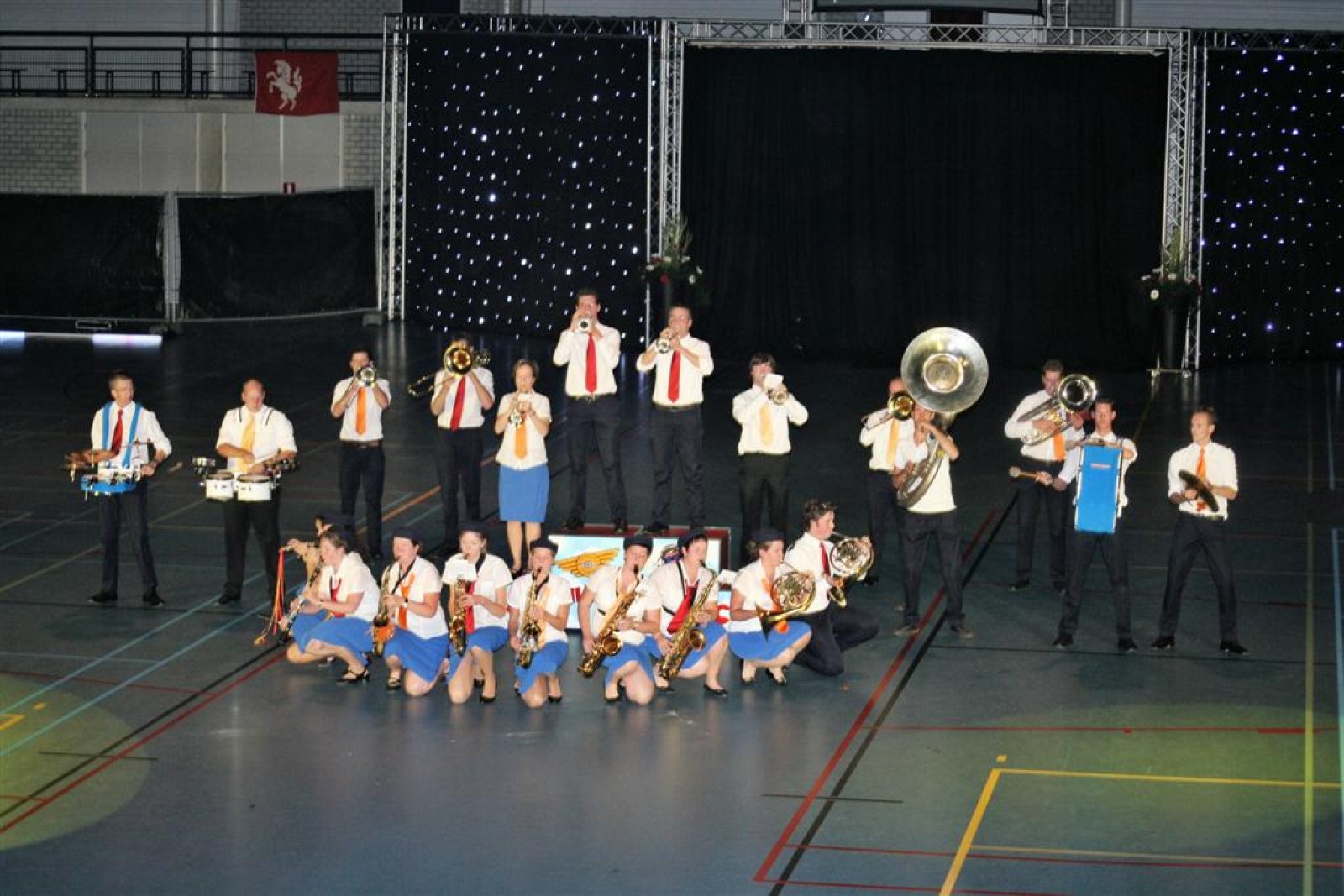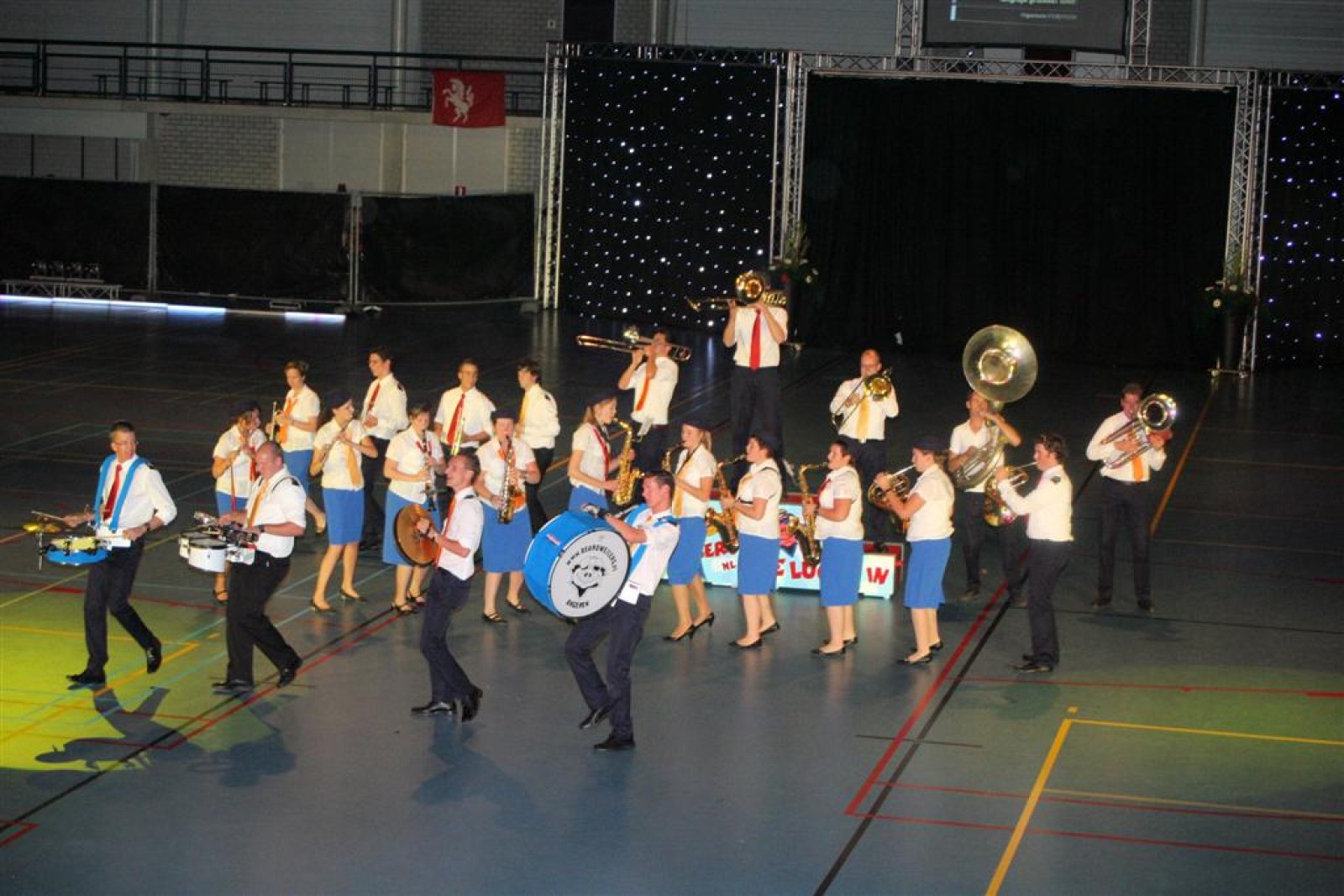 Na een korte break gingen we weer opstellen achter alle andere korpsen. Opmarcheren was onder begeleiding van muziek van een ander korps, dus in drie rijen achter onze tambourmaitre (met bekkens?) Tijn aan. Na een kort praatje werd één van de korpsen in de houding gezet en Tijn doet hem na alsof hij precies weet wat hij doet, en wij volgen hem dan ook gelijk. Het was zo komisch dat het publiek in een deuk ligt van het lachen.