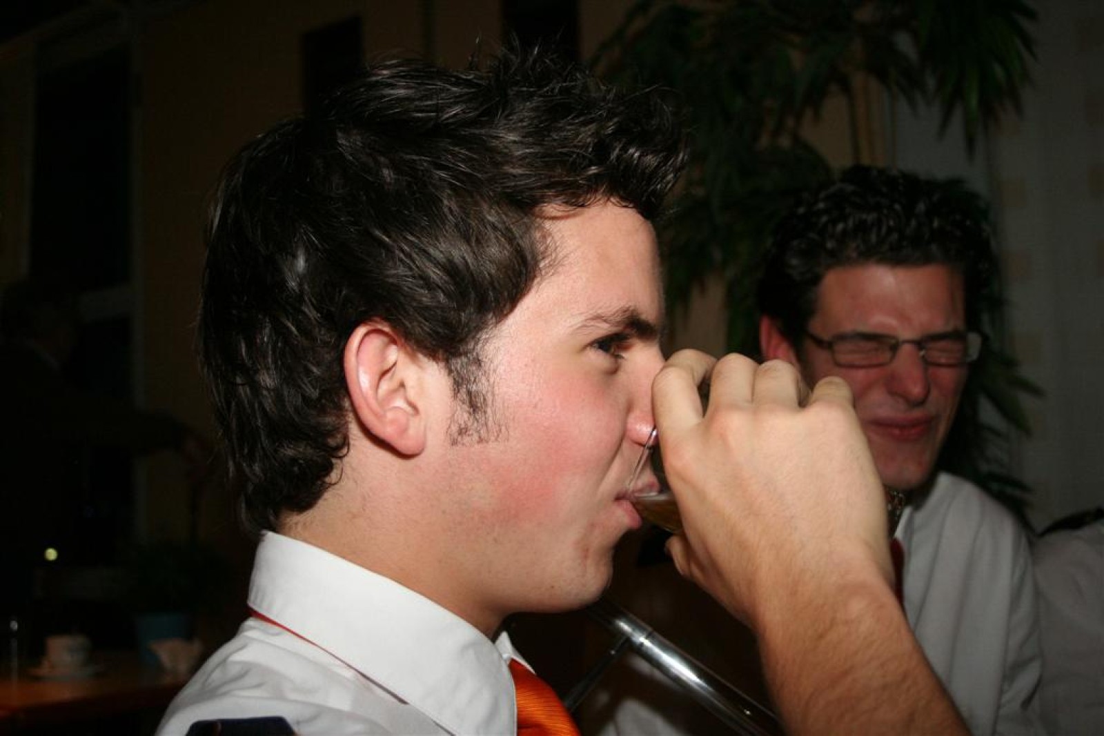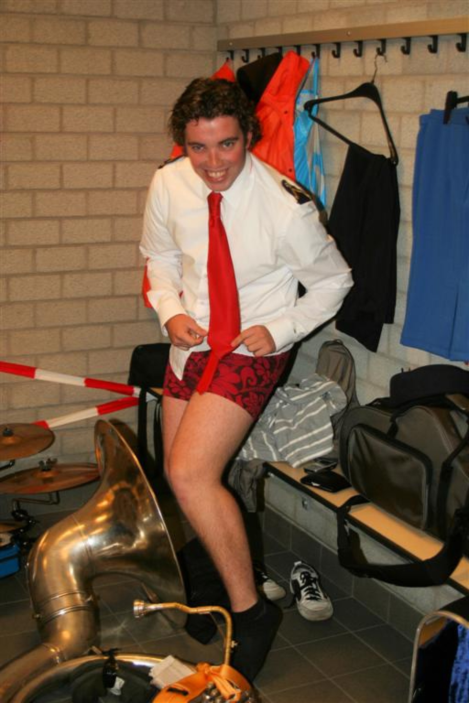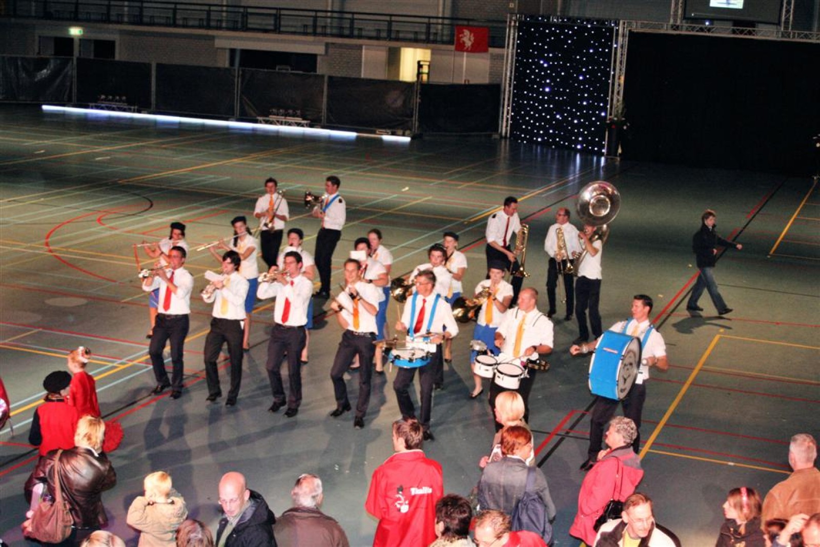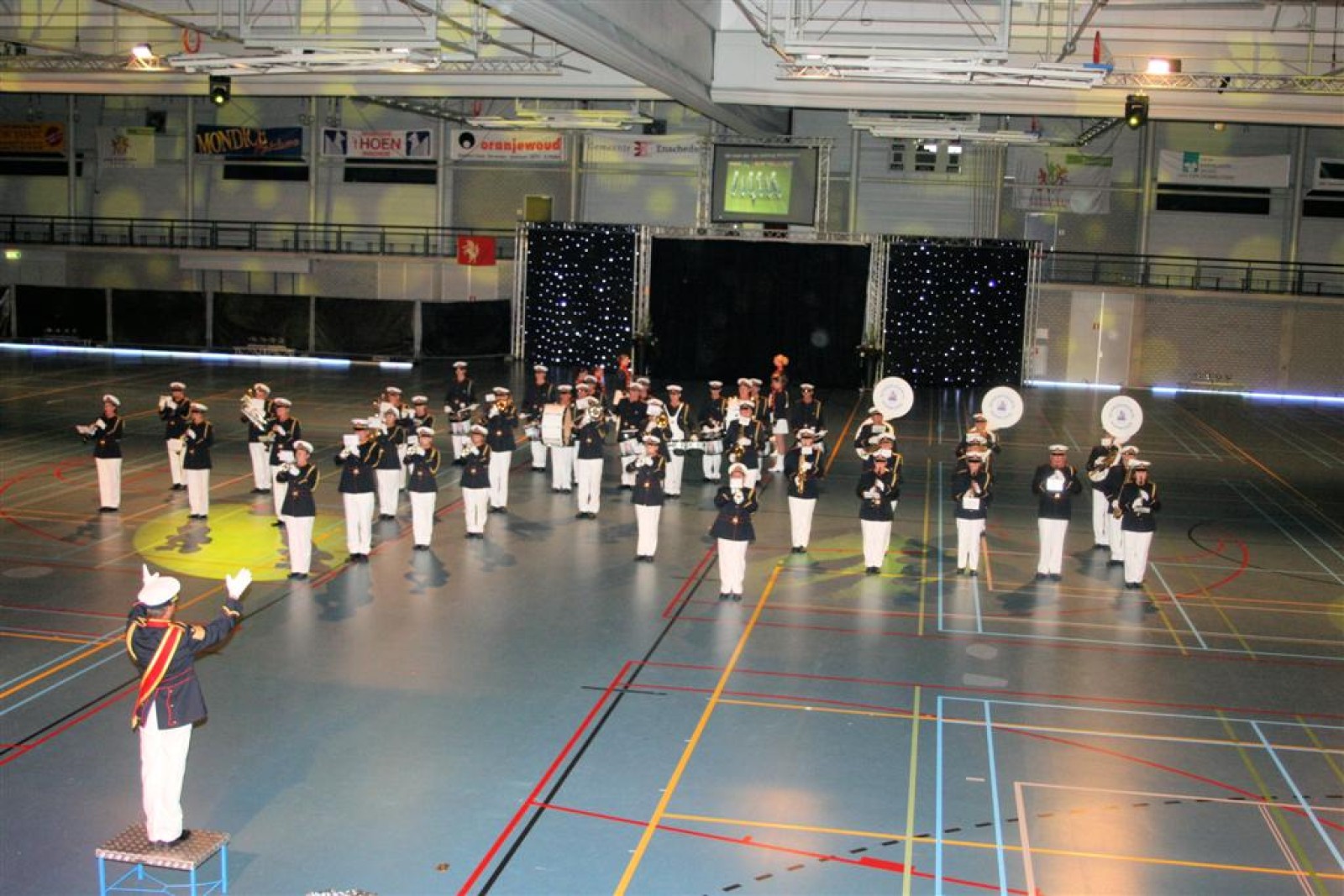 Na een korte break gingen we weer opstellen achter alle andere korpsen. Opmarcheren was onder begeleiding van muziek van een ander korps, dus in drie rijen achter onze tambourmaitre (met bekkens?) Tijn aan. Na een kort praatje werd één van de korpsen in de houding gezet en Tijn doet hem na alsof hij precies weet wat hij doet, en wij volgen hem dan ook gelijk. Het was zo komisch dat het publiek in een deuk ligt van het lachen.