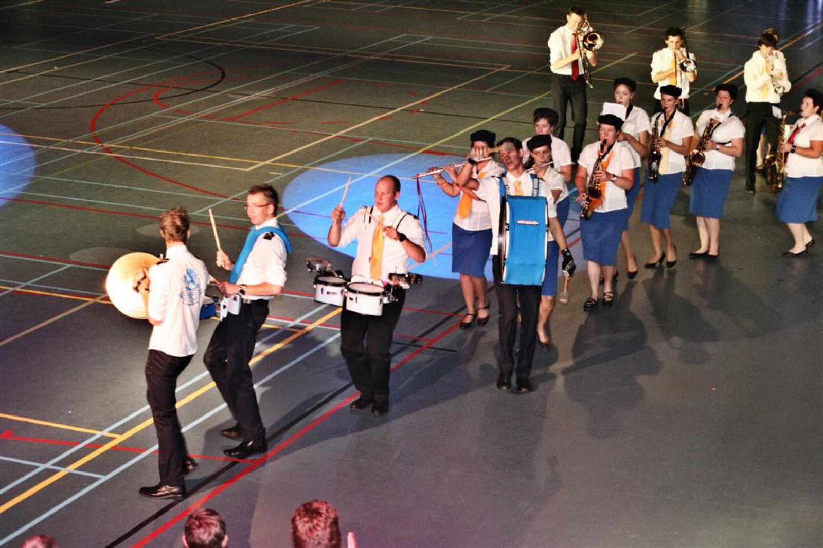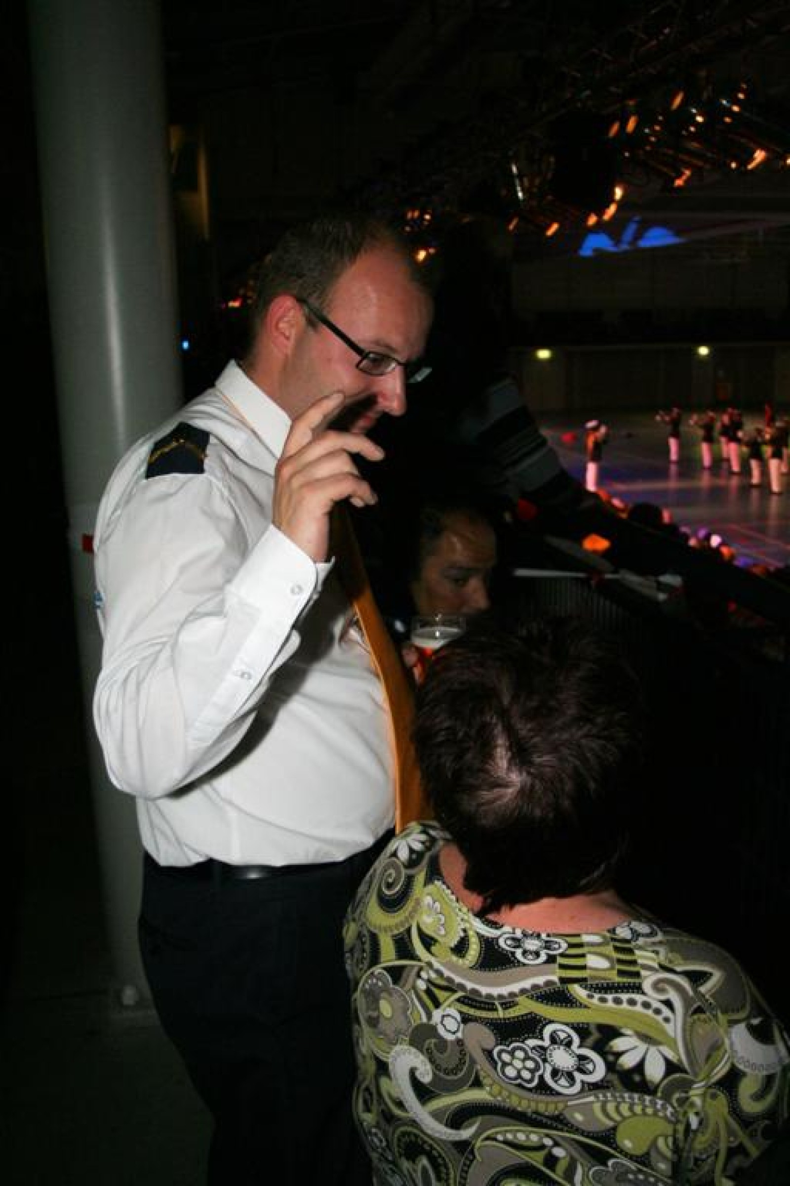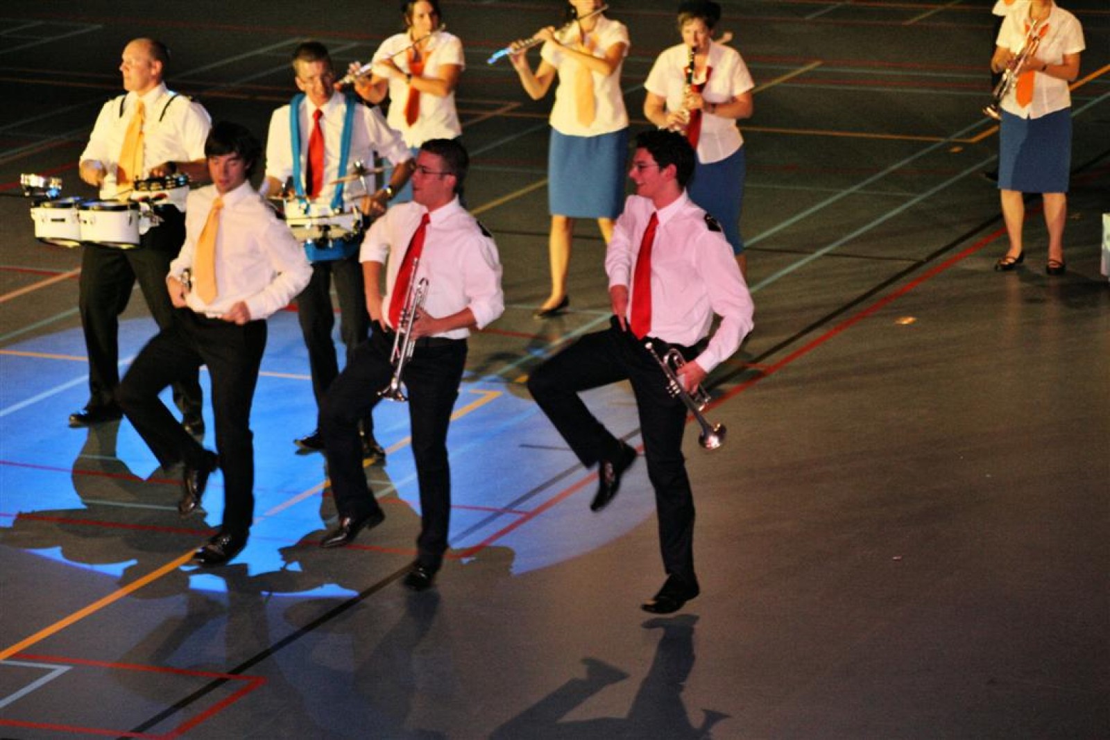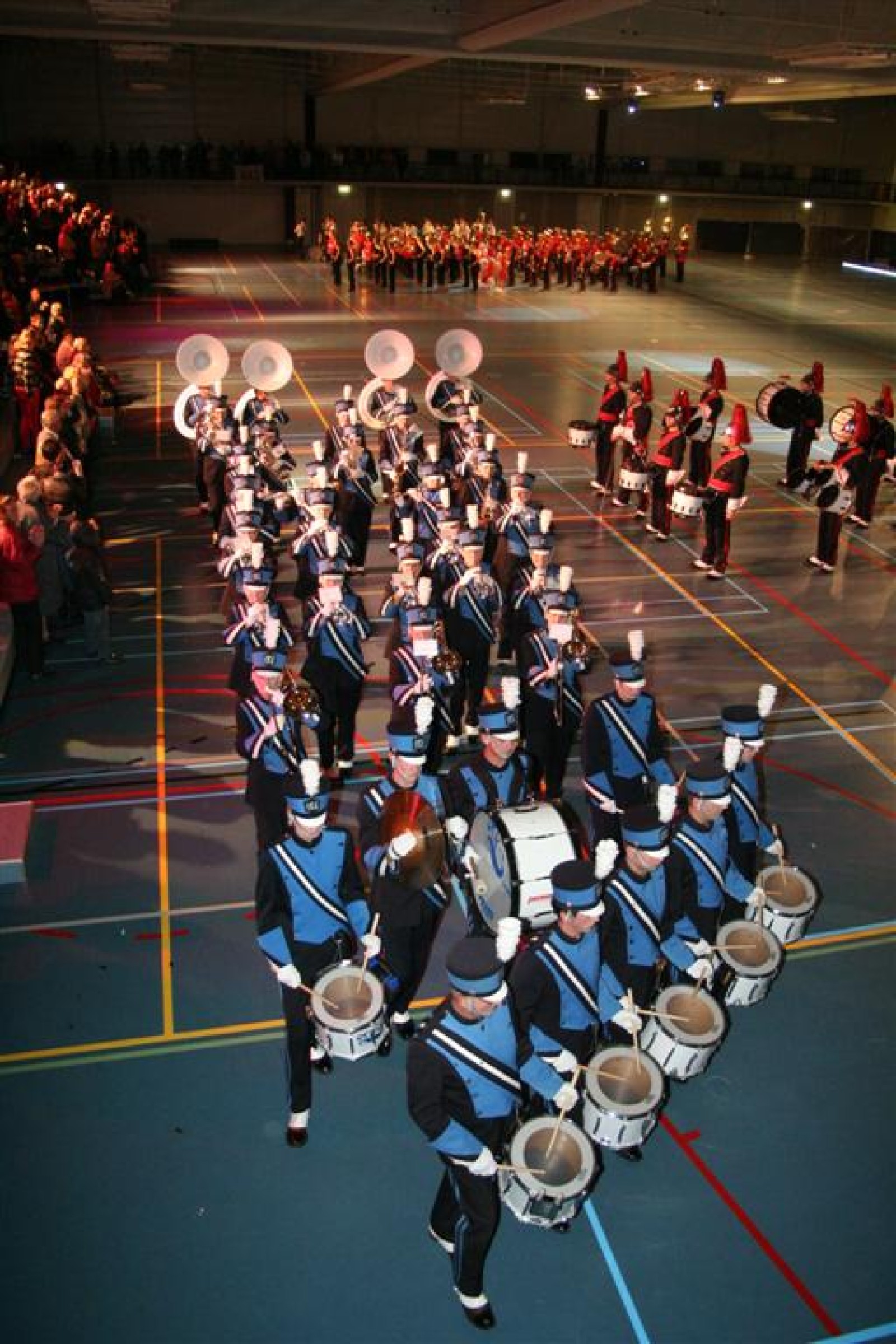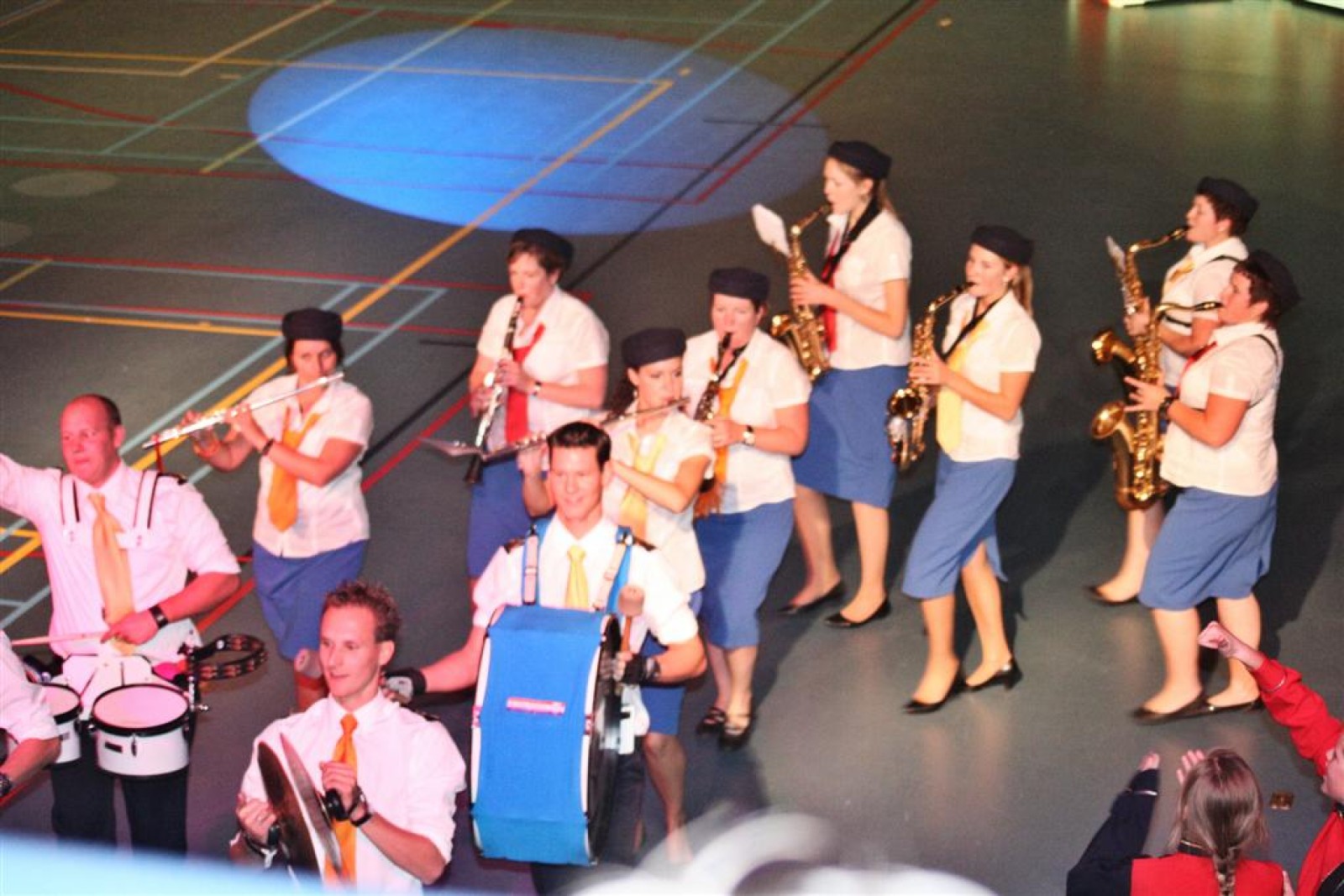 Wij voelden ons eerst wel een beetje klein, omdat alle andere orkesten echt heel veel leden hadden. Eenmaal spelend merkten we dat het met het geluid goed zat. En zo kregen we het publiek na enige aarzeling toch in beweging, en klapten en zwaaiden ze vrolijk met ons mee. Voor het vliegtuig kregen we onze afkondiging, en dat was voor ons het teken om het vliegtuig te laten opstijgen en later weer te laten landen. Nog ff springen en daarna afmarcheren met Hallo hallo, waarbij we even langs beide tribunes liepen om het applaus in ontvangst te nemen. Zo hee, dit was gaaf om te doen!