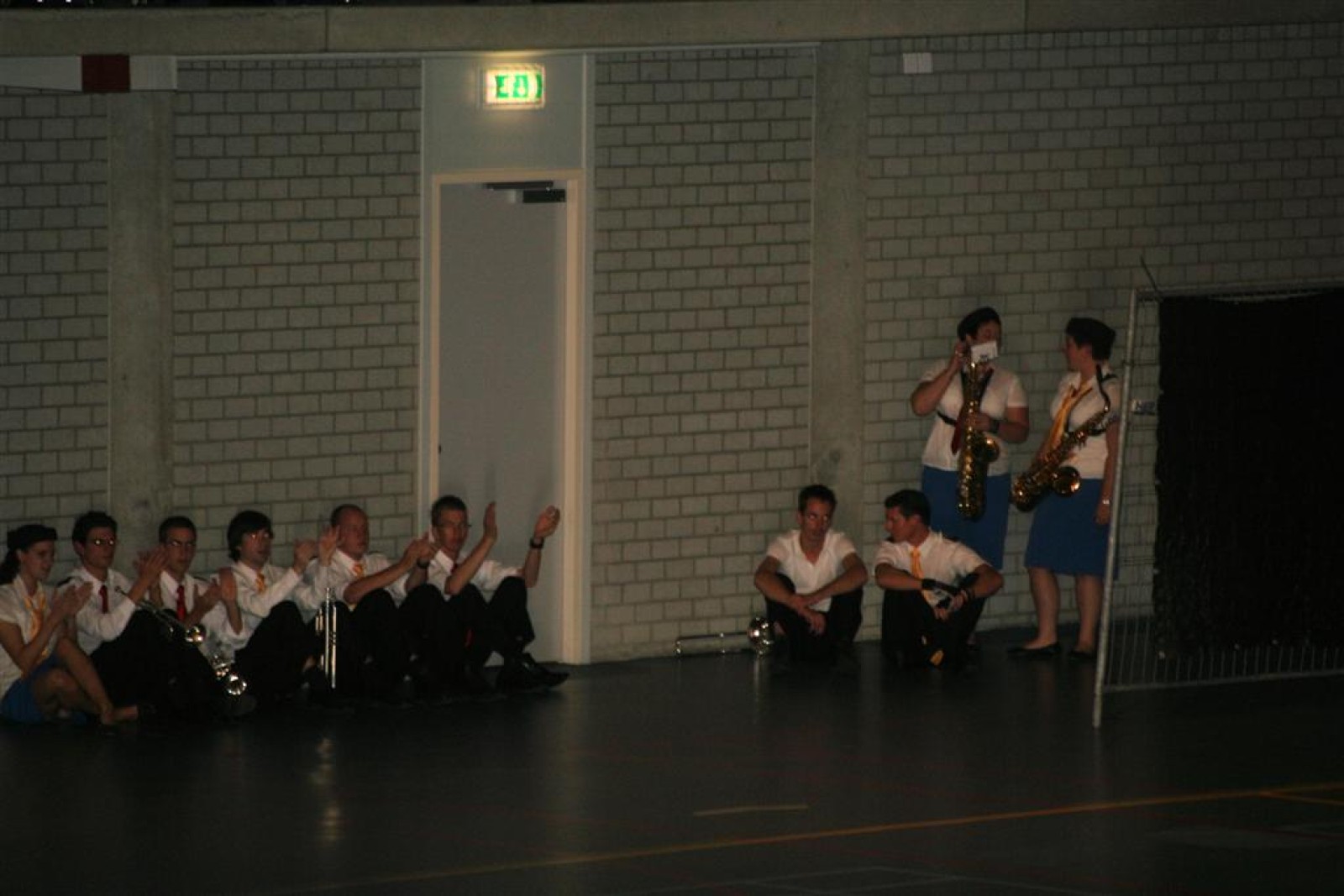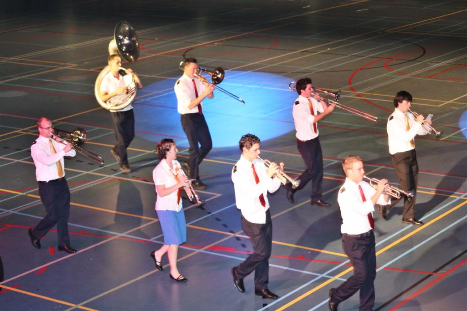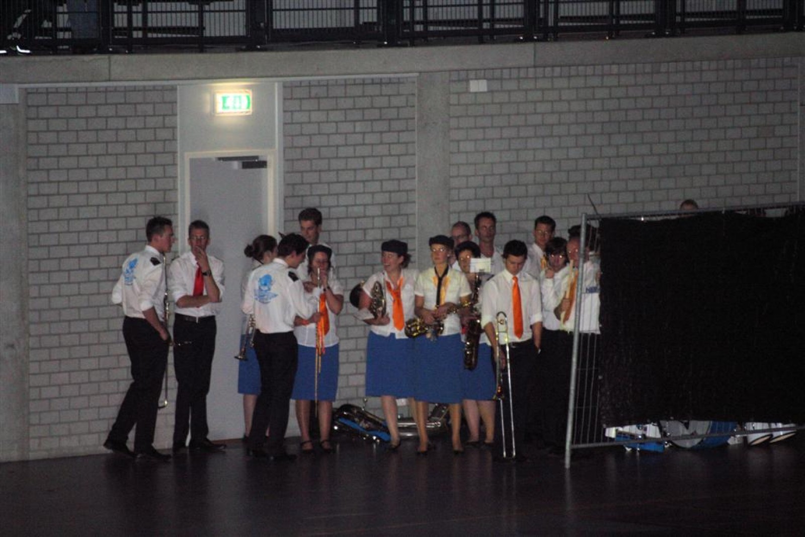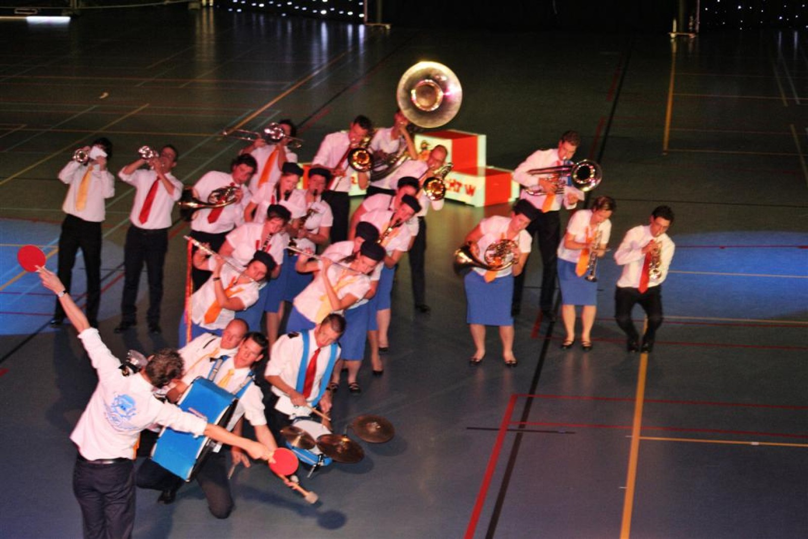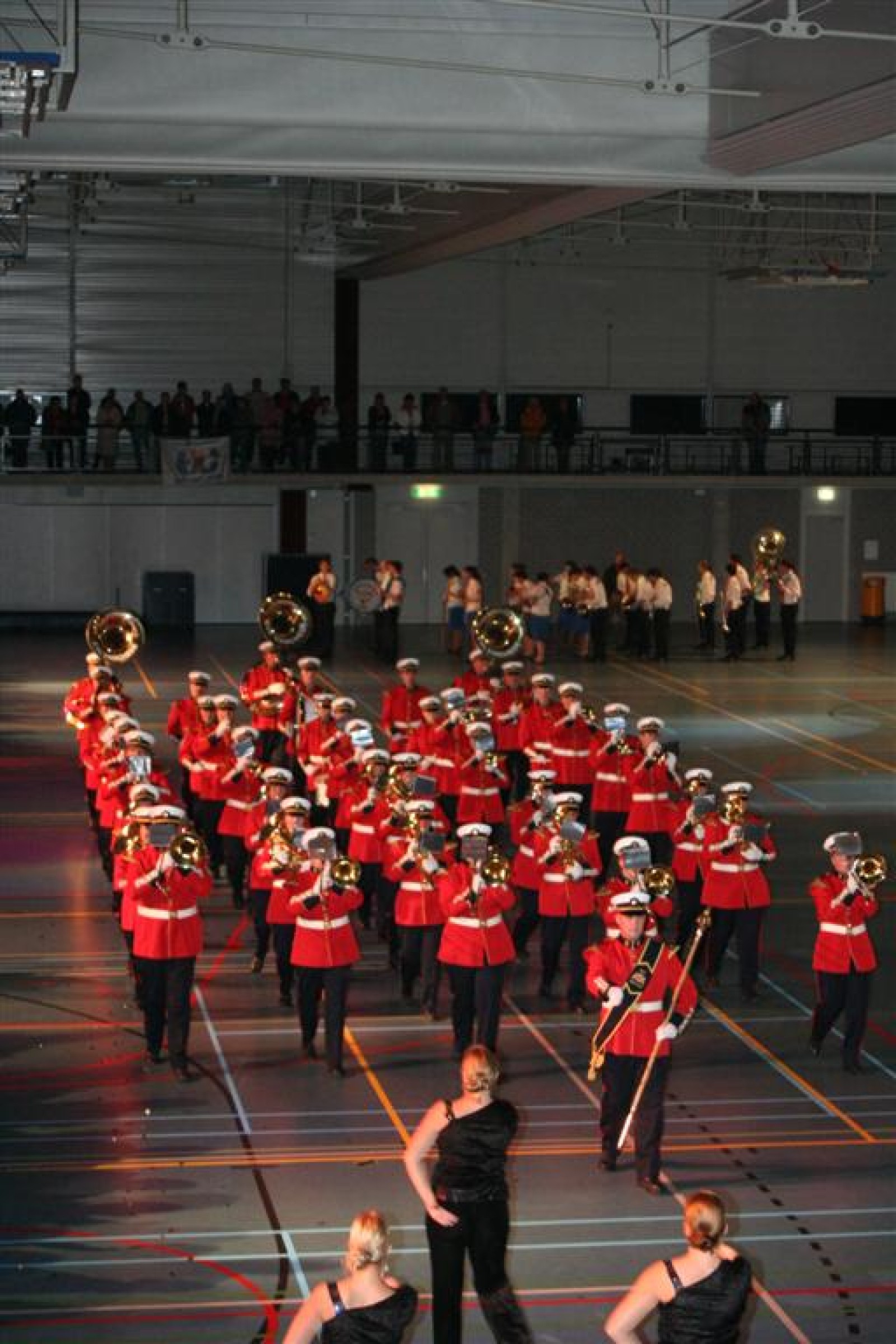 Wij voelden ons eerst wel een beetje klein, omdat alle andere orkesten echt heel veel leden hadden. Eenmaal spelend merkten we dat het met het geluid goed zat. En zo kregen we het publiek na enige aarzeling toch in beweging, en klapten en zwaaiden ze vrolijk met ons mee. Voor het vliegtuig kregen we onze afkondiging, en dat was voor ons het teken om het vliegtuig te laten opstijgen en later weer te laten landen. Nog ff springen en daarna afmarcheren met Hallo hallo, waarbij we even langs beide tribunes liepen om het applaus in ontvangst te nemen. Zo hee, dit was gaaf om te doen!