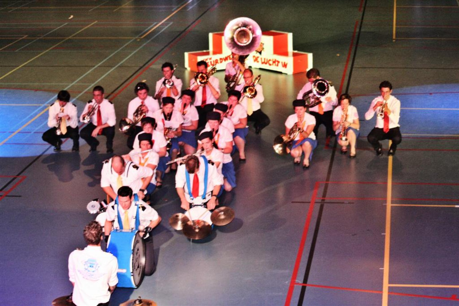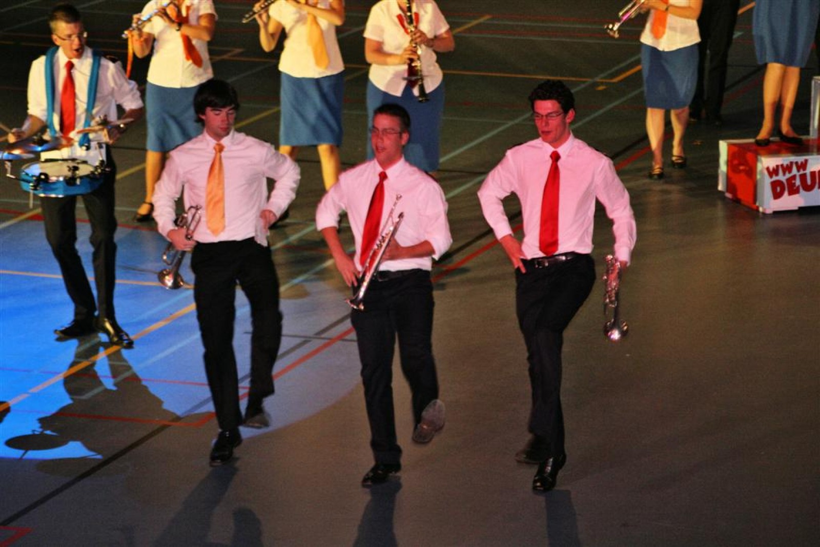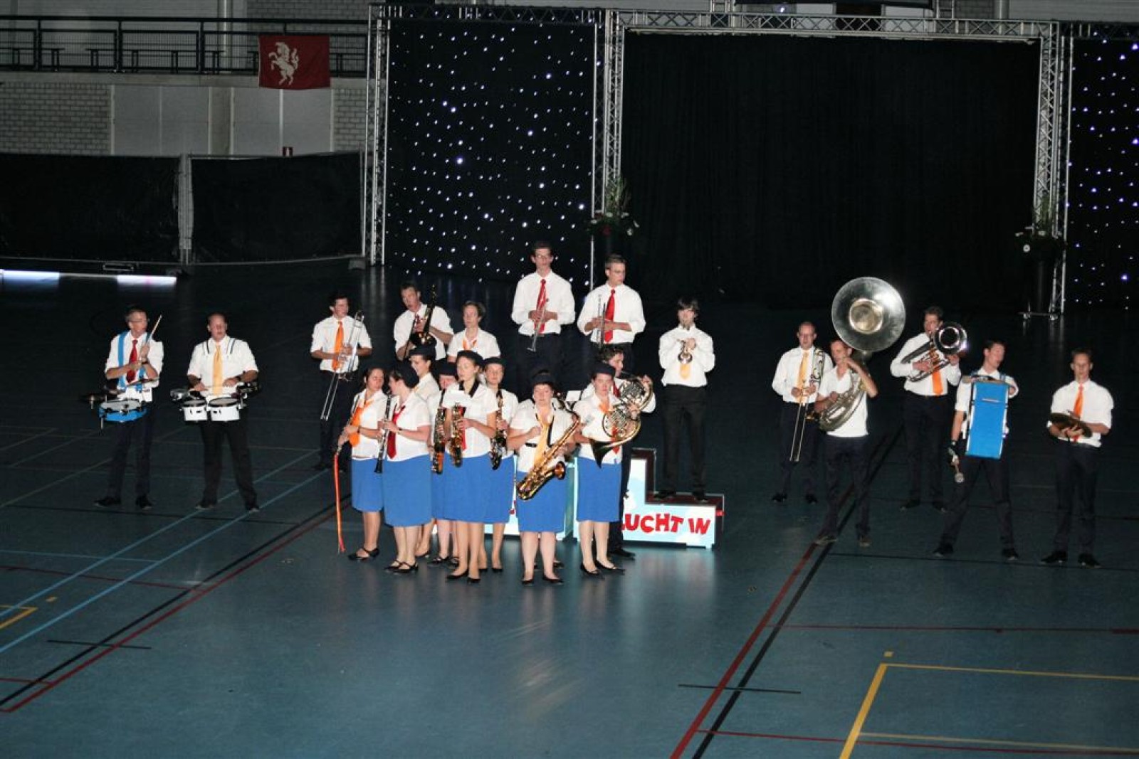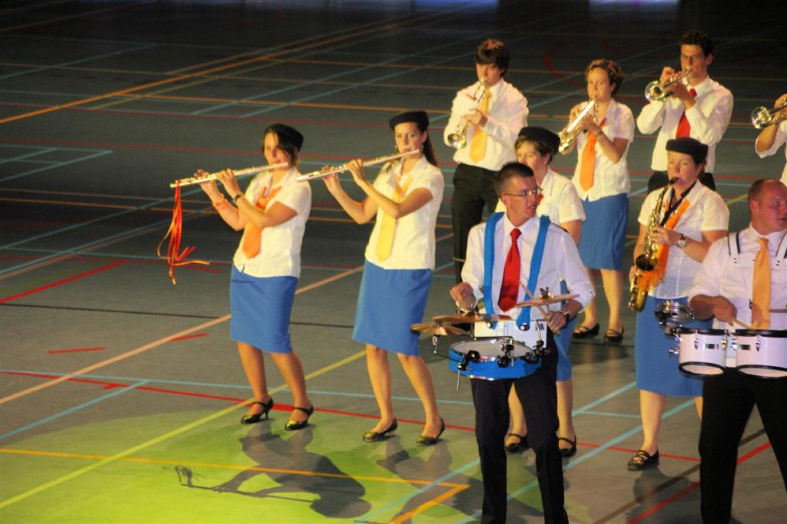 Wij voelden ons eerst wel een beetje klein, omdat alle andere orkesten echt heel veel leden hadden. Eenmaal spelend merkten we dat het met het geluid goed zat. En zo kregen we het publiek na enige aarzeling toch in beweging, en klapten en zwaaiden ze vrolijk met ons mee. Voor het vliegtuig kregen we onze afkondiging, en dat was voor ons het teken om het vliegtuig te laten opstijgen en later weer te laten landen. Nog ff springen en daarna afmarcheren met Hallo hallo, waarbij we even langs beide tribunes liepen om het applaus in ontvangst te nemen. Zo hee, dit was gaaf om te doen!