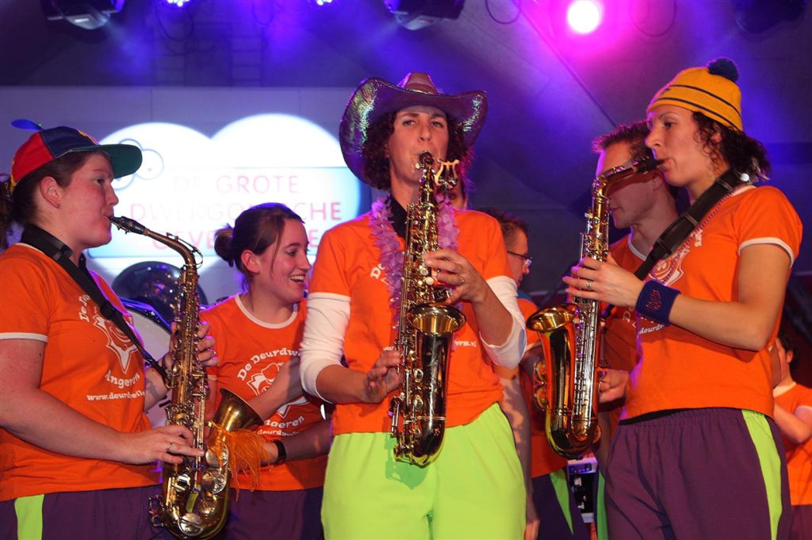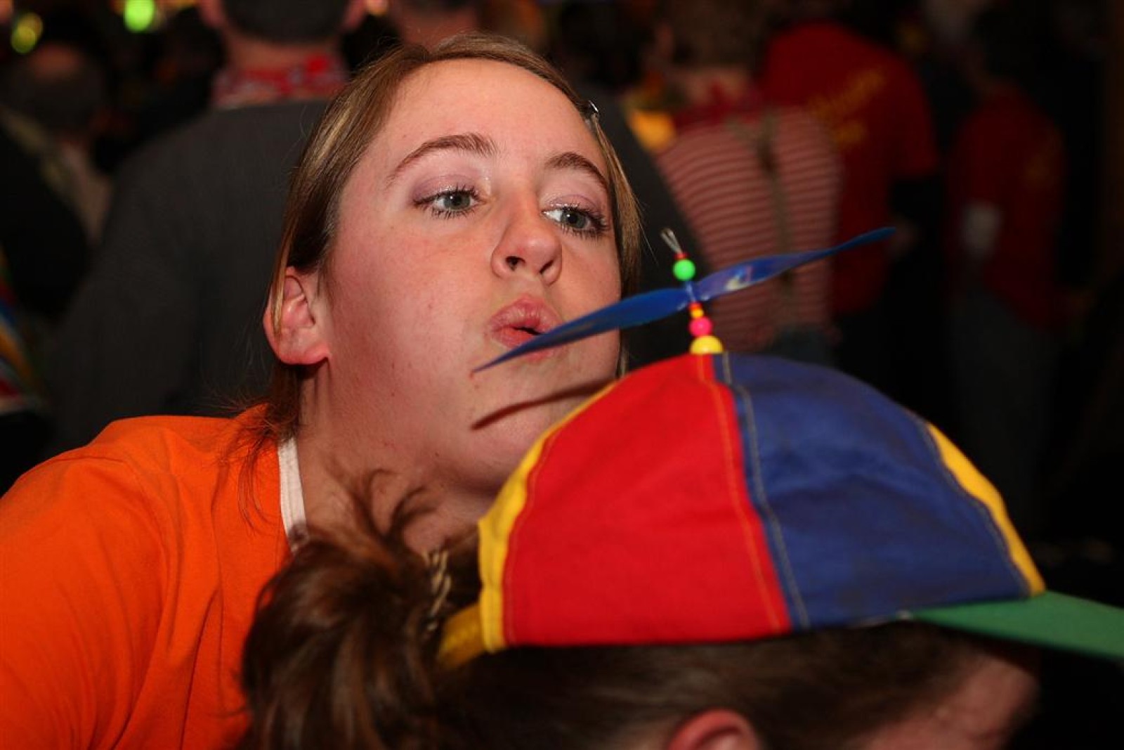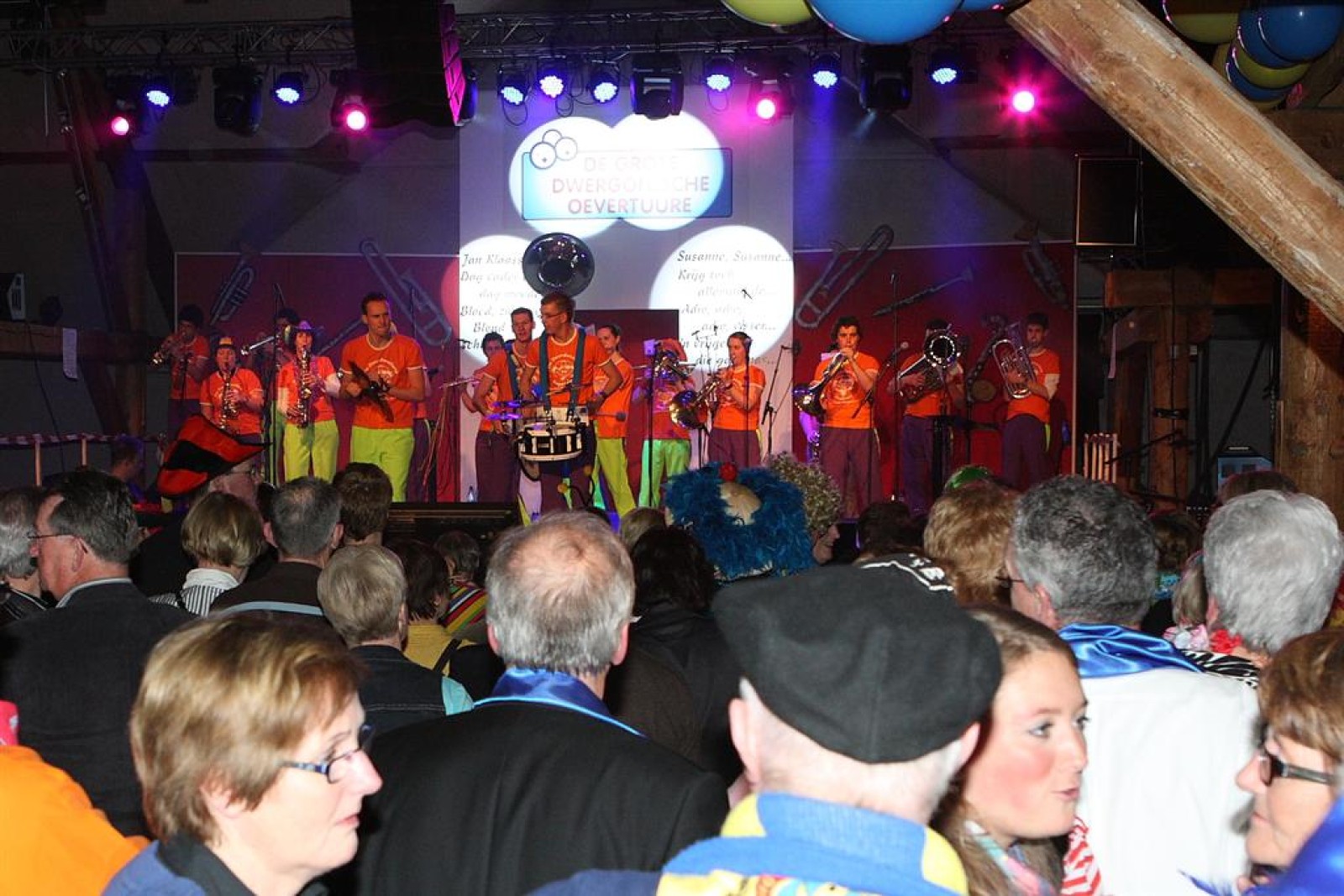 Bij binnenkomst waren er nog niet zoveel mensen. Als dat maar goed komt, dachten we nog, maar tijdens het spelen stroomde de zaal vol! Overal zagen we verkleedde mensen, die hun eerste biertje namen op de carnaval. Het publiek stond wel een beetje verder van het podium af dan de vorige keer, maar na een paar nummertjes spelen, hadden we elkaar toch gevonden. Zo hebben we samen met het publiek het interactieve repertoire tot een succes gemaakt. Tijdens Vlieg met me mee naar de regenboog werd flink mee gevlogen, een paar stoelen gingen de lucht in bij Schatje mag ik je foto en de wave werd (na uitleg van Tijn) weer ingezet van vooruit de zaal tot achterin bij de bar.