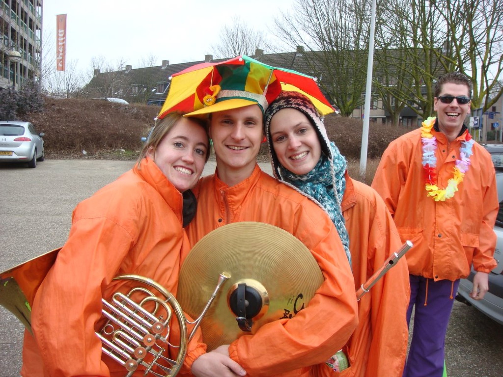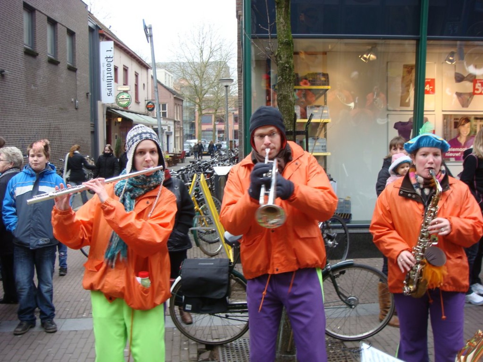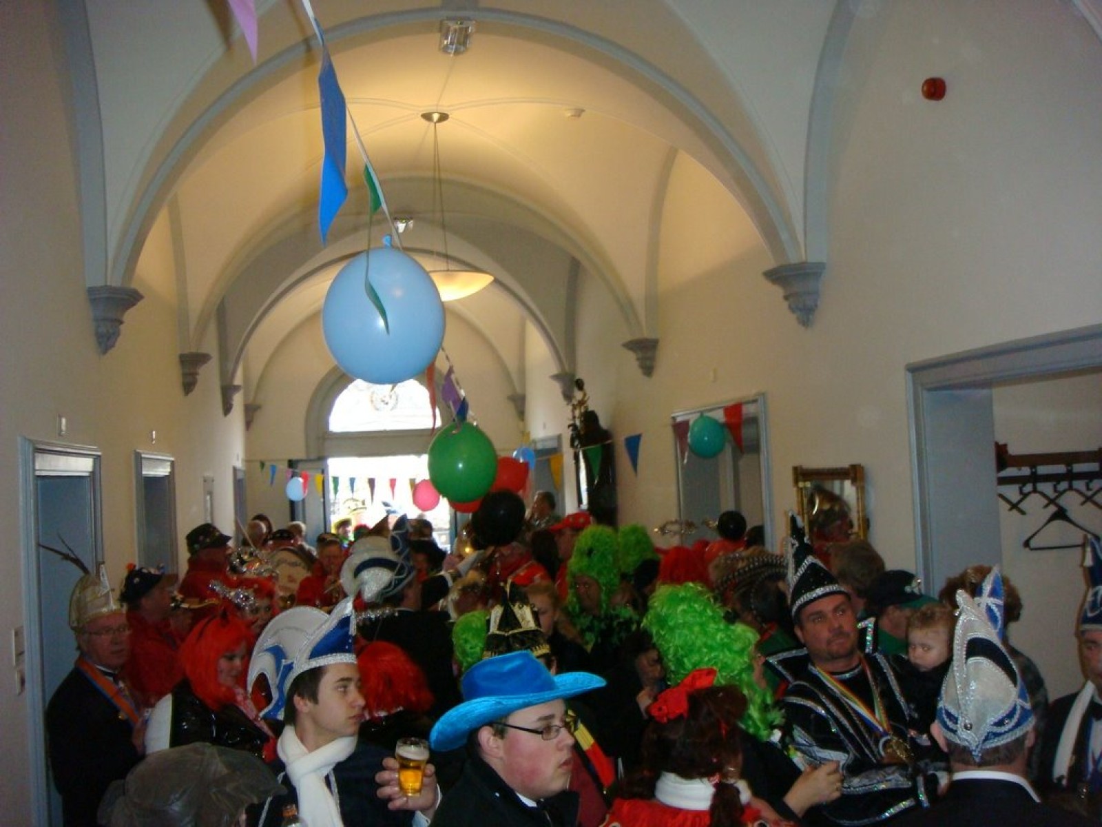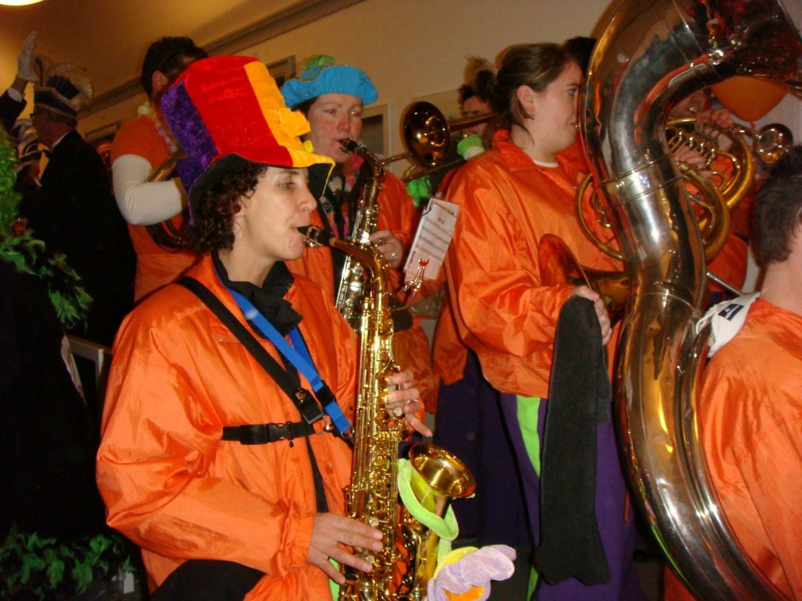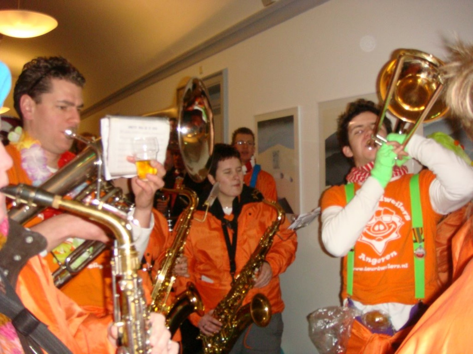 Bij binnenkomst waren er nog niet zoveel mensen. Als dat maar goed komt, dachten we nog, maar tijdens het spelen stroomde de zaal vol! Overal zagen we verkleedde mensen, die hun eerste biertje namen op de carnaval. Het publiek stond wel een beetje verder van het podium af dan de vorige keer, maar na een paar nummertjes spelen, hadden we elkaar toch gevonden. Zo hebben we samen met het publiek het interactieve repertoire tot een succes gemaakt. Tijdens Vlieg met me mee naar de regenboog werd flink mee gevlogen, een paar stoelen gingen de lucht in bij Schatje mag ik je foto en de wave werd (na uitleg van Tijn) weer ingezet van vooruit de zaal tot achterin bij de bar.