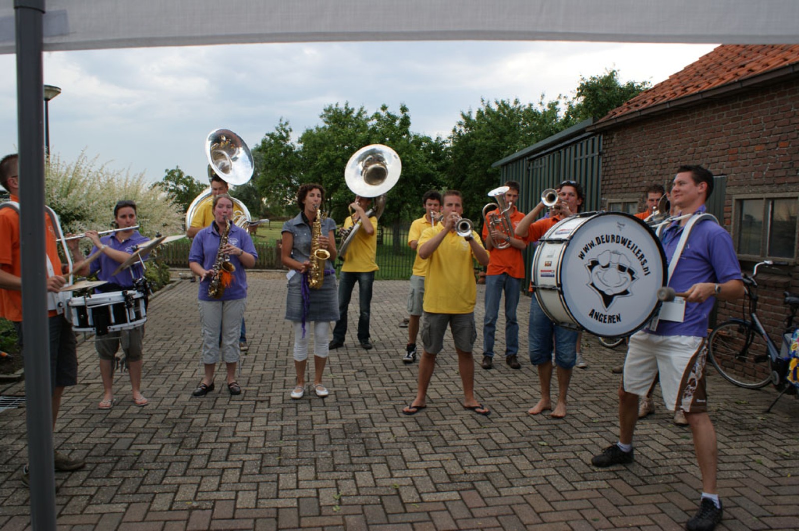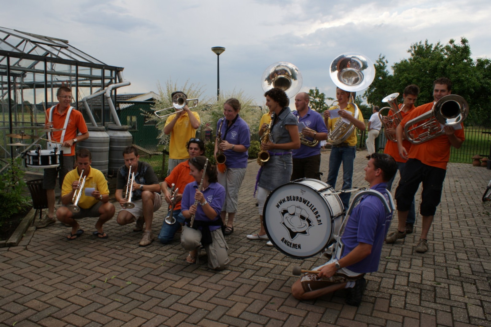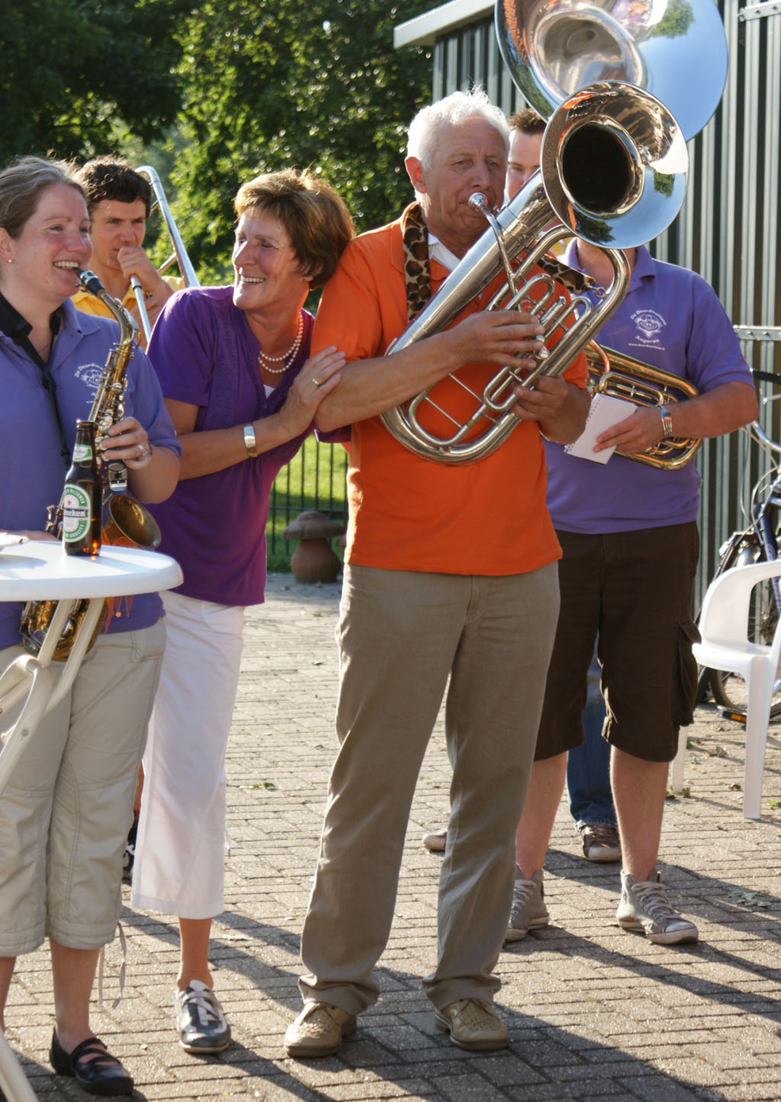 Na een paar deuntjes van de Deurdweilers moest Frits natuurlijk zelf ook even op zijn bariton blazen. Althans, hij kreeg de bariton van Martijn omgehangen en moest uit het hoofd blazen. Het eerste wat hem te binnen schoot was U Zij De Glorie. En dat werd uit volle borst meegezongen. Hij gaat nu eerst even een weekje op vakantie, maar hij zorgt dat hij natuurlijk weer precies op tijd is voor de Bemmelse Dweildag.