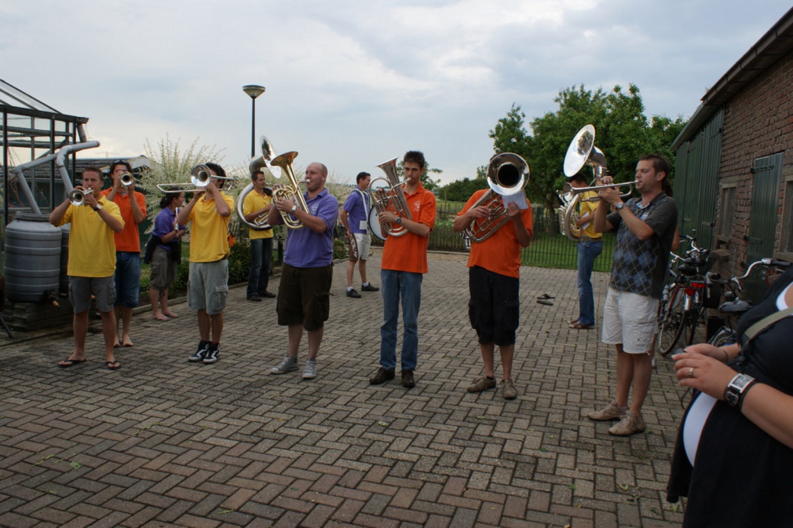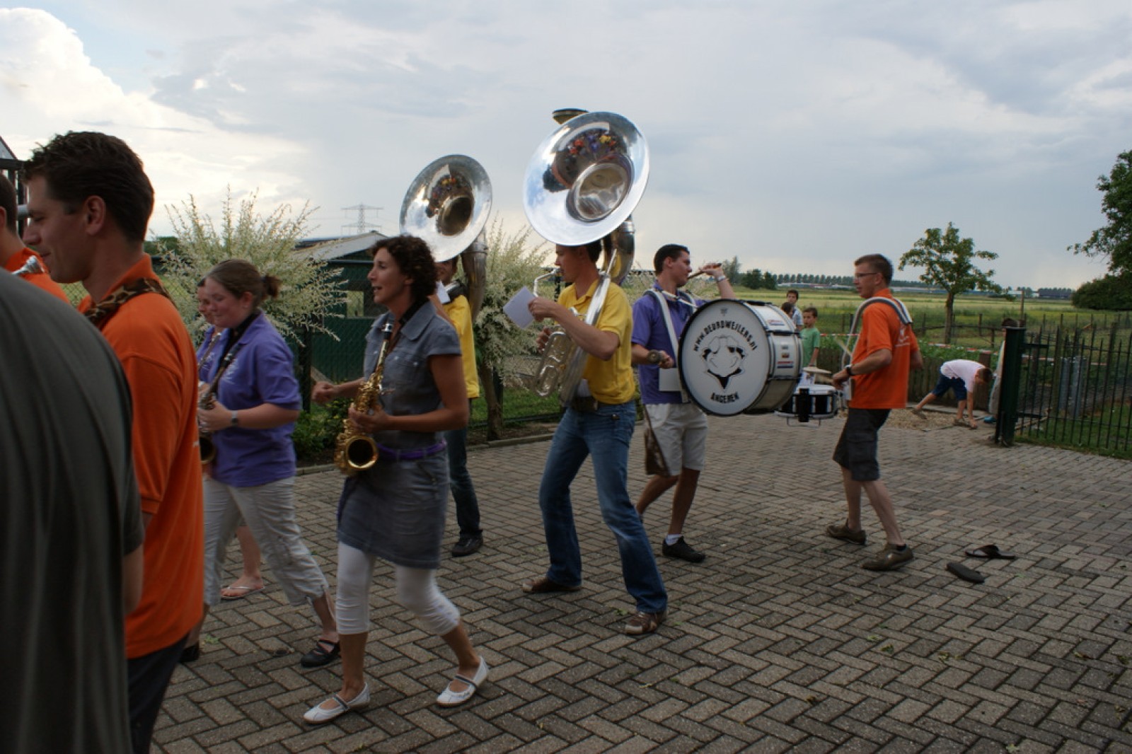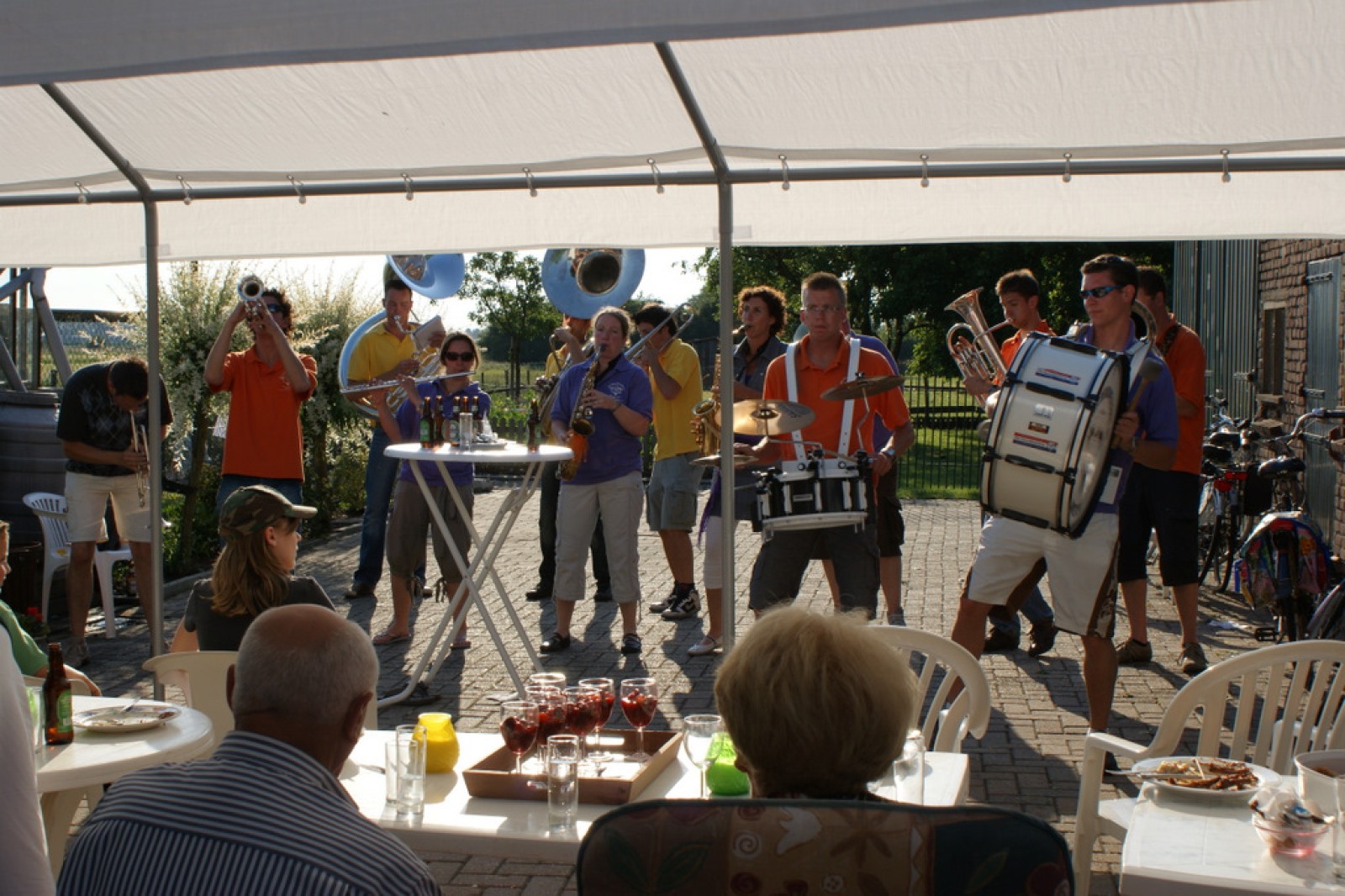 Na een paar deuntjes van de Deurdweilers moest Frits natuurlijk zelf ook even op zijn bariton blazen. Althans, hij kreeg de bariton van Martijn omgehangen en moest uit het hoofd blazen. Het eerste wat hem te binnen schoot was U Zij De Glorie. En dat werd uit volle borst meegezongen. Hij gaat nu eerst even een weekje op vakantie, maar hij zorgt dat hij natuurlijk weer precies op tijd is voor de Bemmelse Dweildag.
