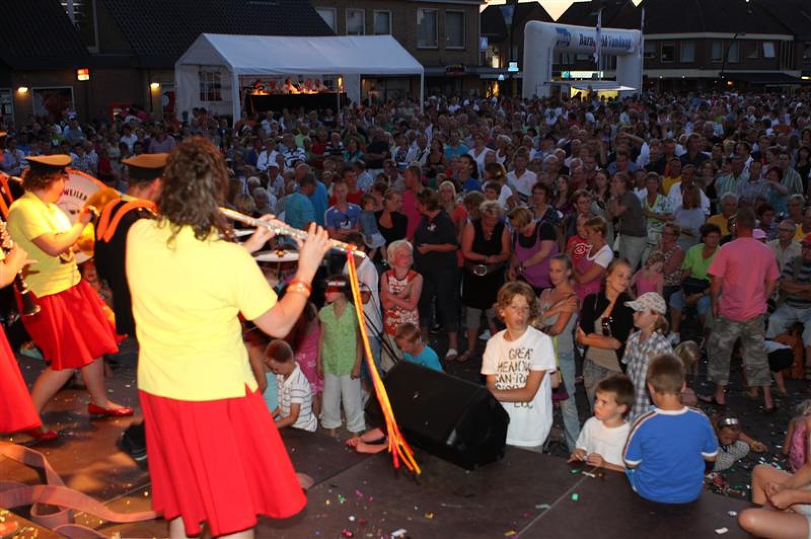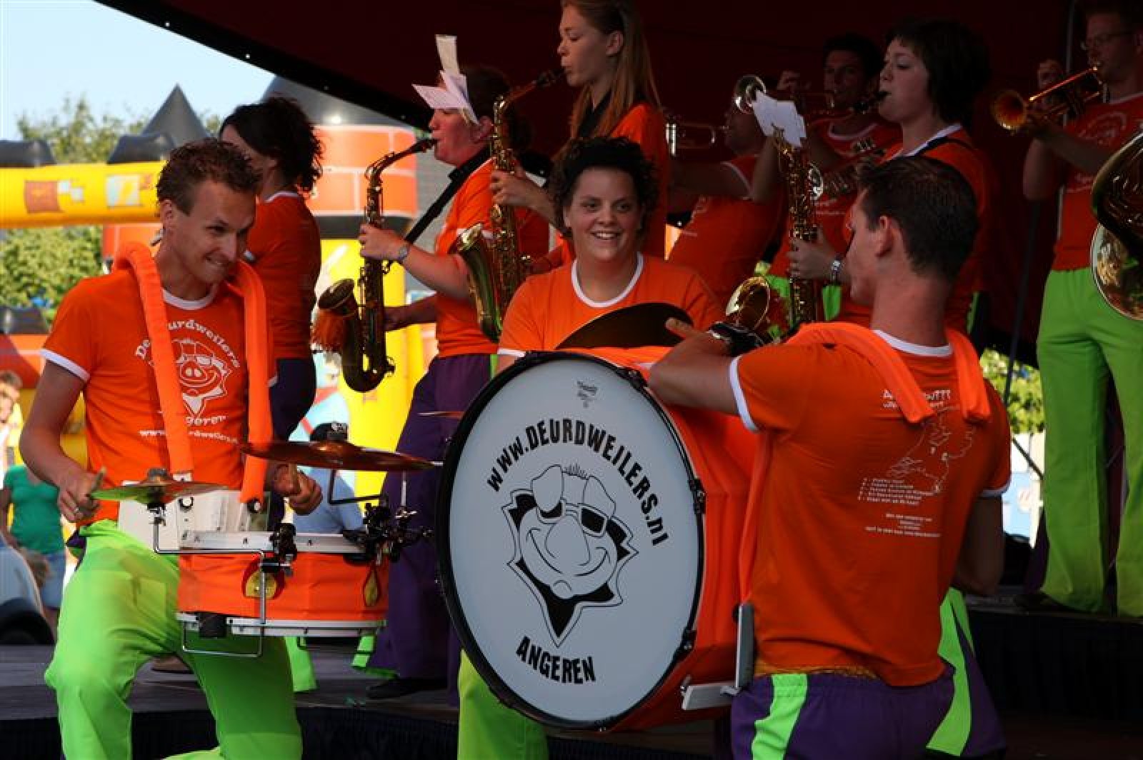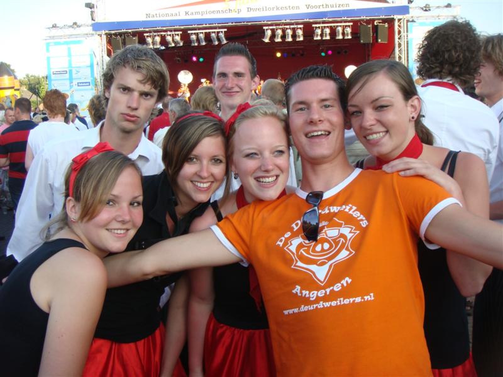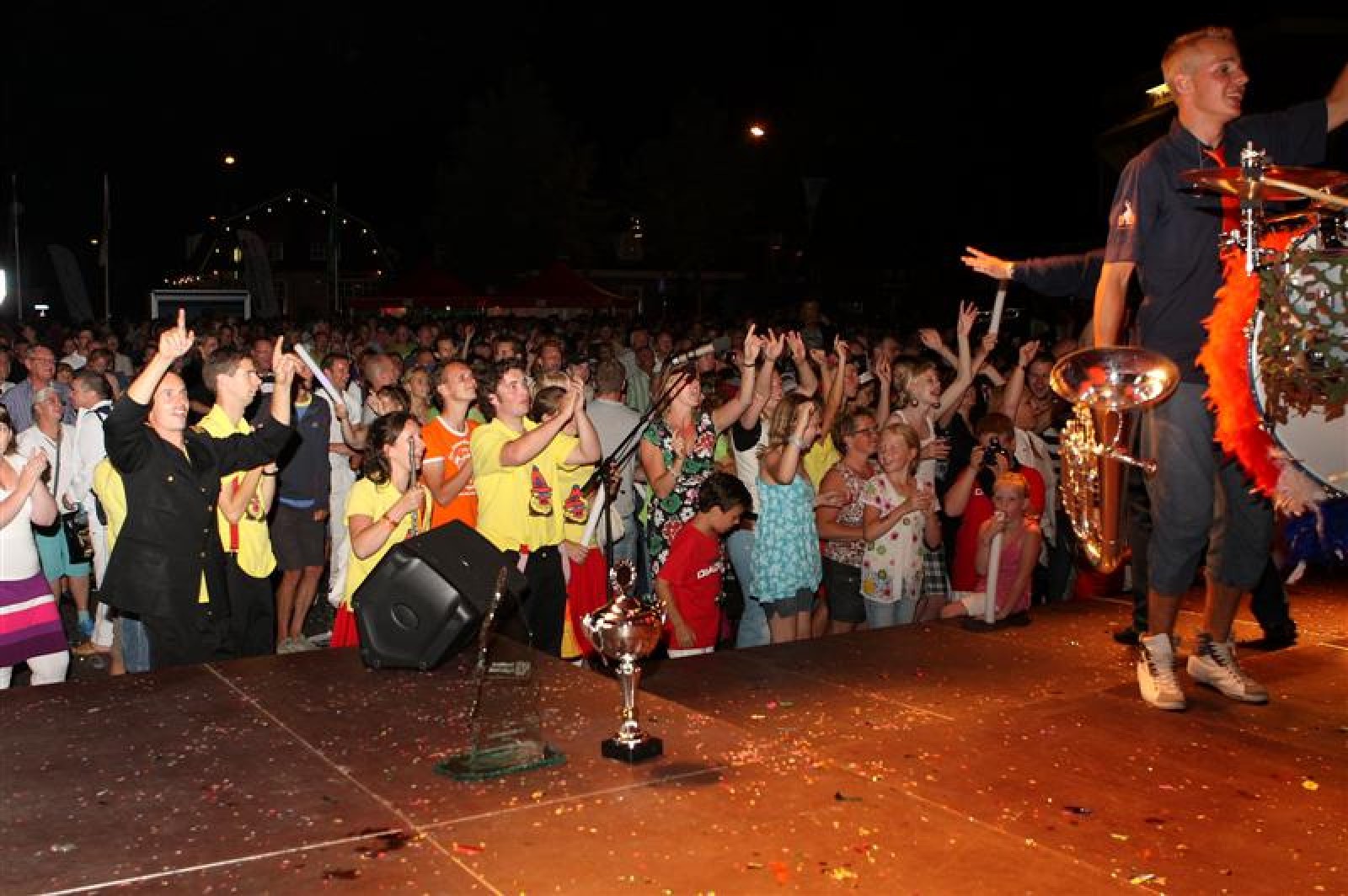 En een leuke avond is het geworden! Acht dweilbands waren vanavond naar Voorthuizen gekomen om te strijden om het Nationaal Kampioenschap Dweilorkesten. Dweilorkest de Deurdweilers uit Angeren mocht als derde orkest het podium op om het publiek te vermaken. Even na 19 uur was dit nog een handje vol mensen. Om 22 uur, bij ons tweede optreden stond het hele plein weer vol! Vooral bij het tweede optreden was er veel publiek dat enthousiast met ons meezwaaide en meezong! Ondanks de wat mindere bezetting, hebben we een mooie show neergezet!