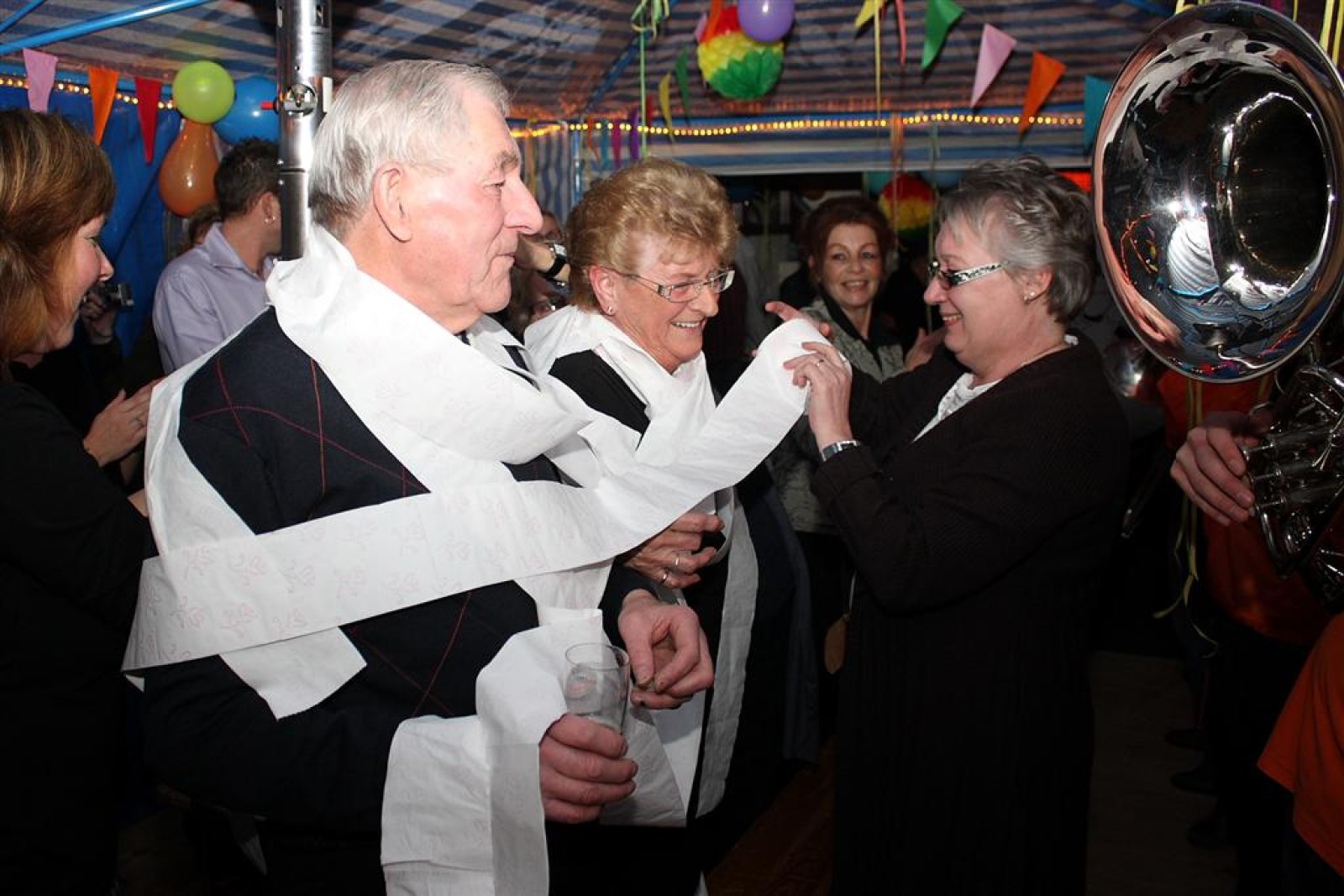En dat ging nog wonderbaarlijk goed ook. Binnen 4 maten zat de stemming er al in. En de (niet al te grote partytent in hun tuin) was snel opgewarmd. De wc-rollen kwamen tevoorschijn, verzoeknummers werden gespeeld en de ook in allerijl opgetrommelde fotograaf Henk moest de hele familie portretteren. Na nog een drelleke meziek sloot Youri af – zoals vaker – met een emotioneel Il Silenzio. Een erg gezellig feest. Rook en Dook, van harte! Nog op zoek naar een huwelijkscadeau?