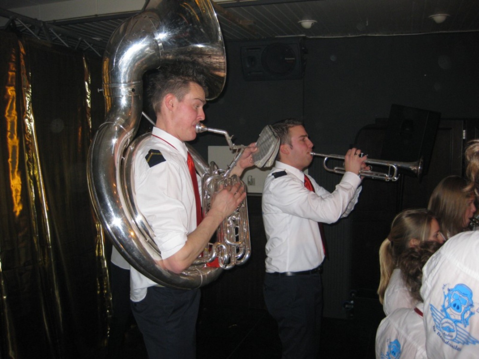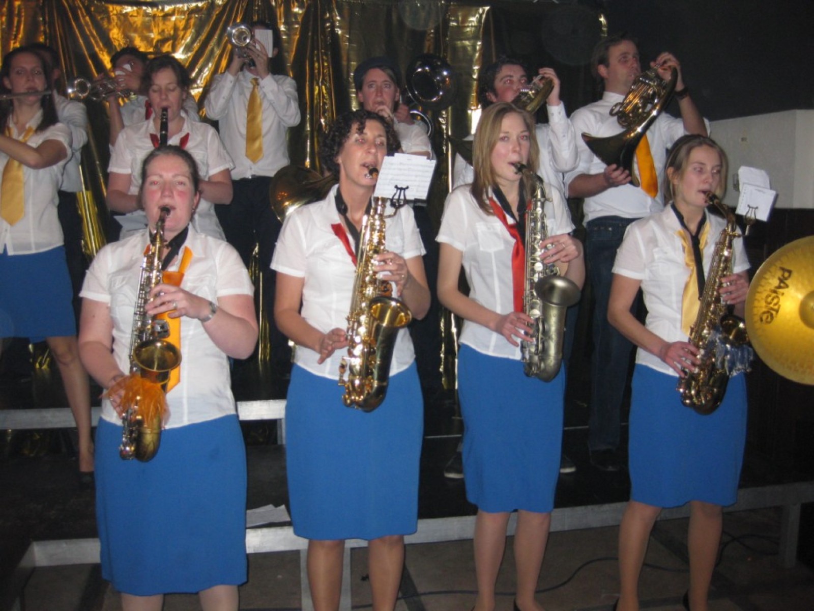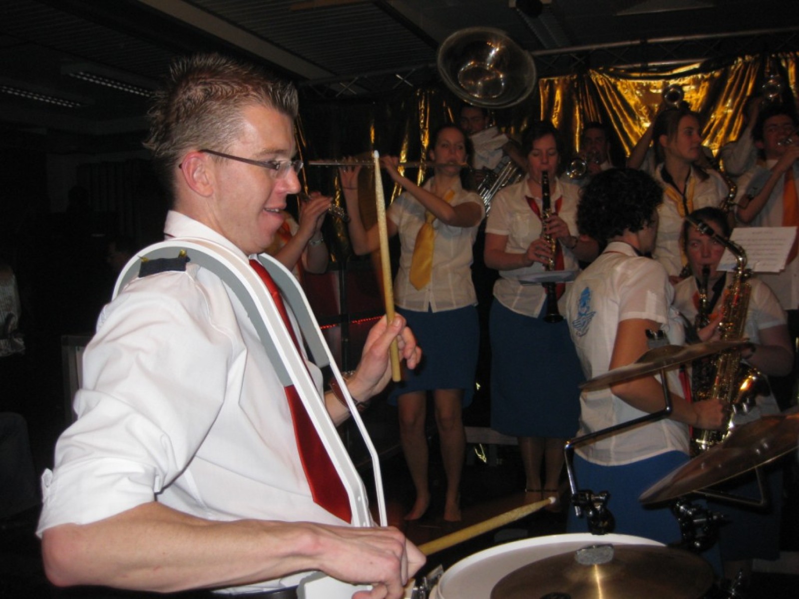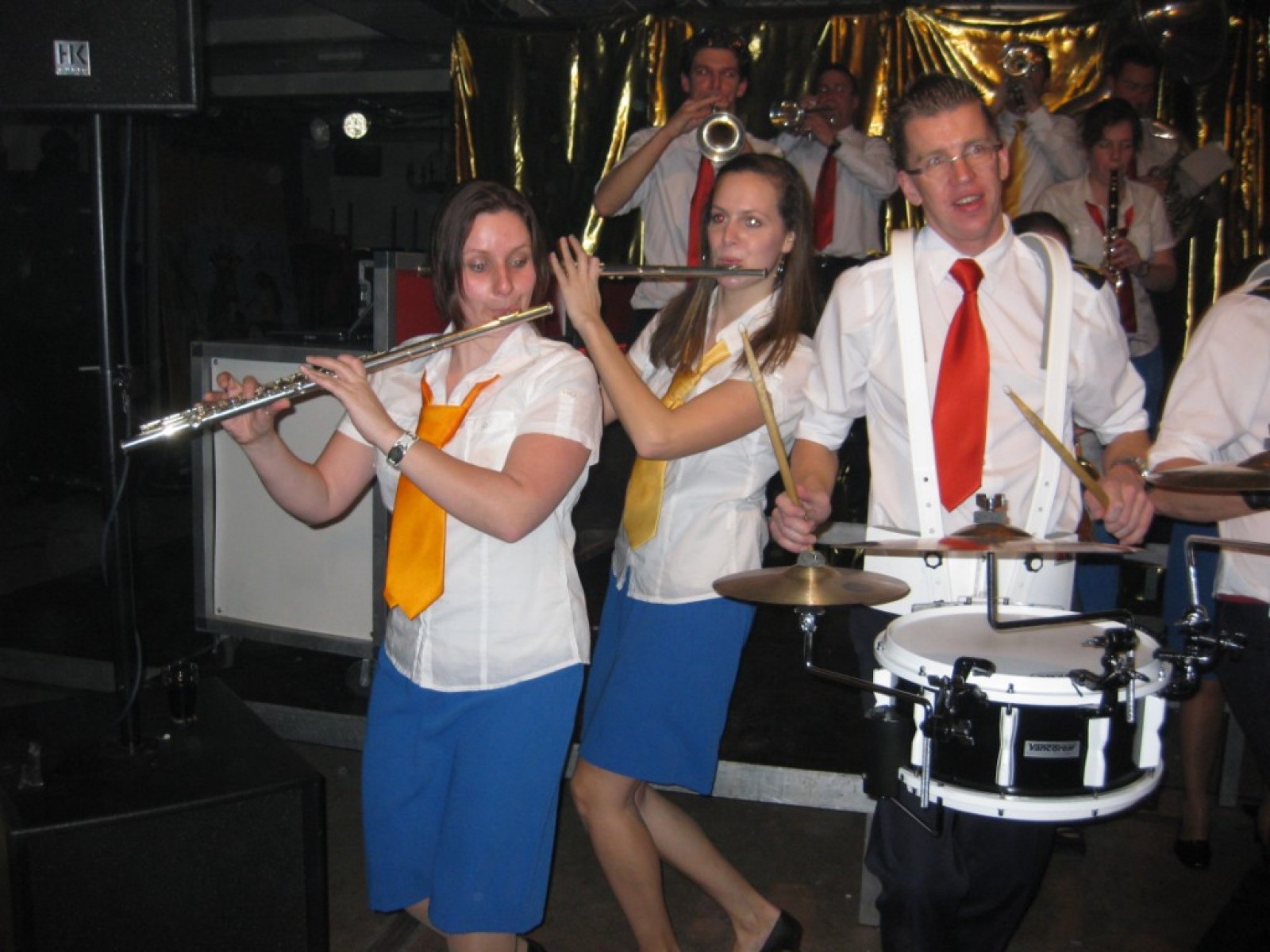 Op de jaarvergadering kwam ter sprake dat we eigenlijk de vliegshow weer eens moesten doen. Zo gezegd, zo gedaan. De kleding hebben we anderhalf jaar niet meer aangehad, maar er was er maar eentje bij die niet meer in zijn broek paste. Mooie vraag voor het fanclubblad wie! We moesten ons optreden heel even rekken omdat Evelyn en Lisette nog onderweg waren vanwege werk en een concert met Volharding, maar toen vlogen we over het podium. Erg leuk om weer eens te spelen.