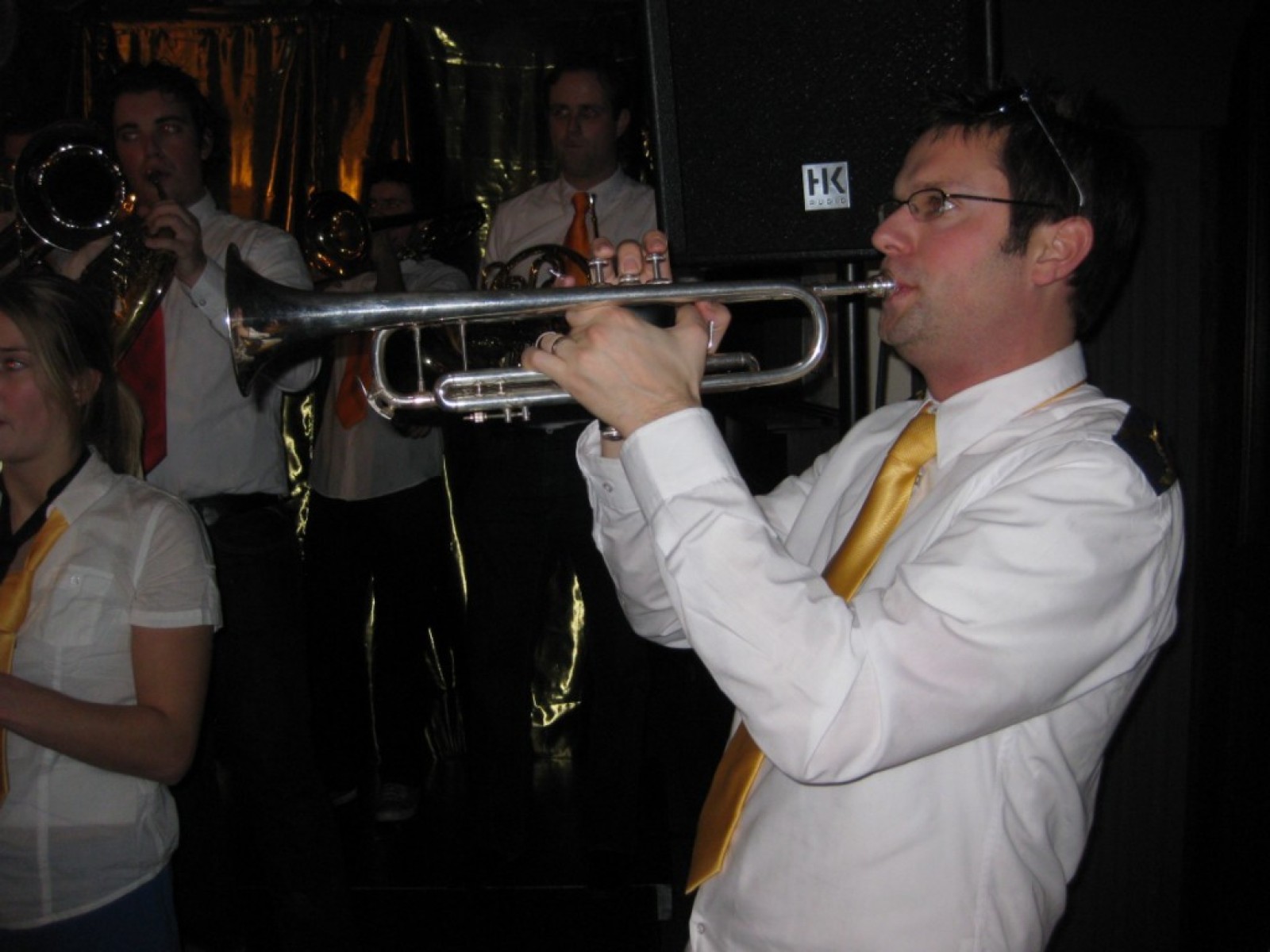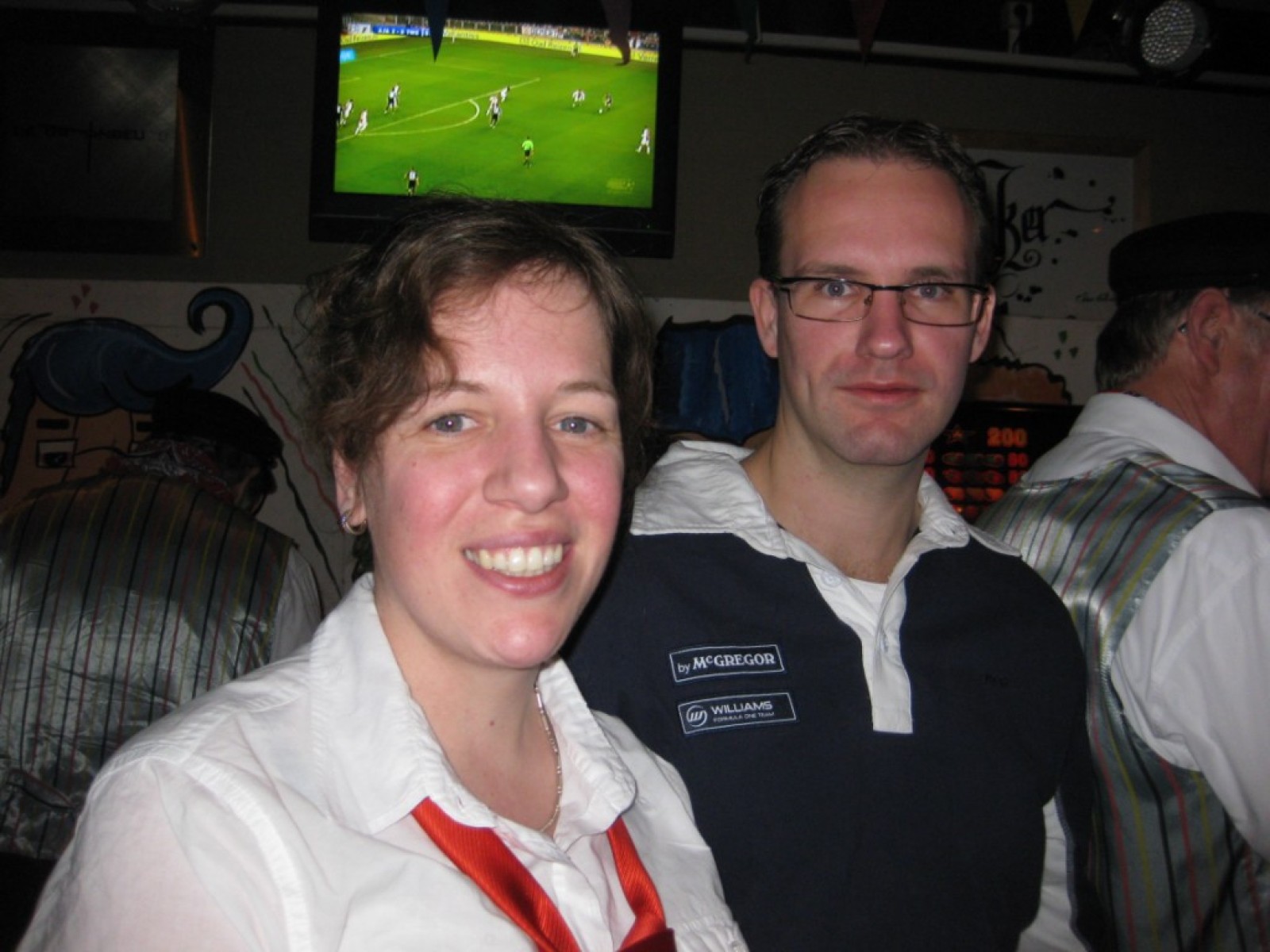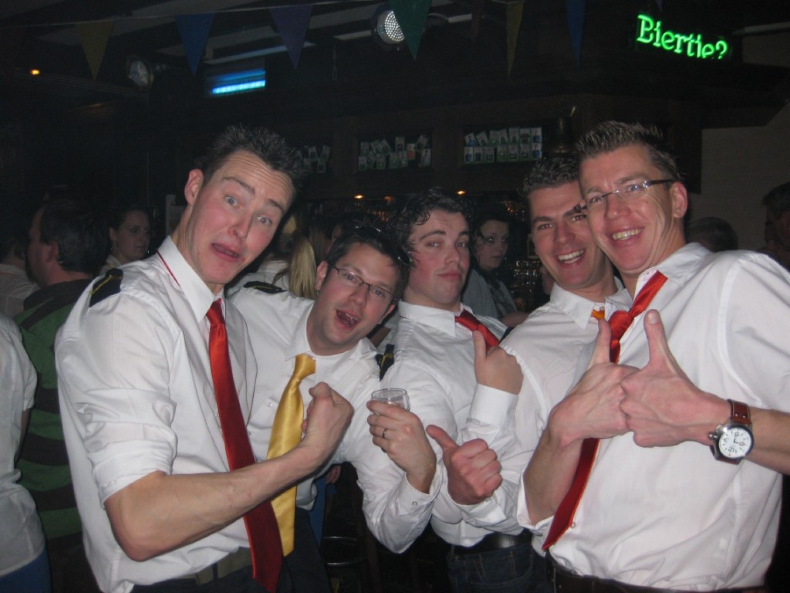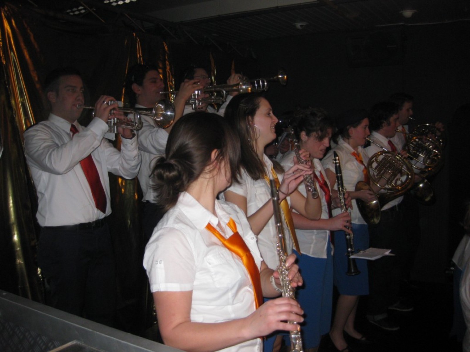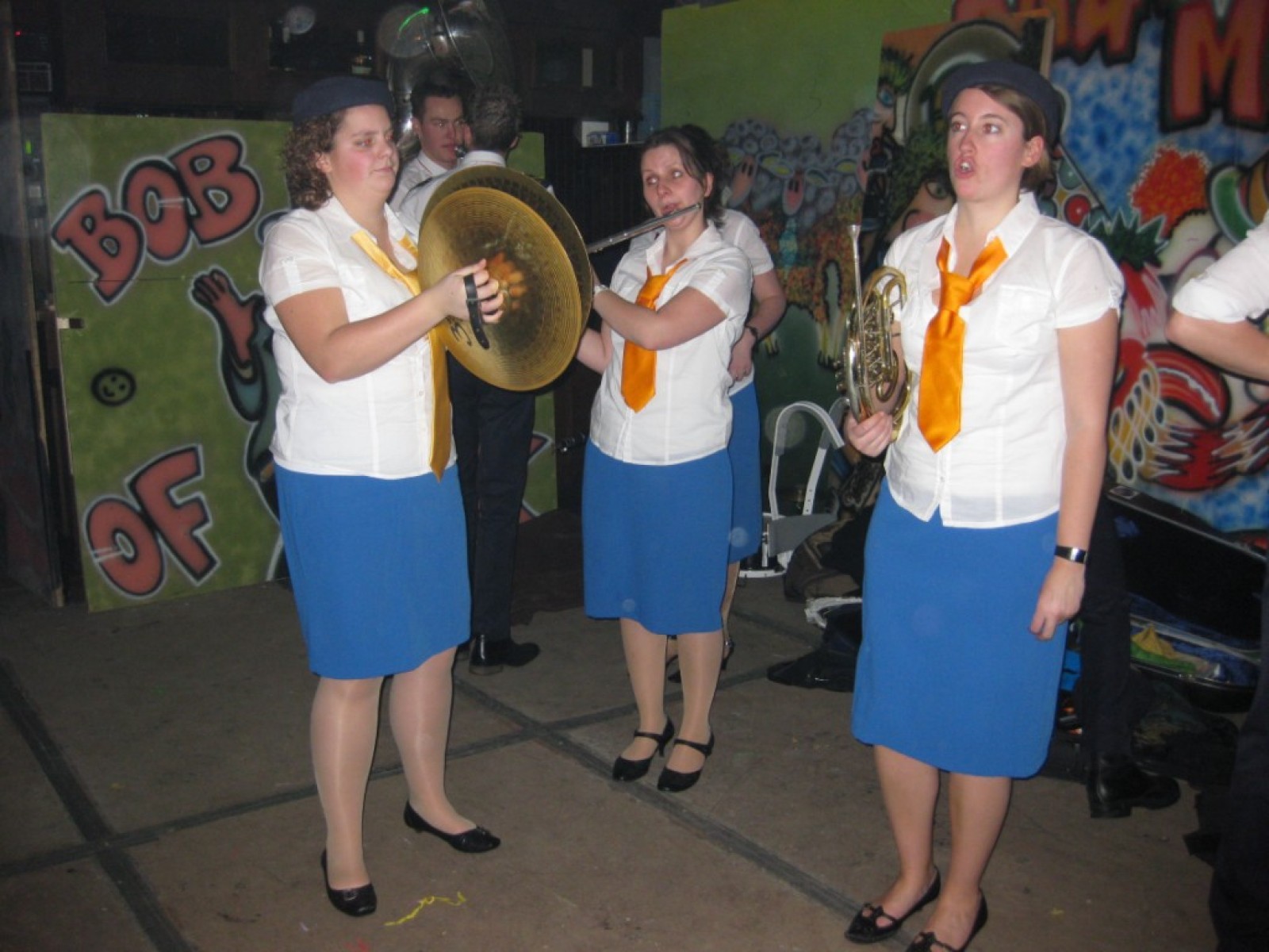 Op de jaarvergadering kwam ter sprake dat we eigenlijk de vliegshow weer eens moesten doen. Zo gezegd, zo gedaan. De kleding hebben we anderhalf jaar niet meer aangehad, maar er was er maar eentje bij die niet meer in zijn broek paste. Mooie vraag voor het fanclubblad wie! We moesten ons optreden heel even rekken omdat Evelyn en Lisette nog onderweg waren vanwege werk en een concert met Volharding, maar toen vlogen we over het podium. Erg leuk om weer eens te spelen.